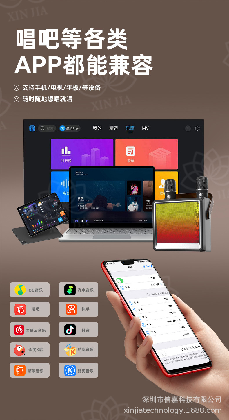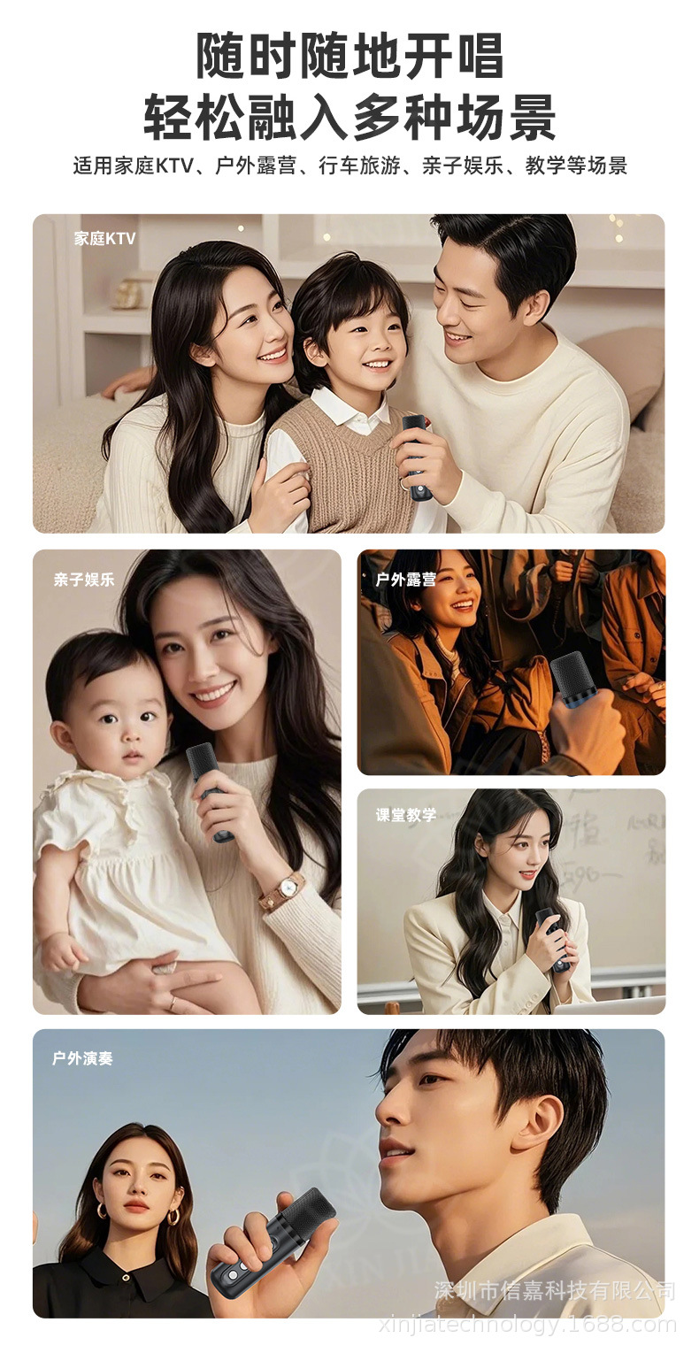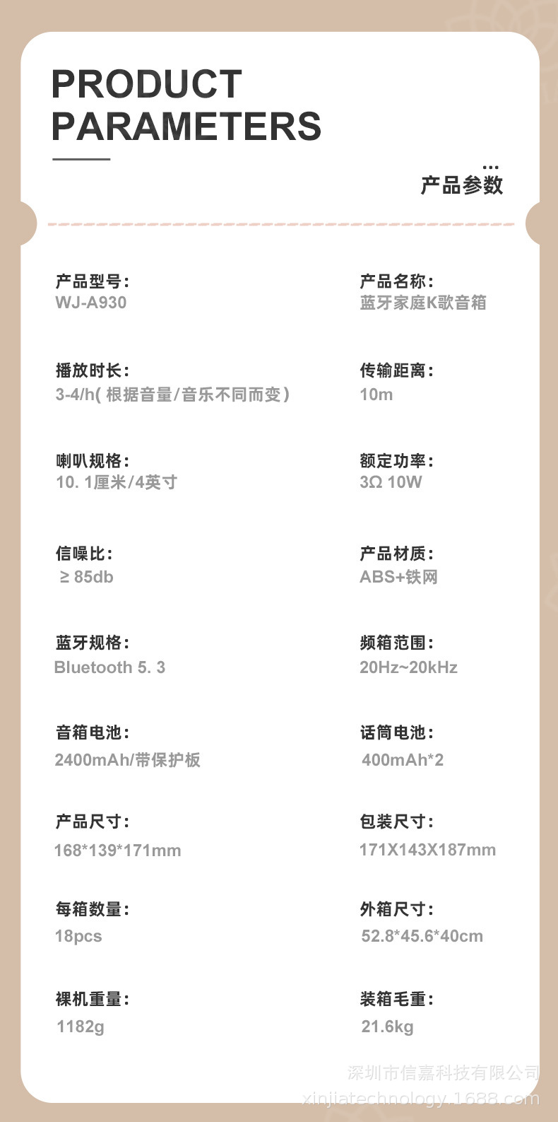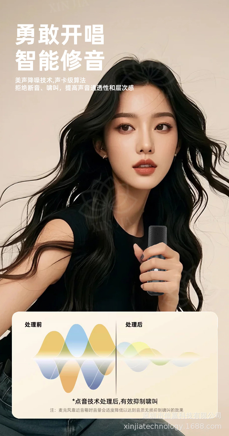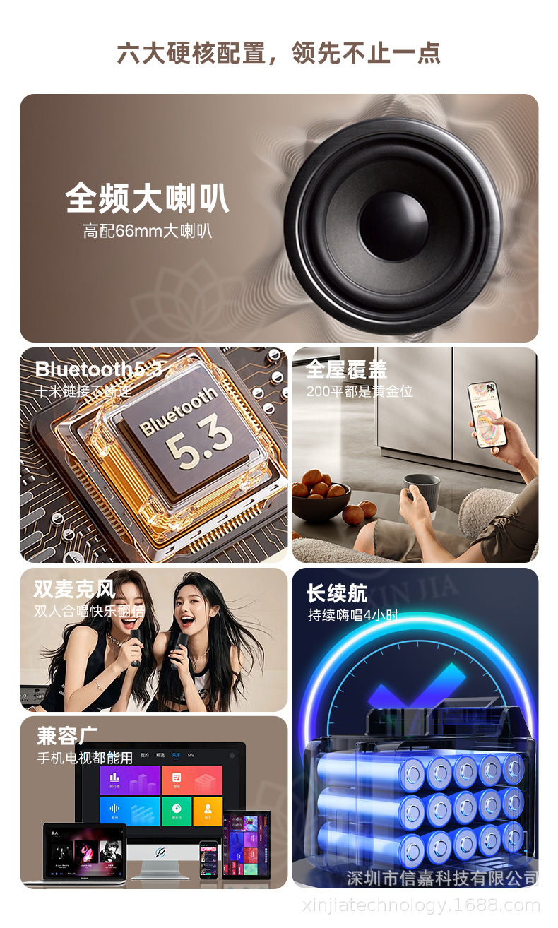 产品功能: 蓝牙、TF卡、 USB 、AUX 、 K歌、变音、魔音、消原音