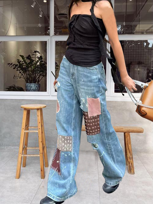 유럽과 미국의 복고풍 디자인 패치워크 청바지 여성용 봄, 가을 새로운 스타일 핫 소녀 워시드 페인트 찢어진 바닥 길이 바지스토어 가기