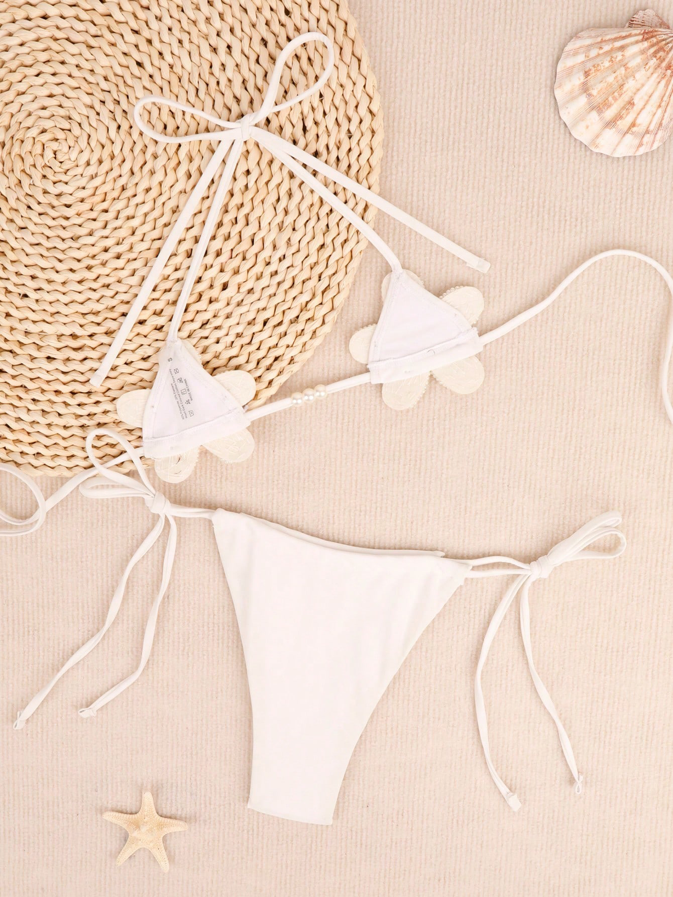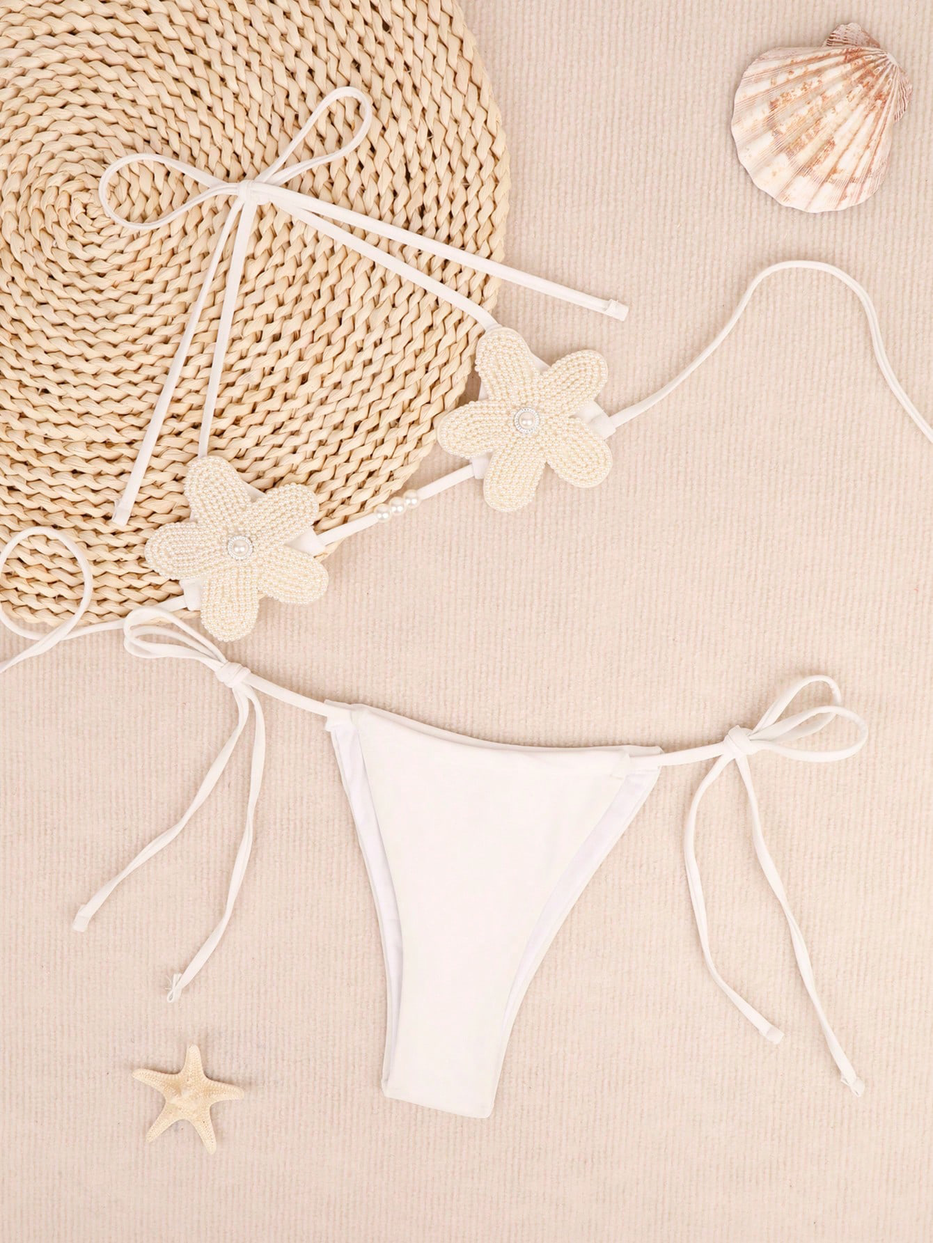 유럽과 미국의 국경 간 입체 꽃 귀여운 소녀 스플릿 수영복 세트 홀터넥 섹시한 스트랩 백리스 비키니