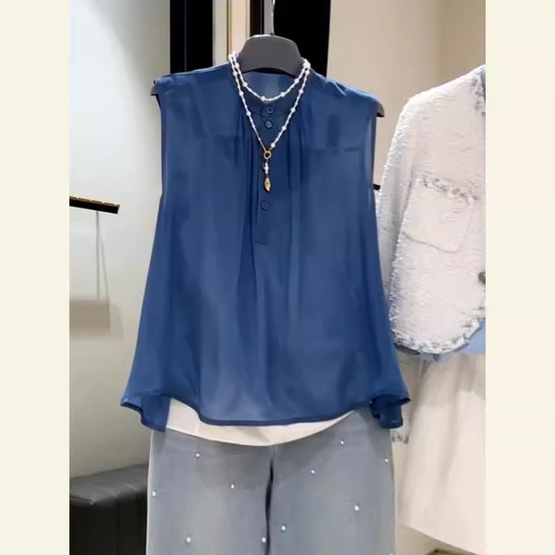 심플한 기질~착용감이 아주 좋아요~고급스럽고 가벼운 럭셔리 스타일의 탑, 독특하고 아름다운 블루 쉬폰 조끼 셔츠스토어 가기