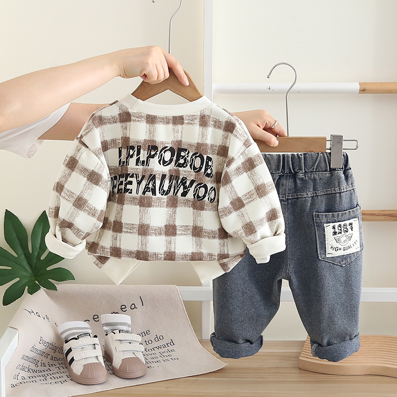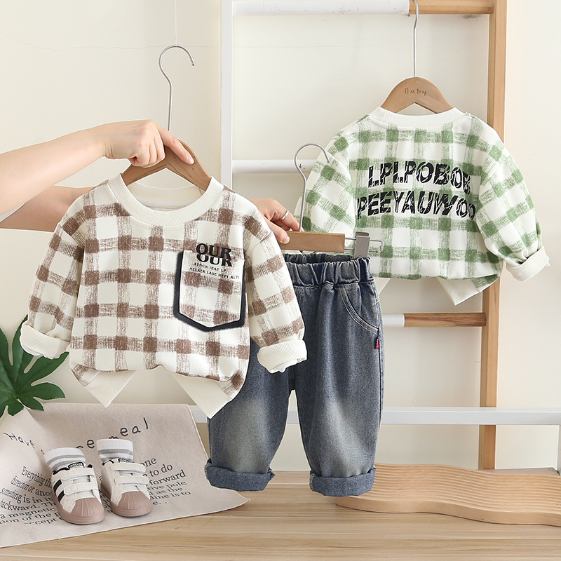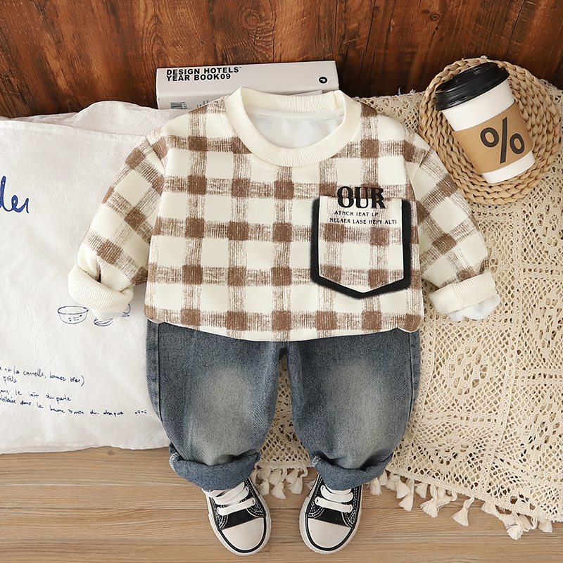2025 새로운 소년 코트 바지 격자 무늬 플러시 투피스 키트 소스 공장 도매스토어 가기
