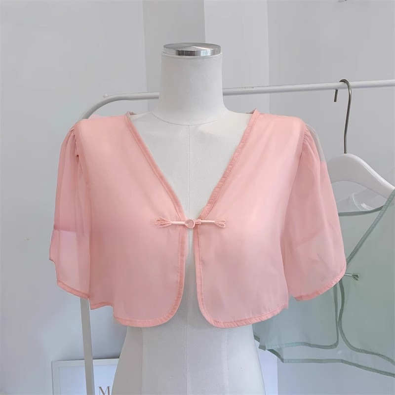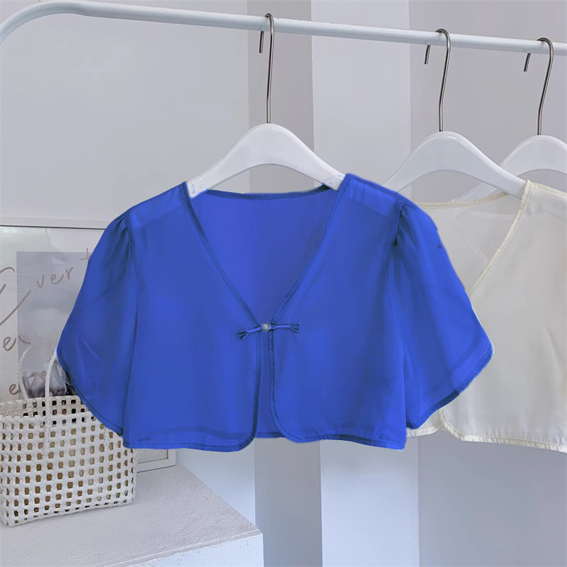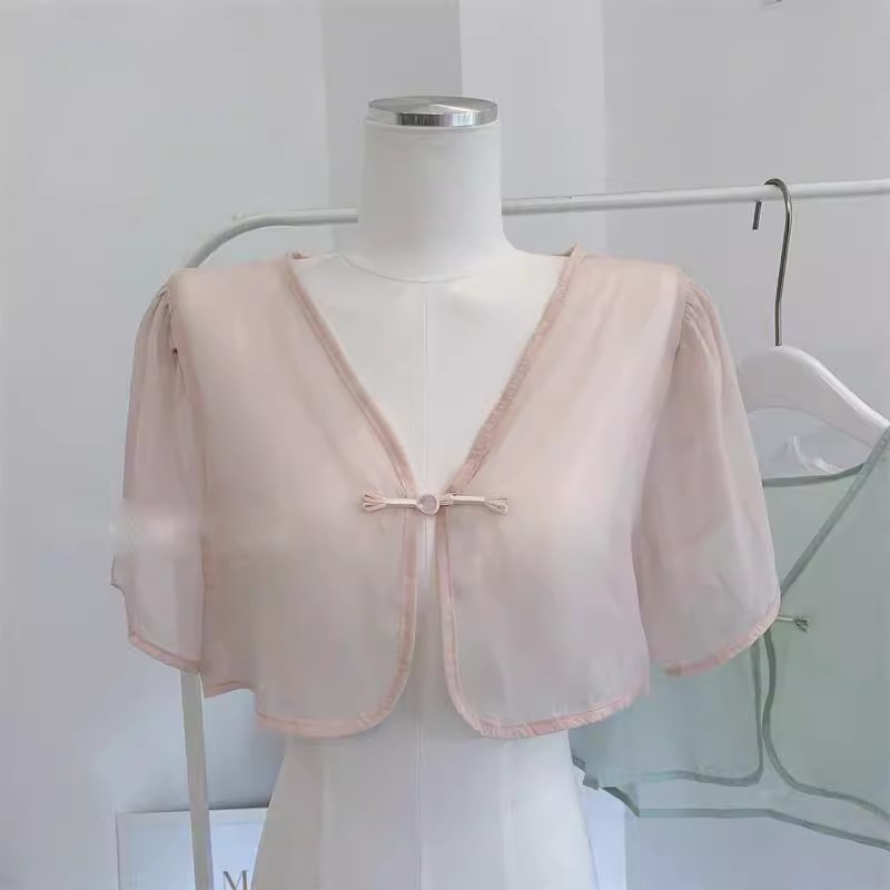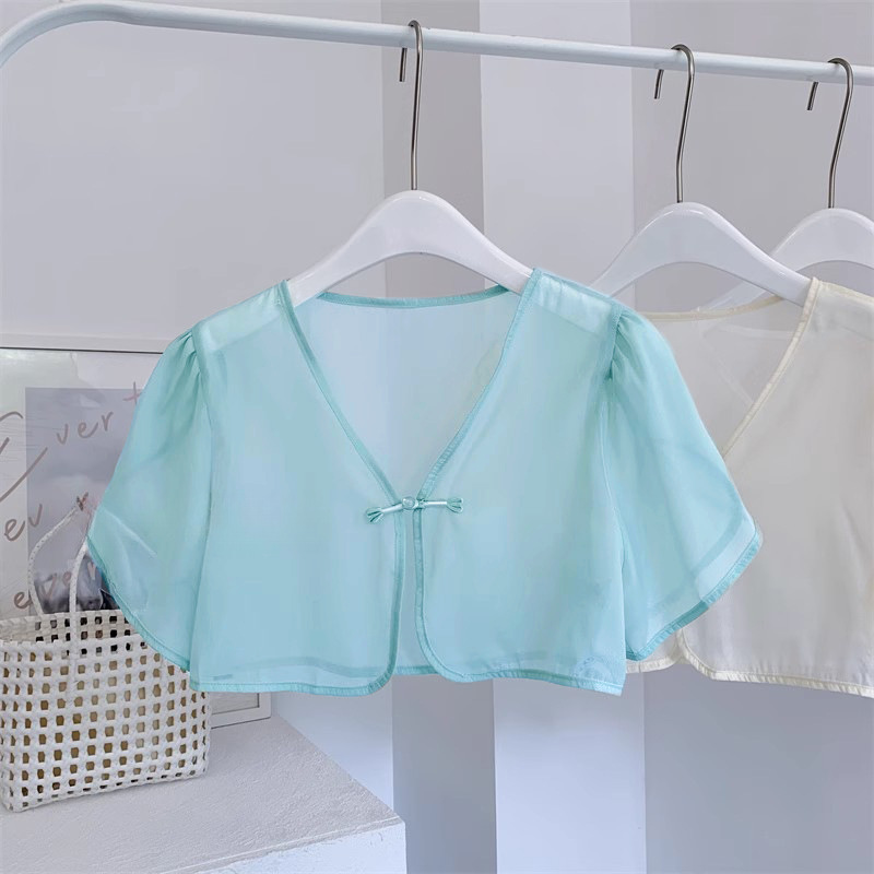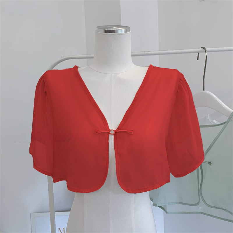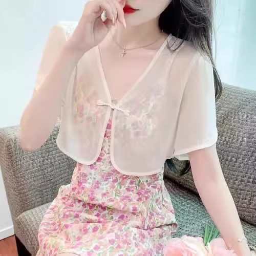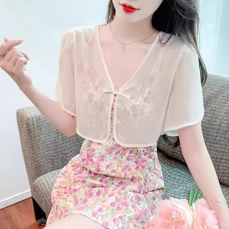 여성용 반팔 브이넥 숄, 얇은 스타일, 서스펜더 스커트, 양복 조끼 스타일, 여성용 짧은 버튼 시폰 여름 상의스토어 가기