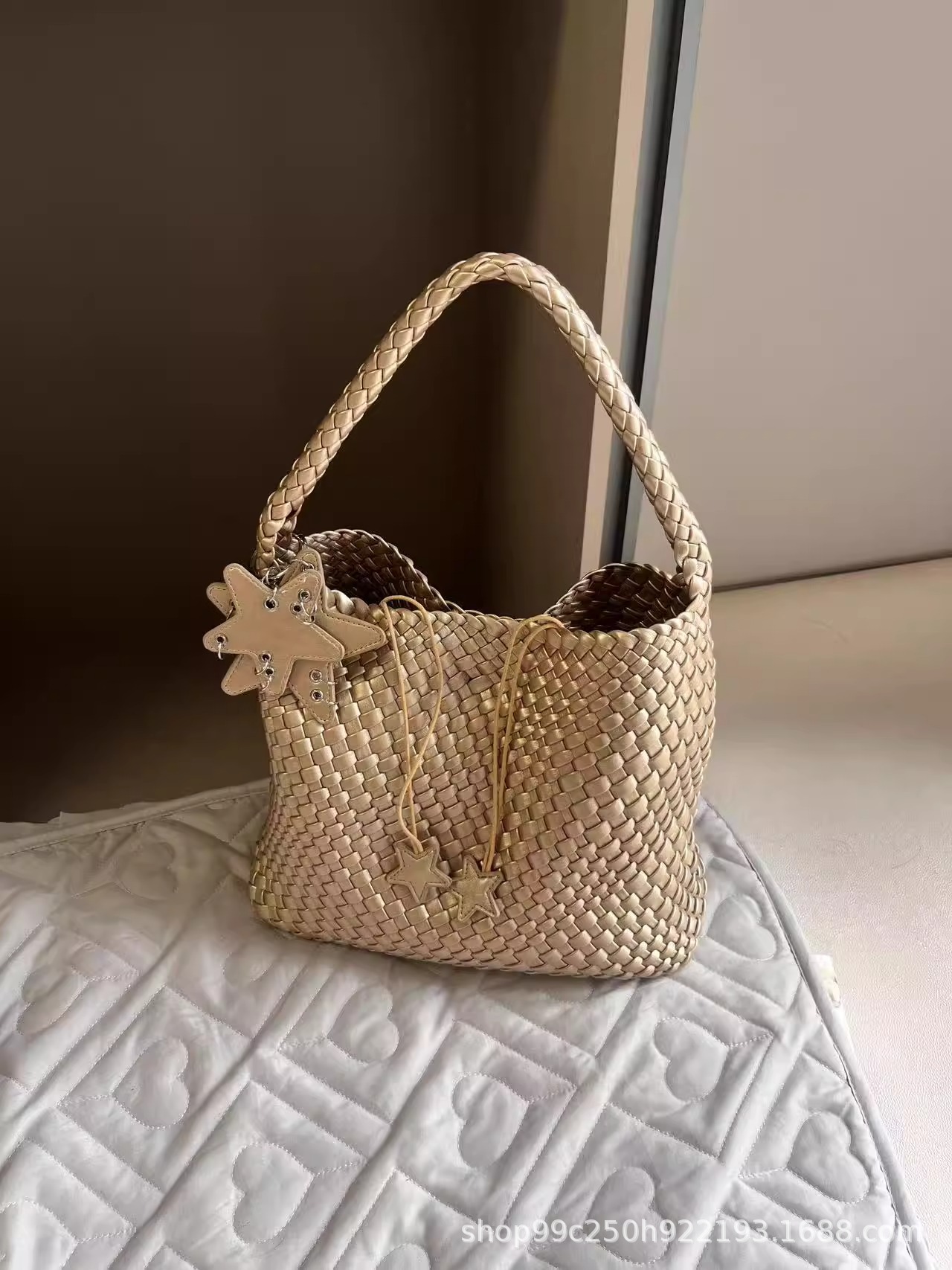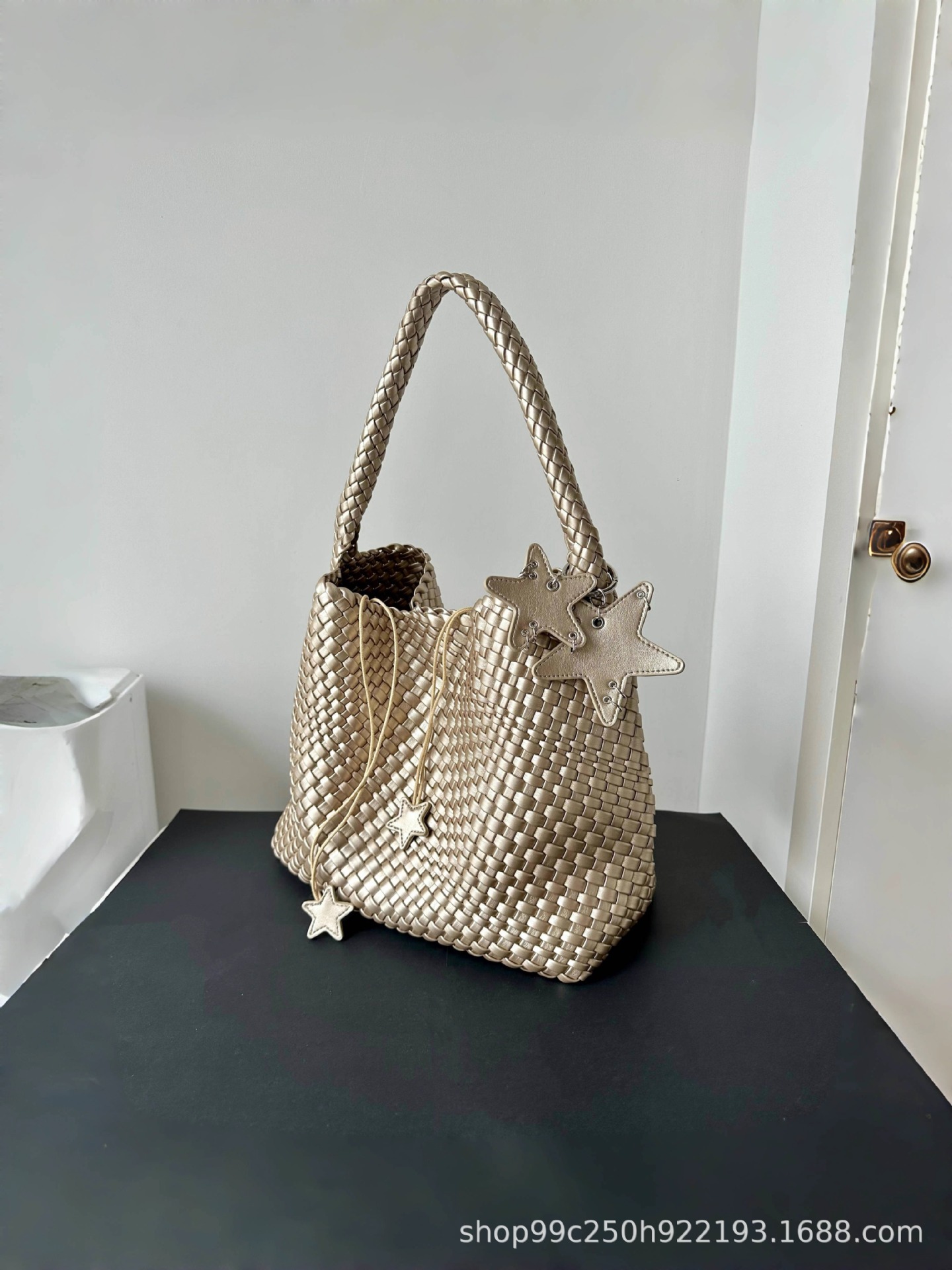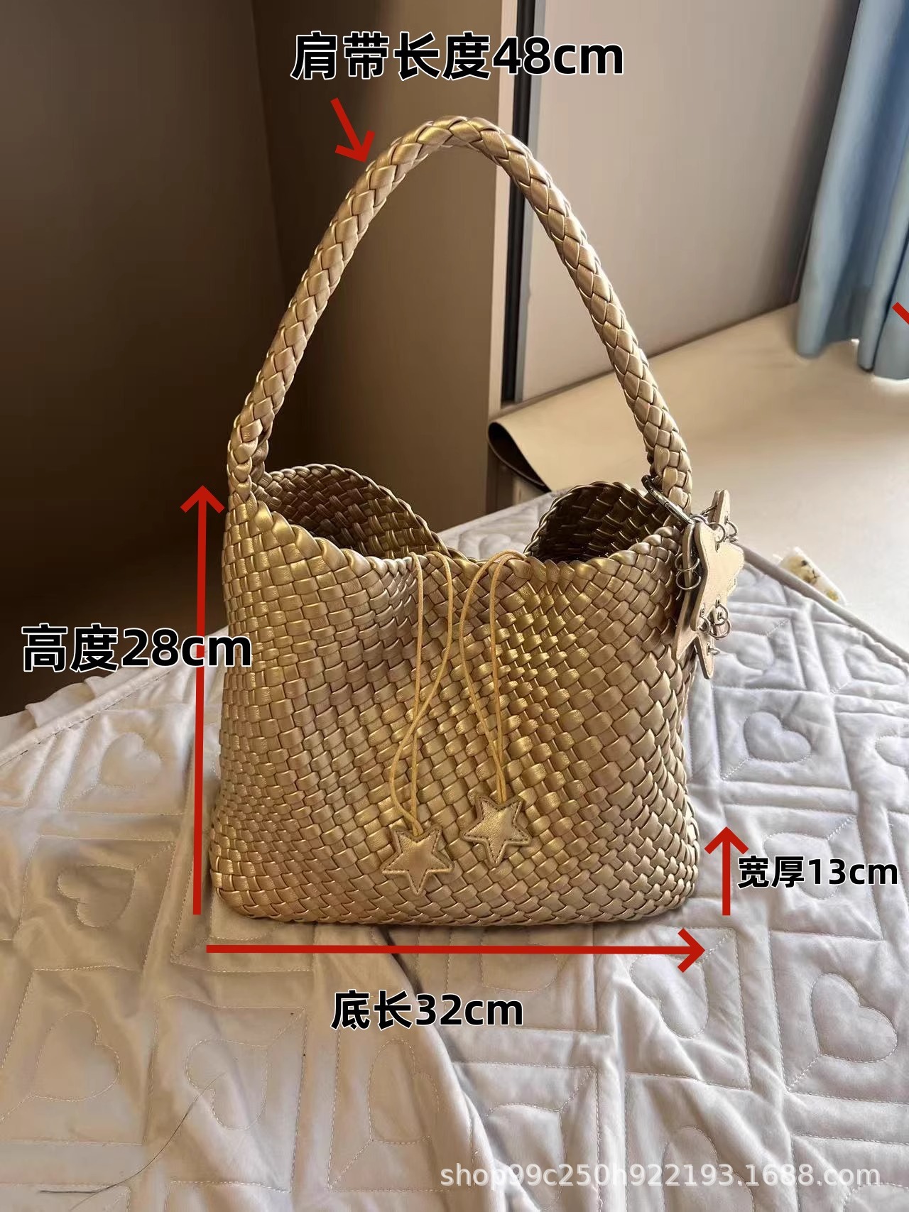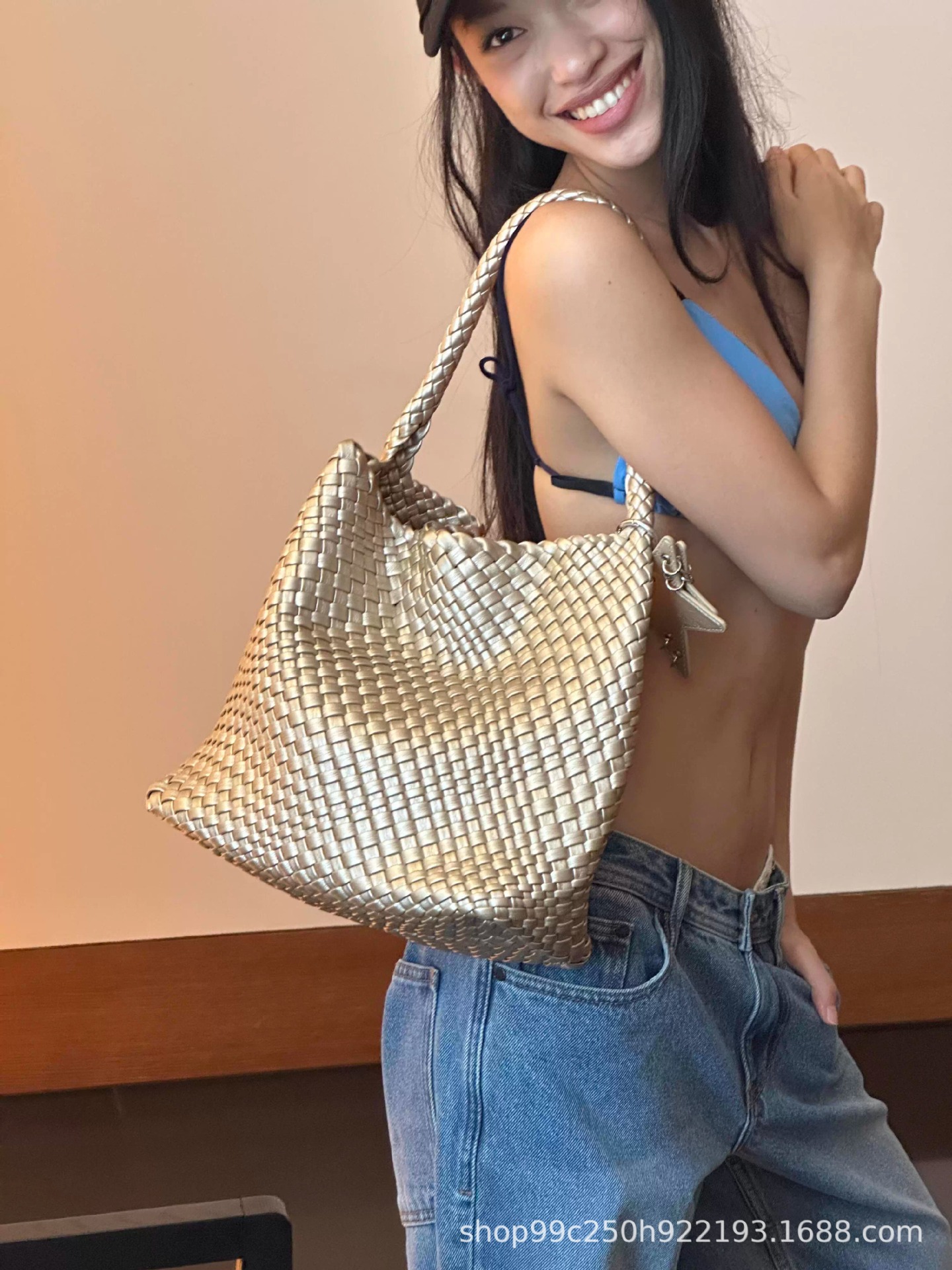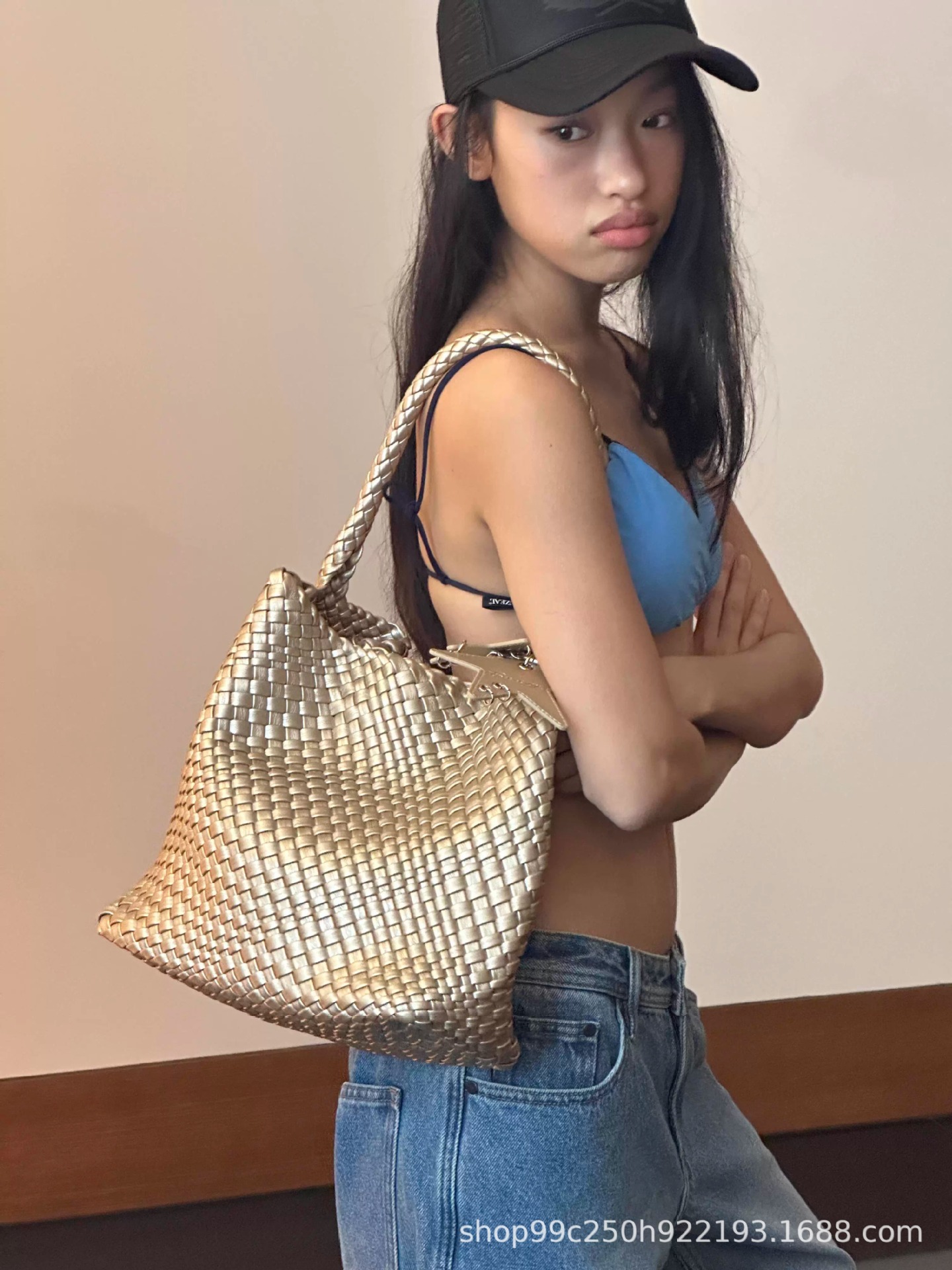 Guan Guan의 같은 스타일 중간 샴페인 컬러 손으로 짠 토트 백 소형 대용량 겨드랑이 싱글 숄더 쇼핑백