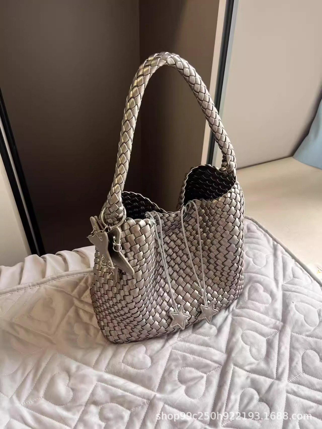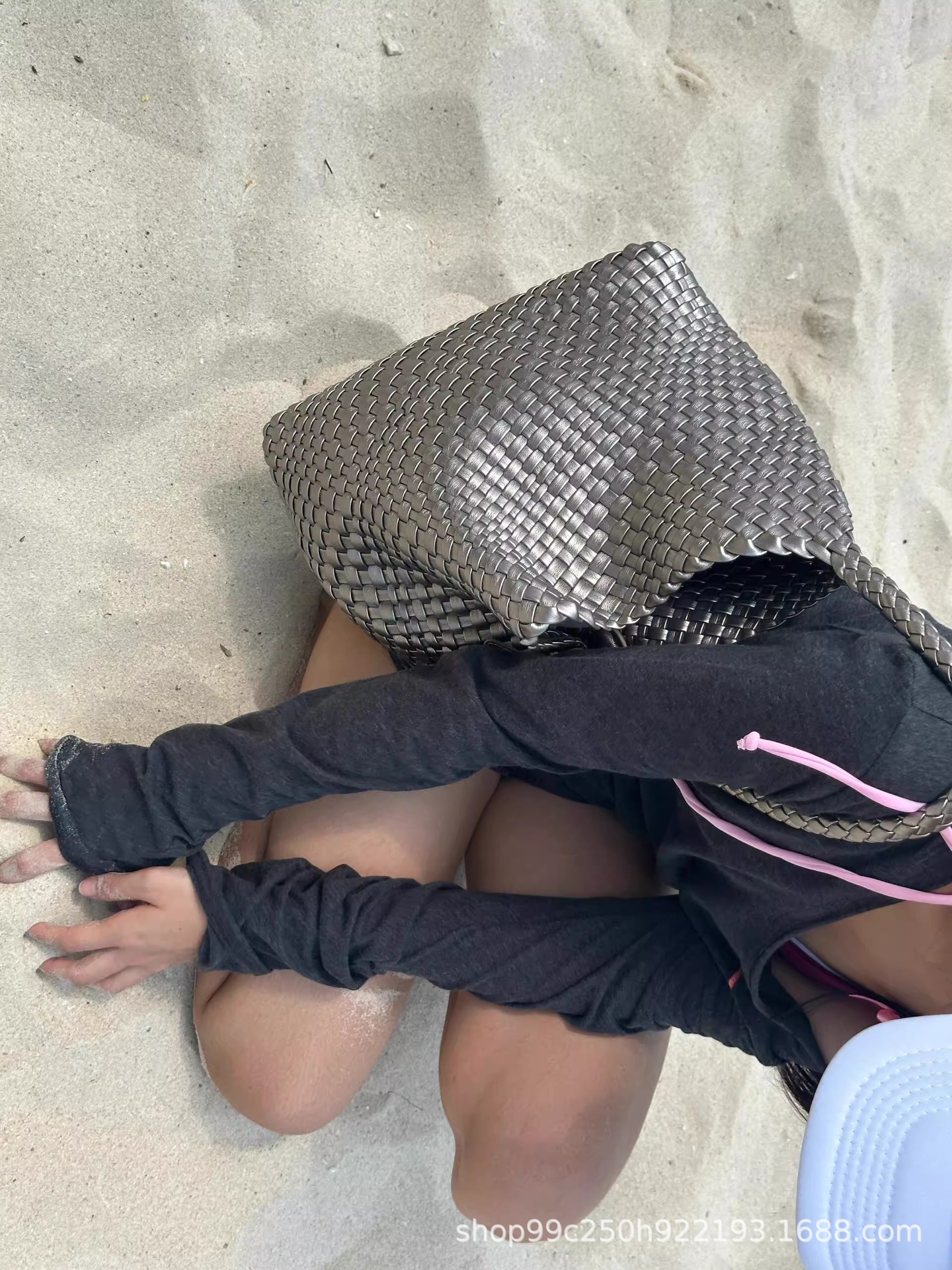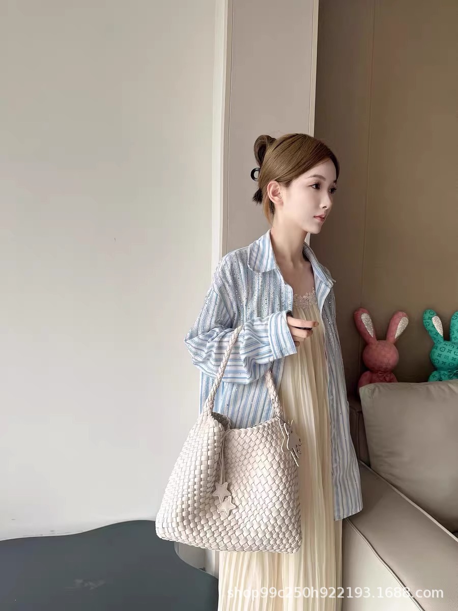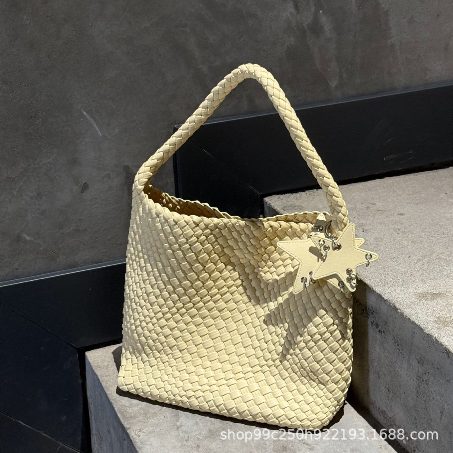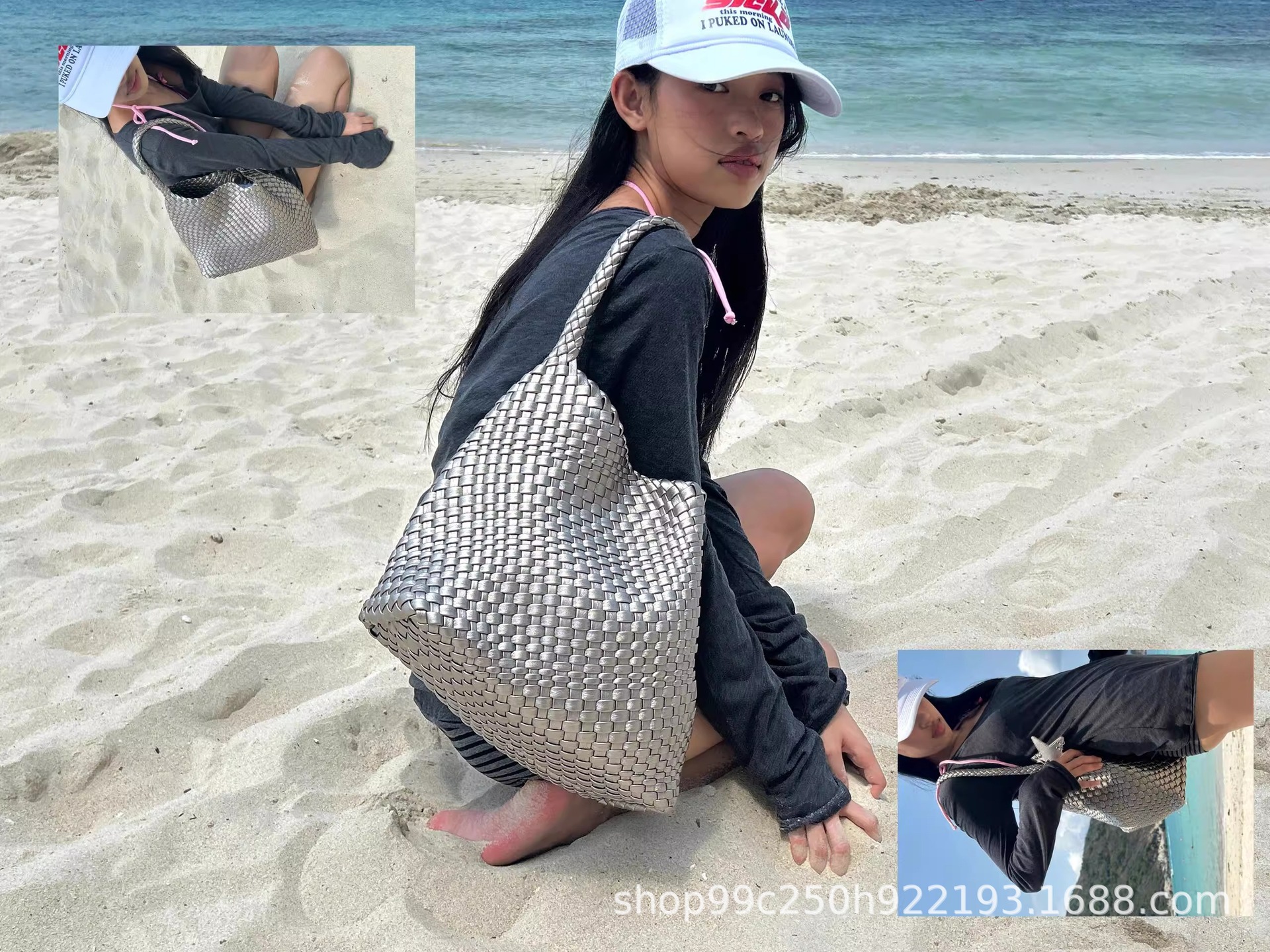 Guan Guan의 같은 스타일 중간 샴페인 컬러 손으로 짠 토트 백 소형 대용량 겨드랑이 싱글 숄더 쇼핑백