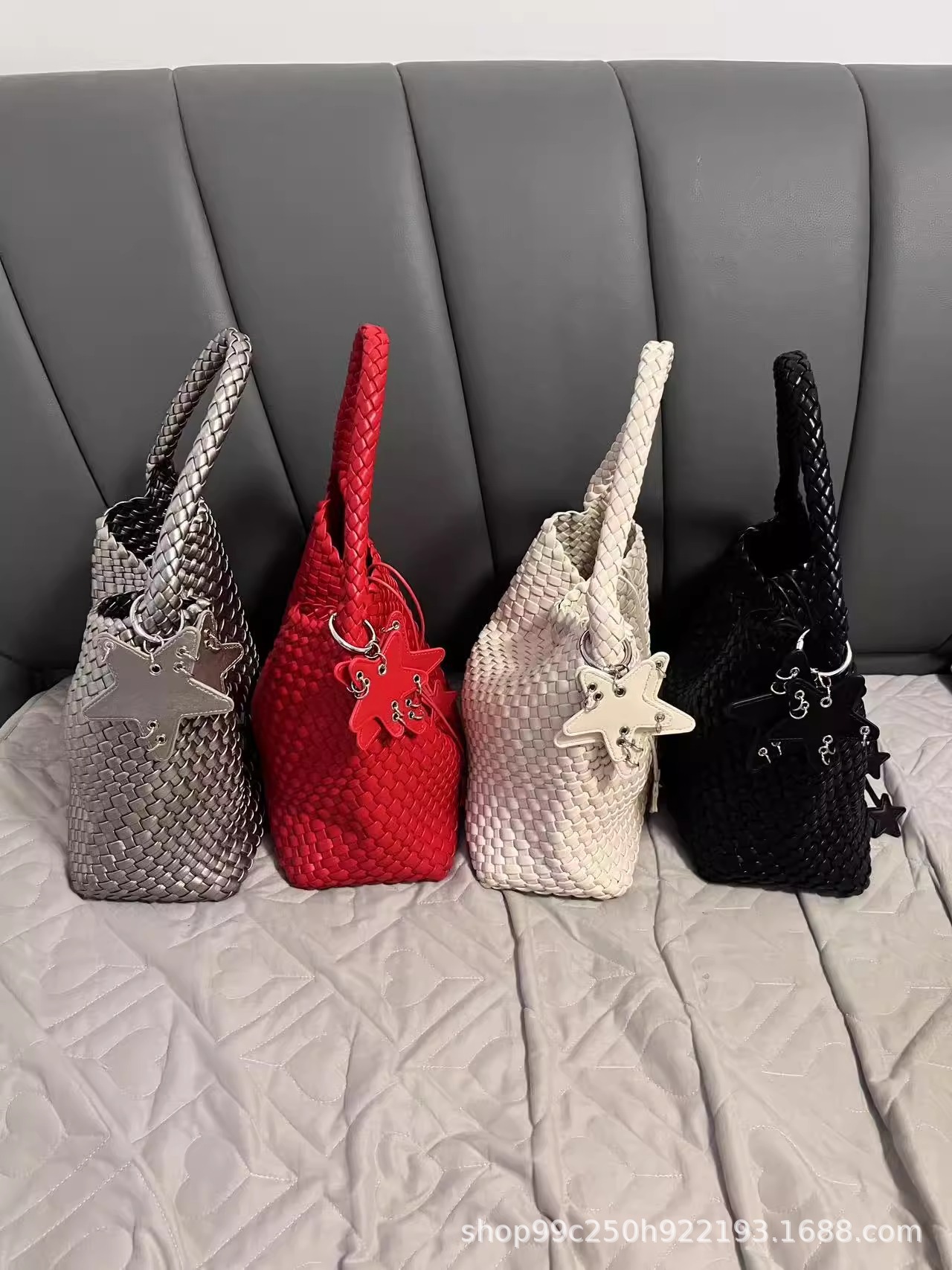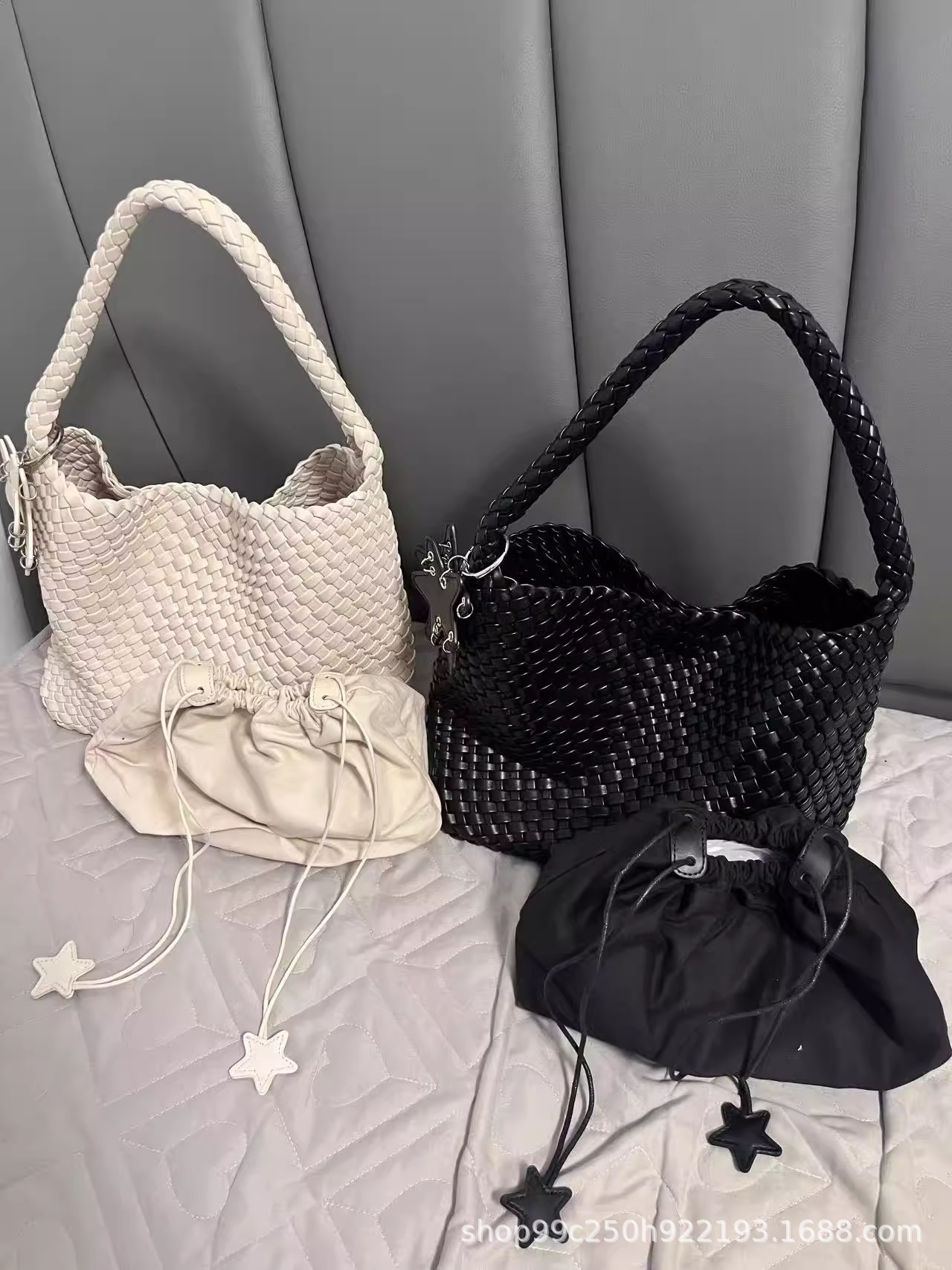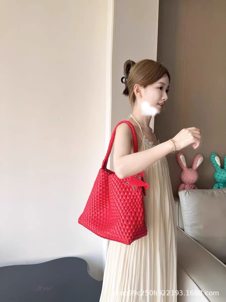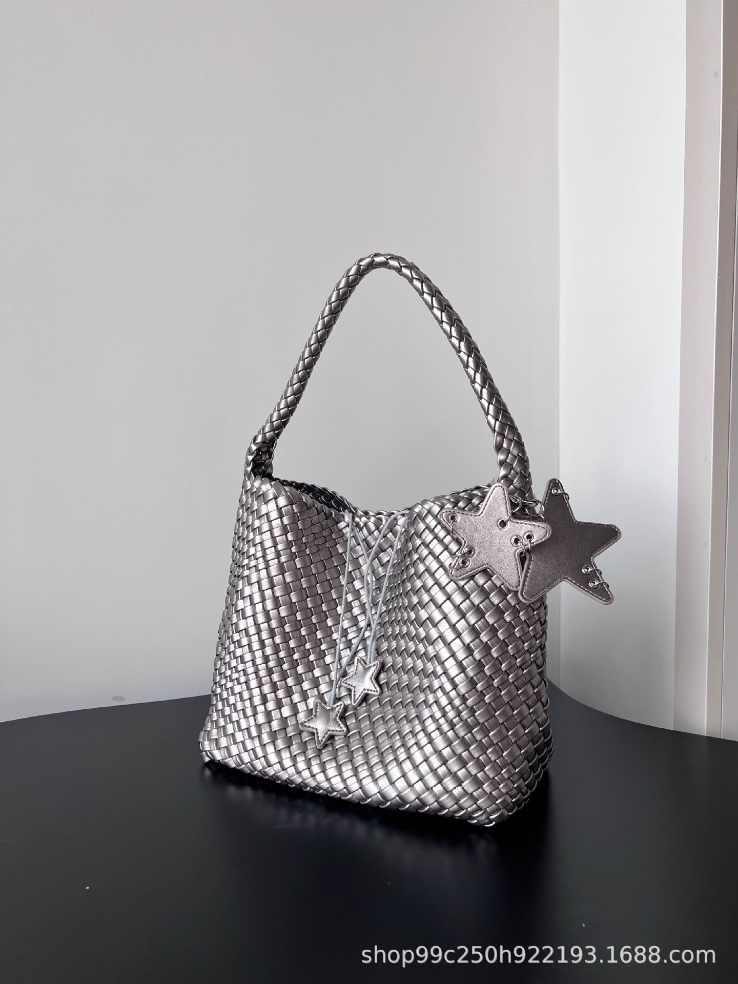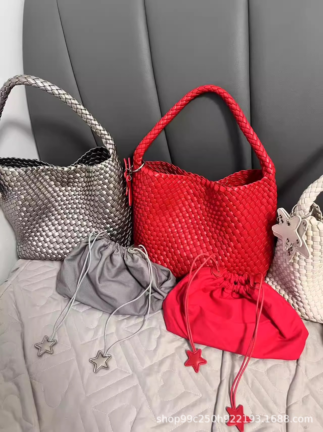 Guan Guan의 같은 스타일 중간 샴페인 컬러 손으로 짠 토트 백 소형 대용량 겨드랑이 싱글 숄더 쇼핑백