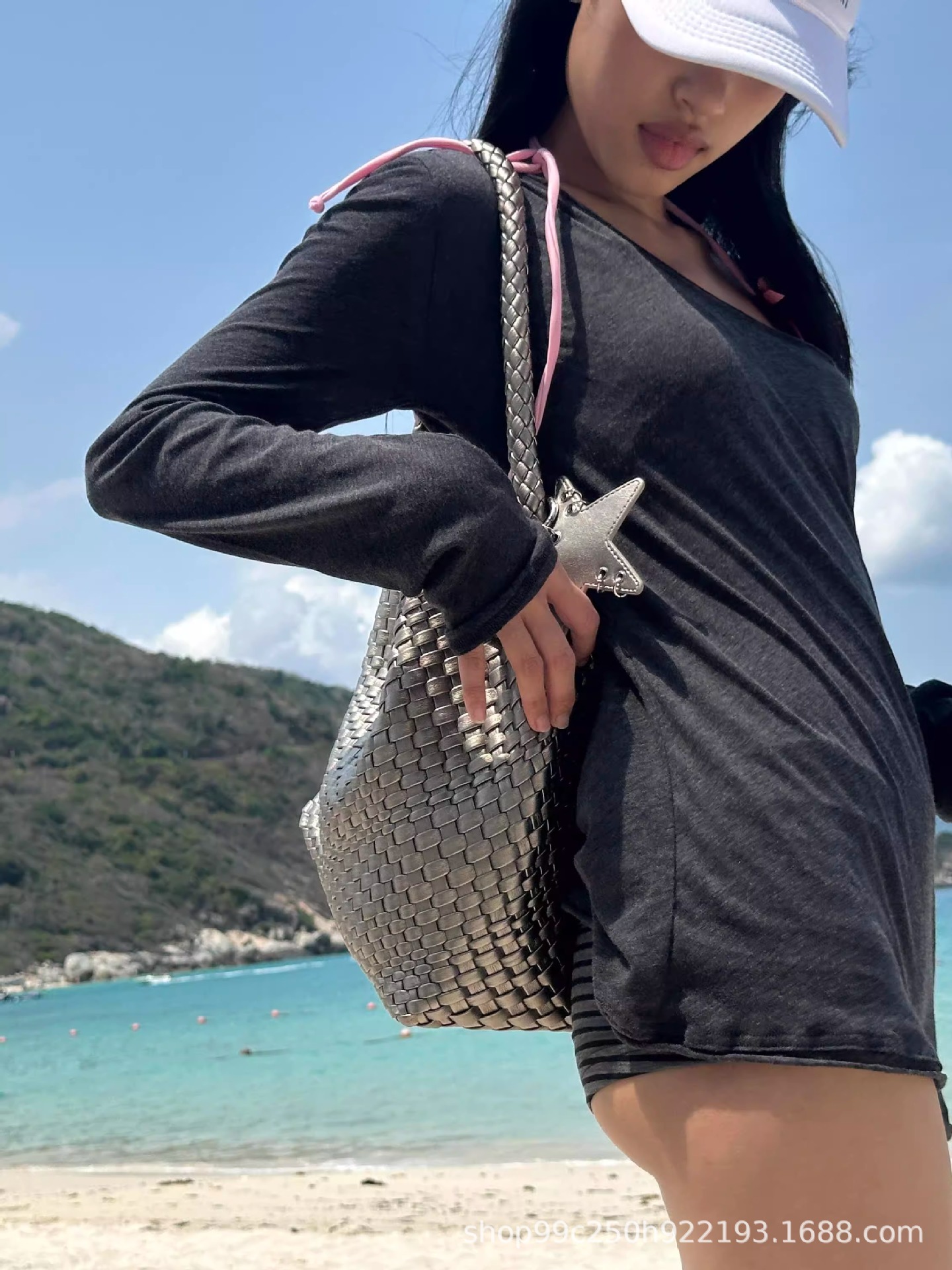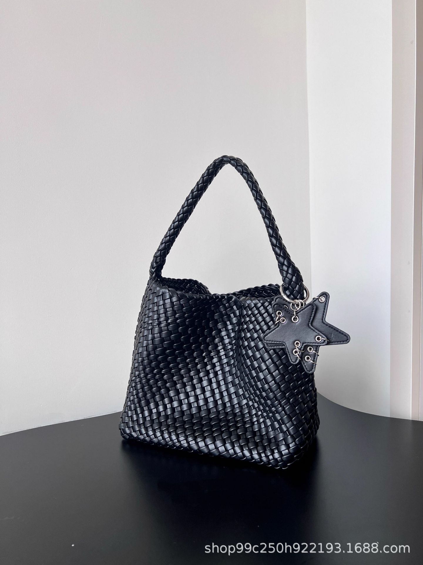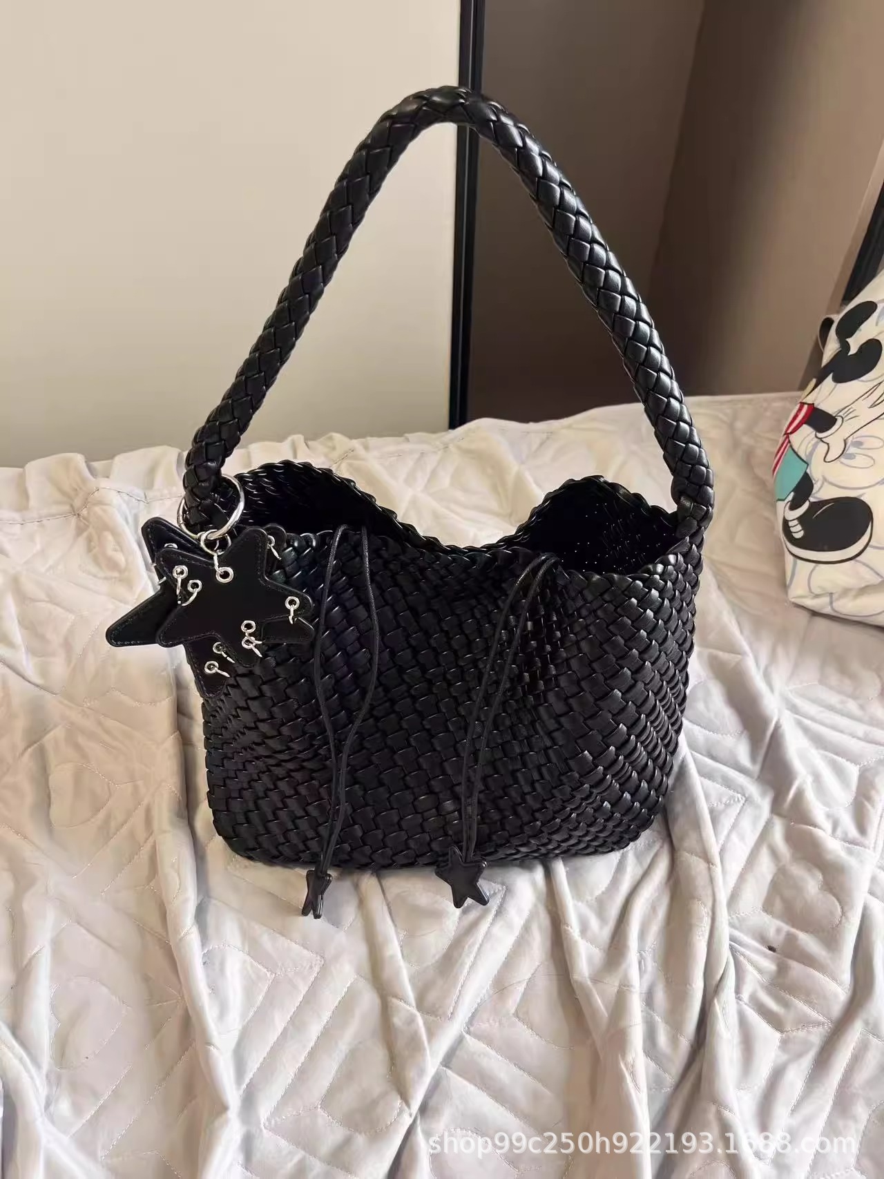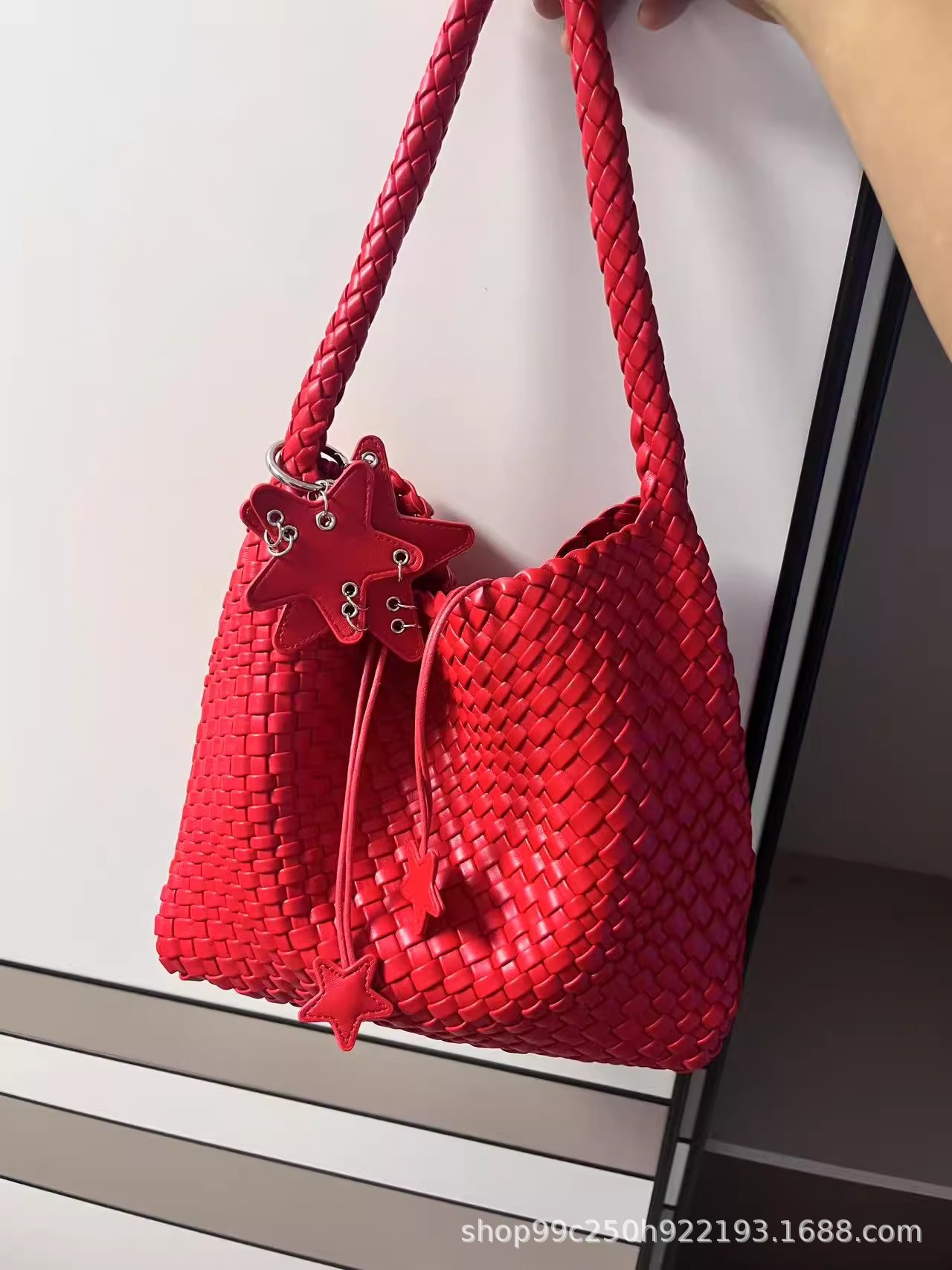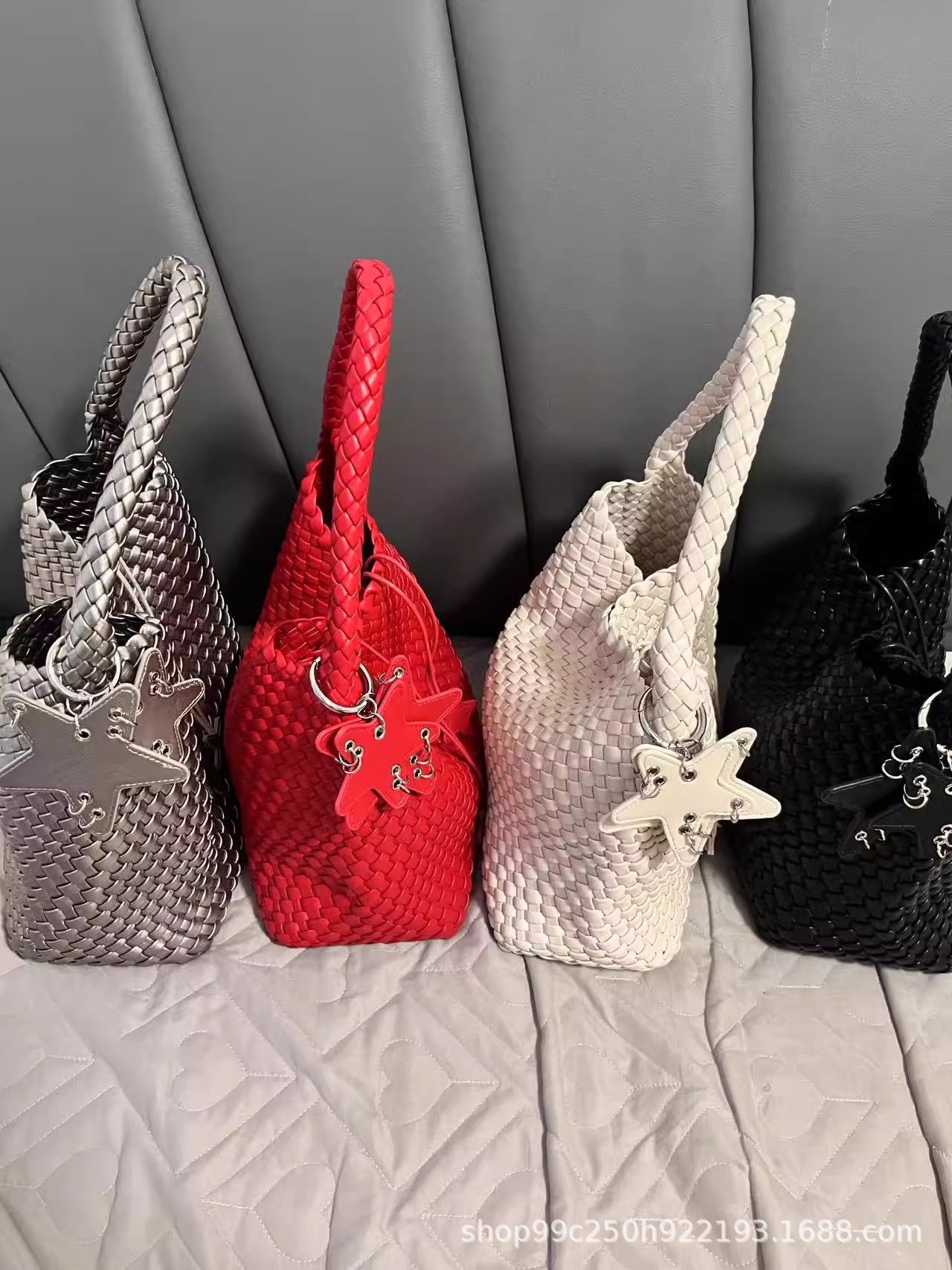 Guan Guan의 같은 스타일 중간 샴페인 컬러 손으로 짠 토트 백 소형 대용량 겨드랑이 싱글 숄더 쇼핑백