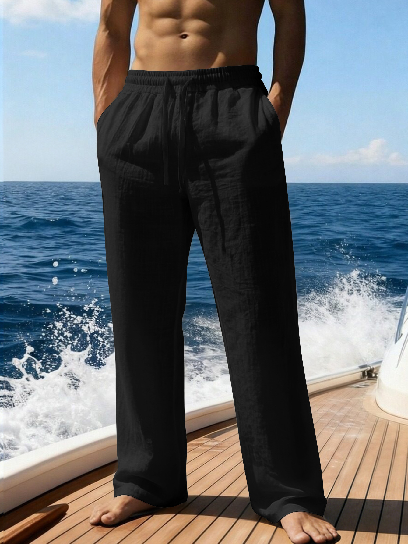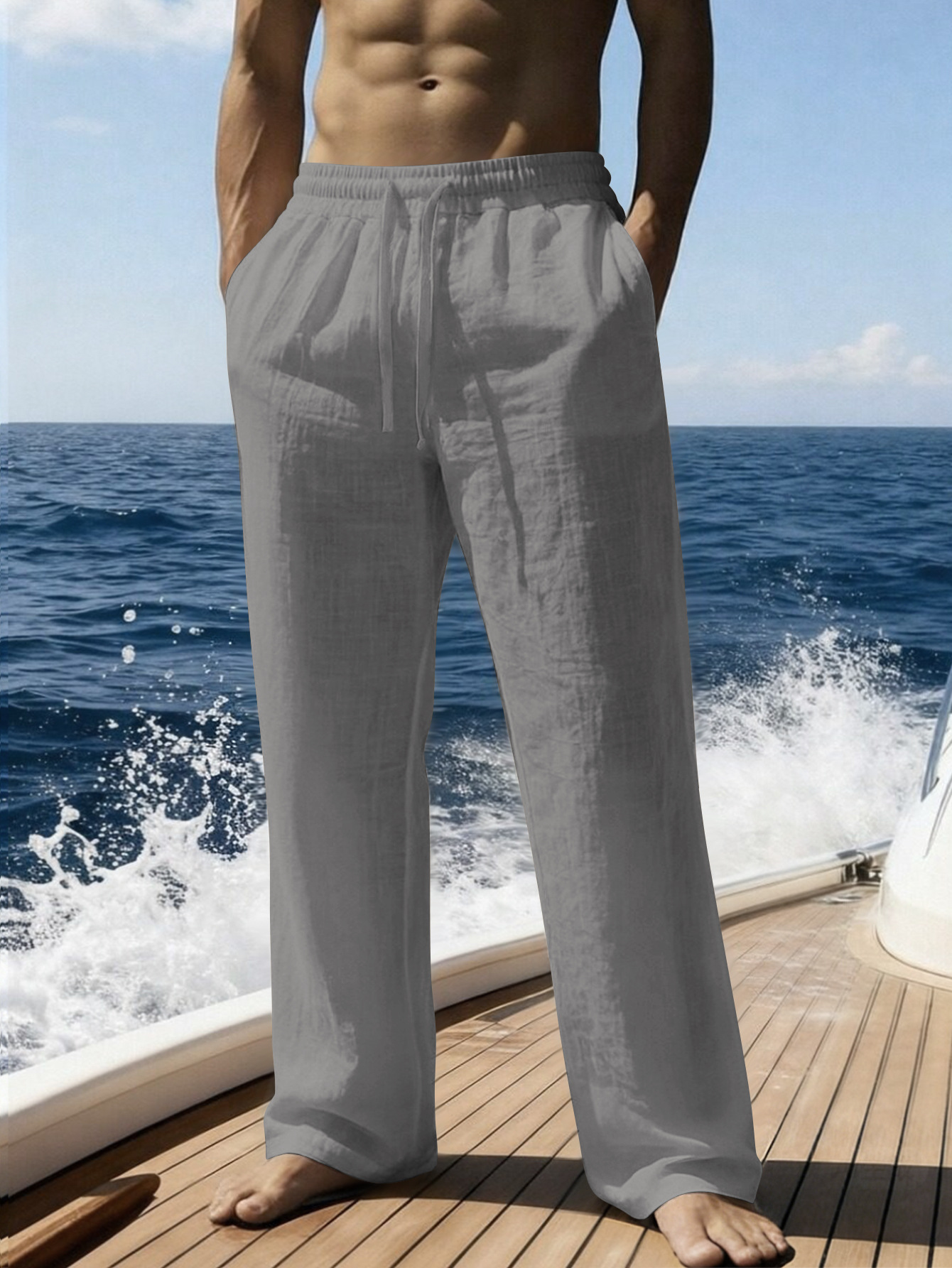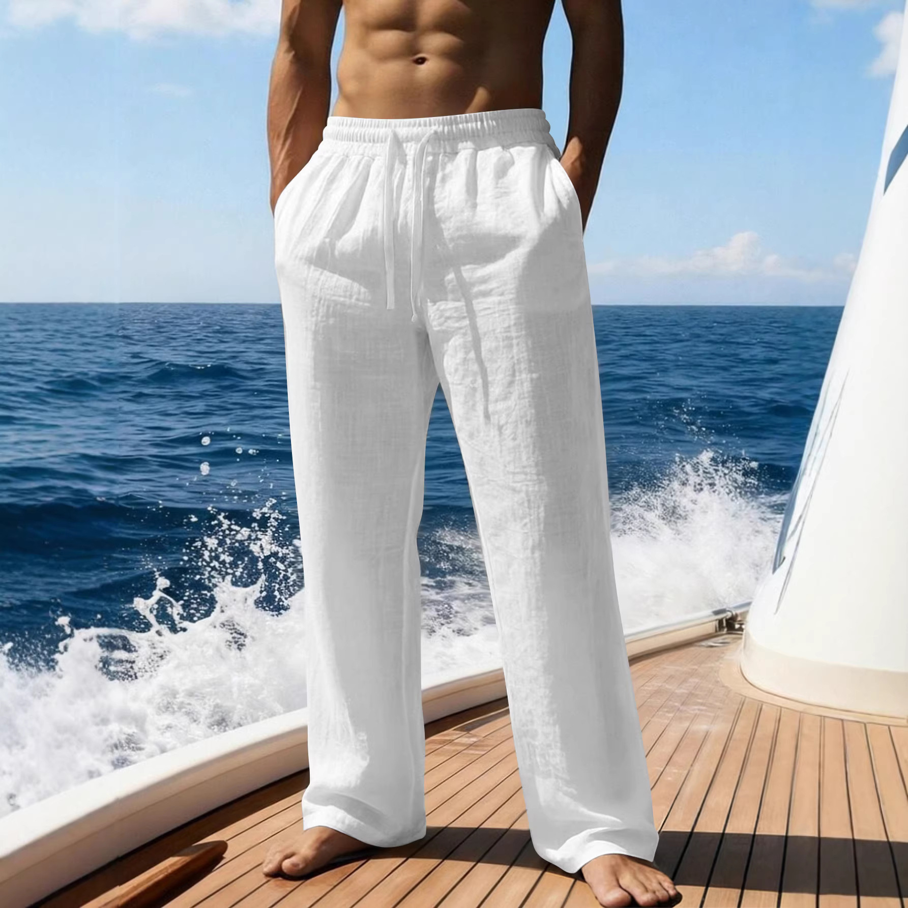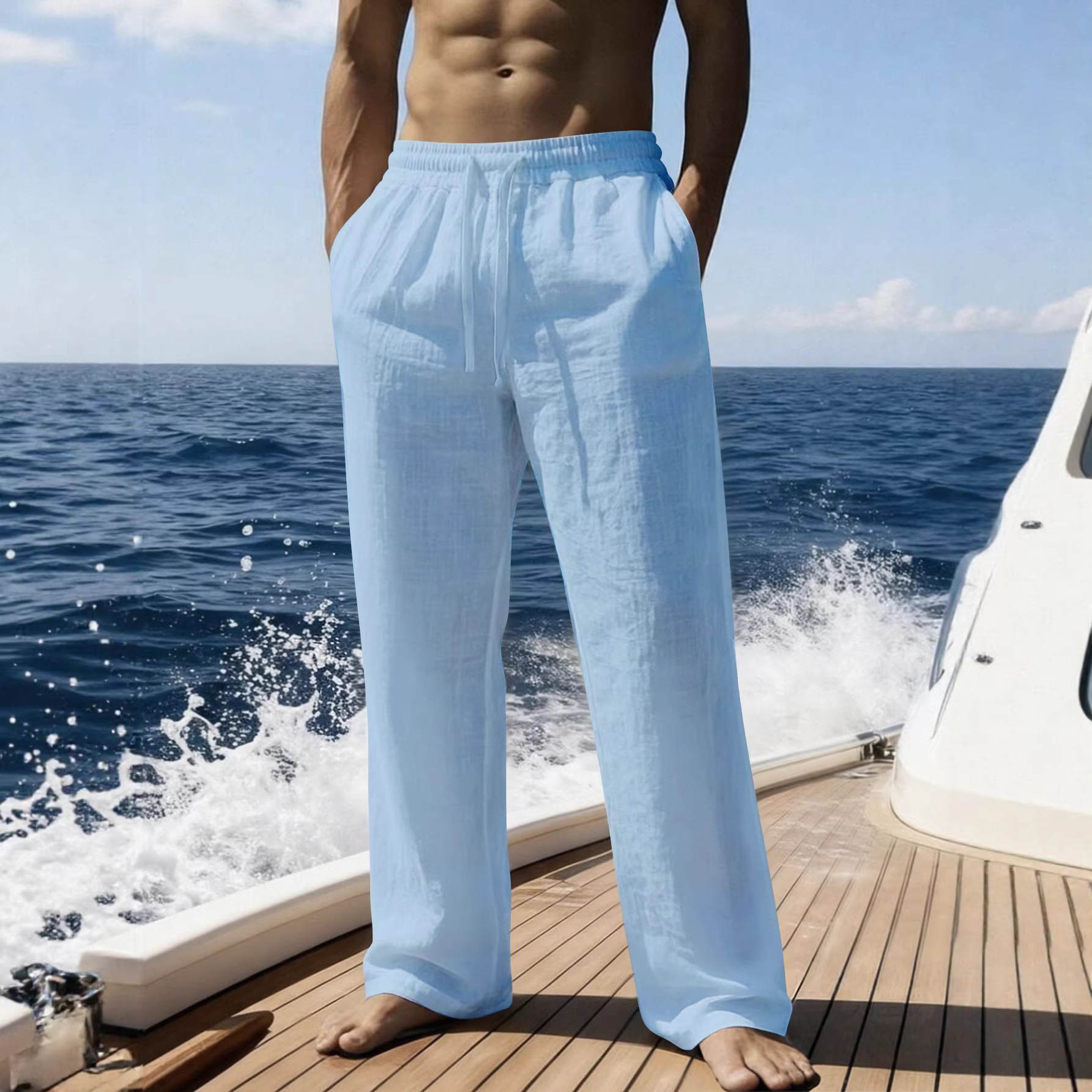 크로스보더 얇은 미국식 루즈핏 캐주얼 반팔 린넨 스트레이트 팬츠 휴가용 남성용 단색 다용도 비치 팬츠