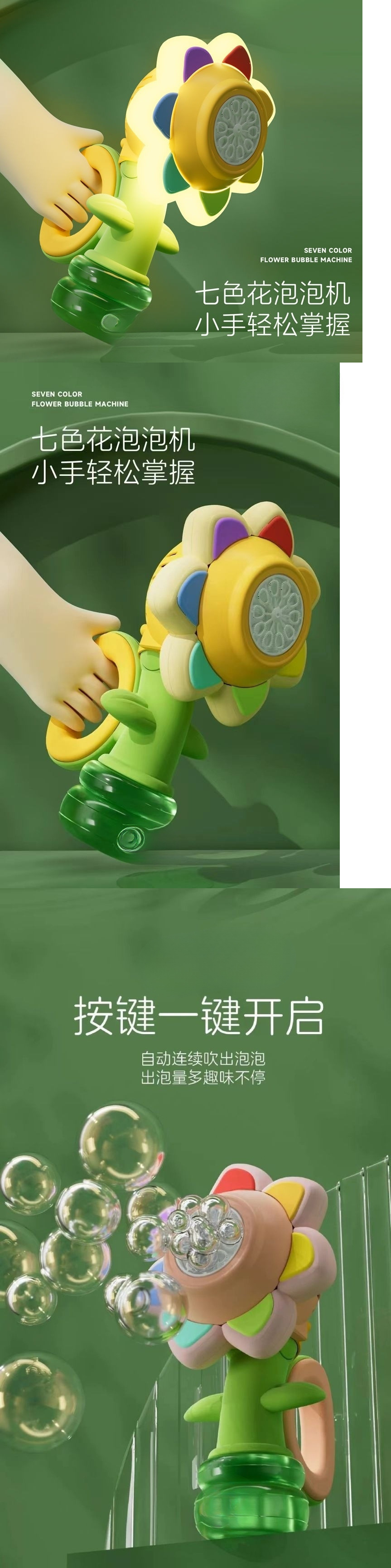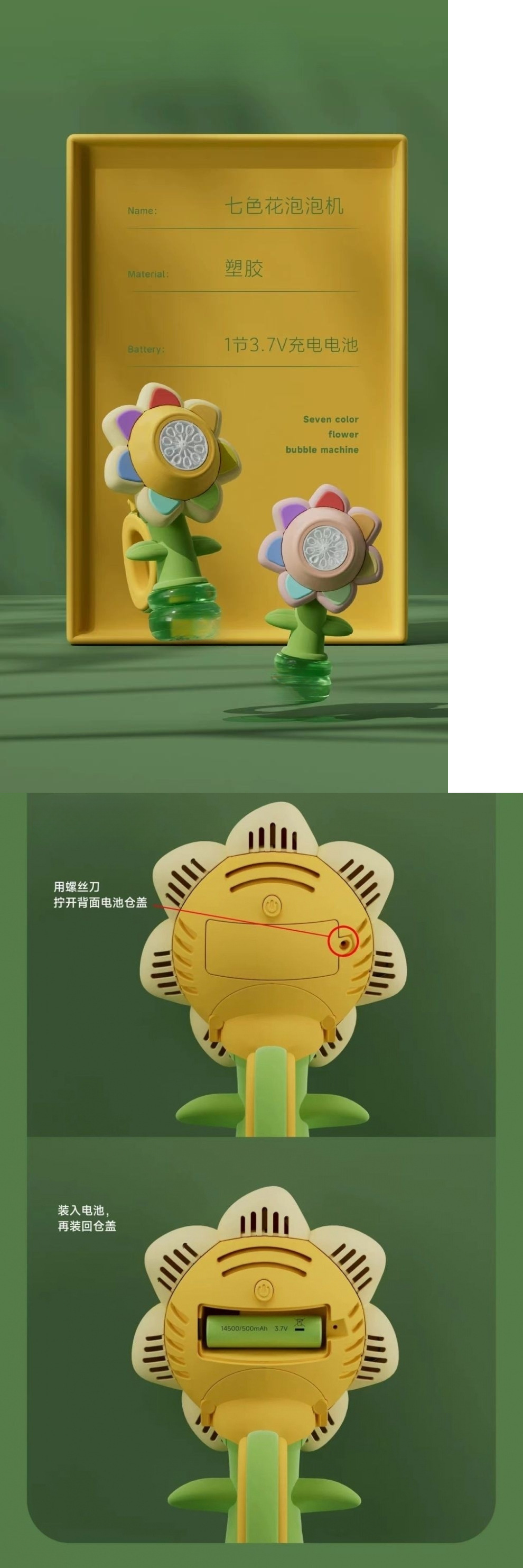 • 업그레이드된 3단 조절 [노란색 7색 꽃] - USB 충전 알루미늄 배터리 + 버블액 10팩