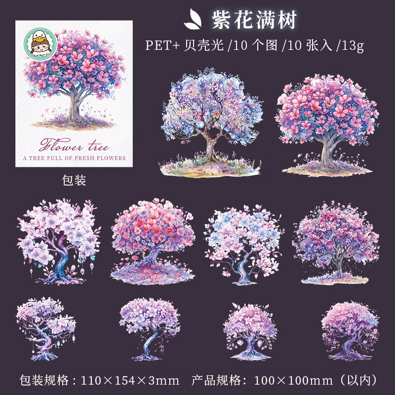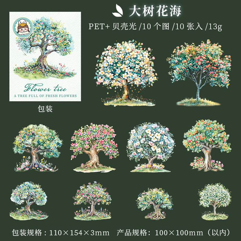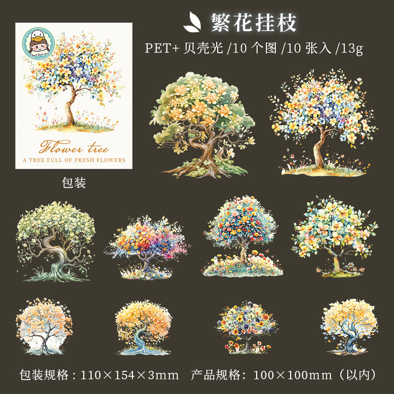 꽃이 피어있는 나무 시리즈 아름다운 하루 PET 스티커 팩 꽃나무 테마 핸드북 소재 10장 6가지 스타일