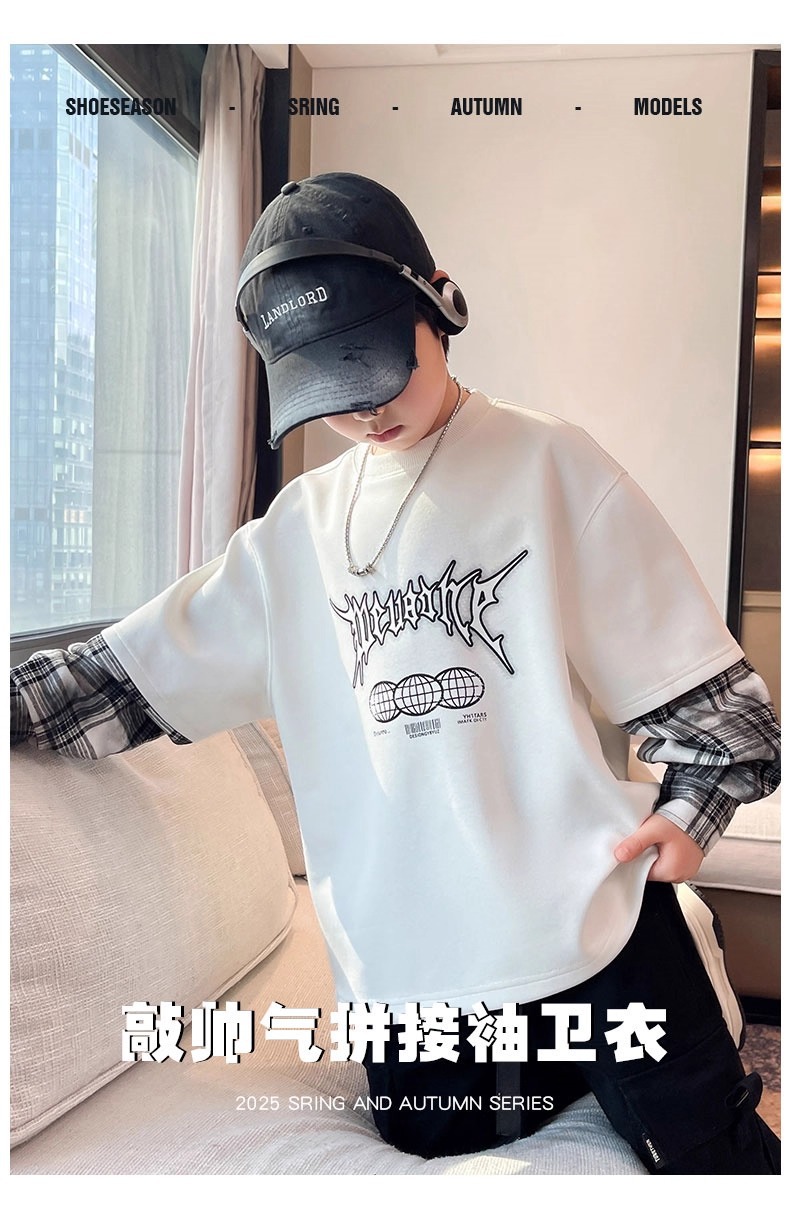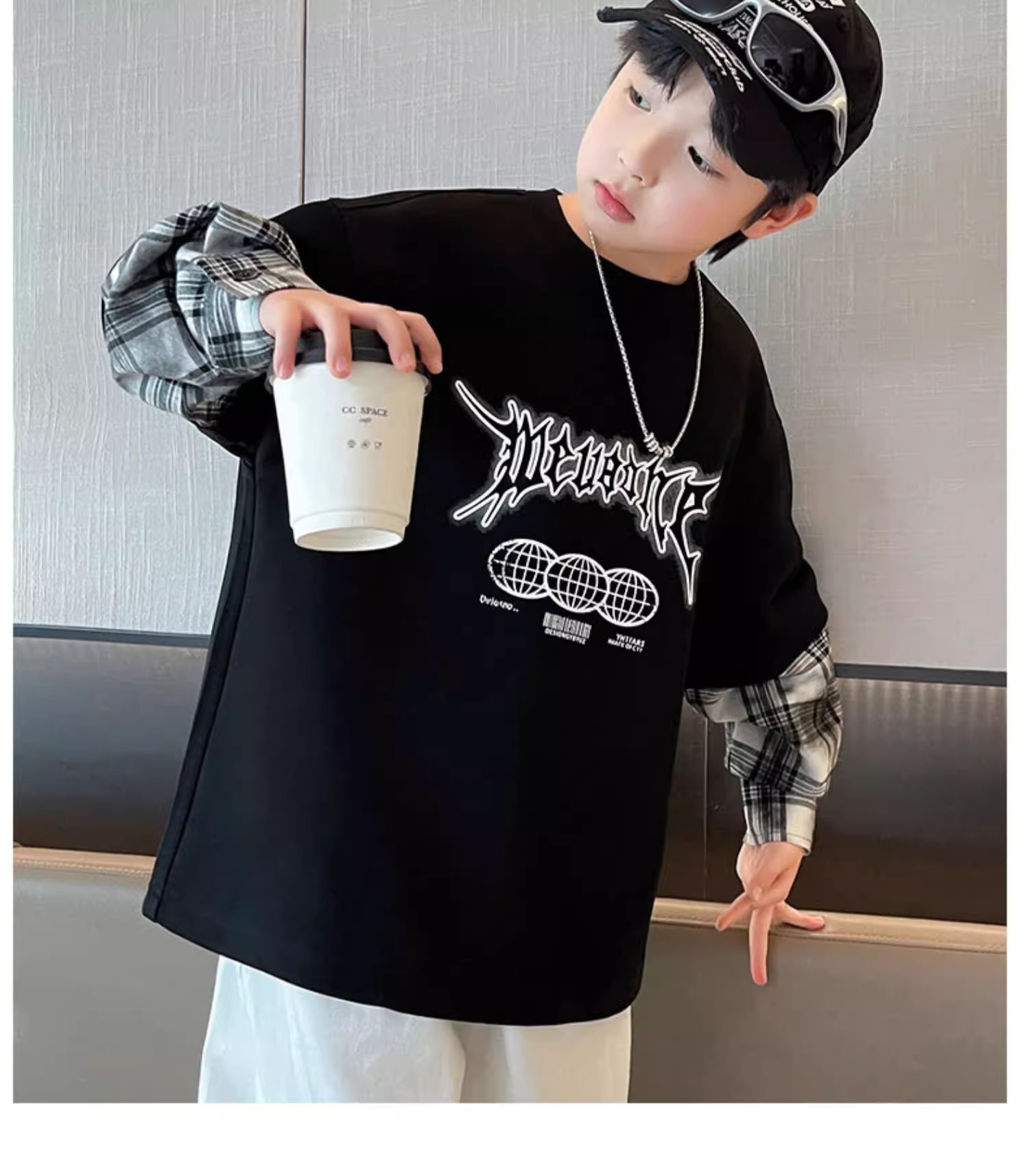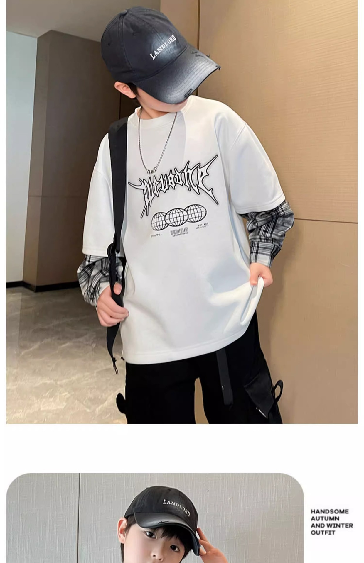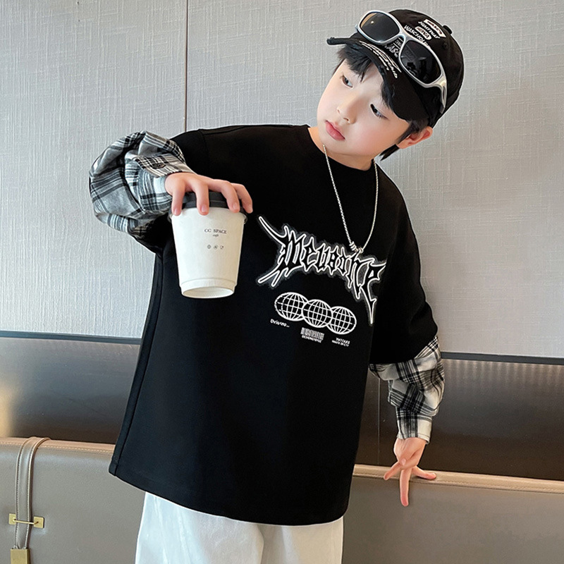 소년 가을 긴팔 티셔츠 봄, 가을 어린이 가짜 투피스 힙합 의류 중대형 어린이 소년 가을 탑 유행 t