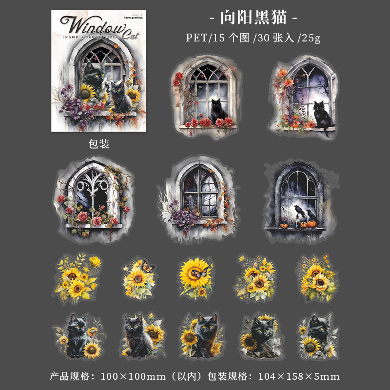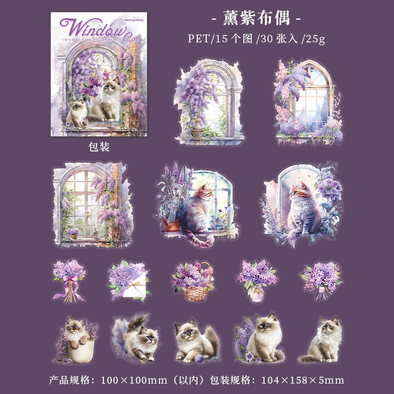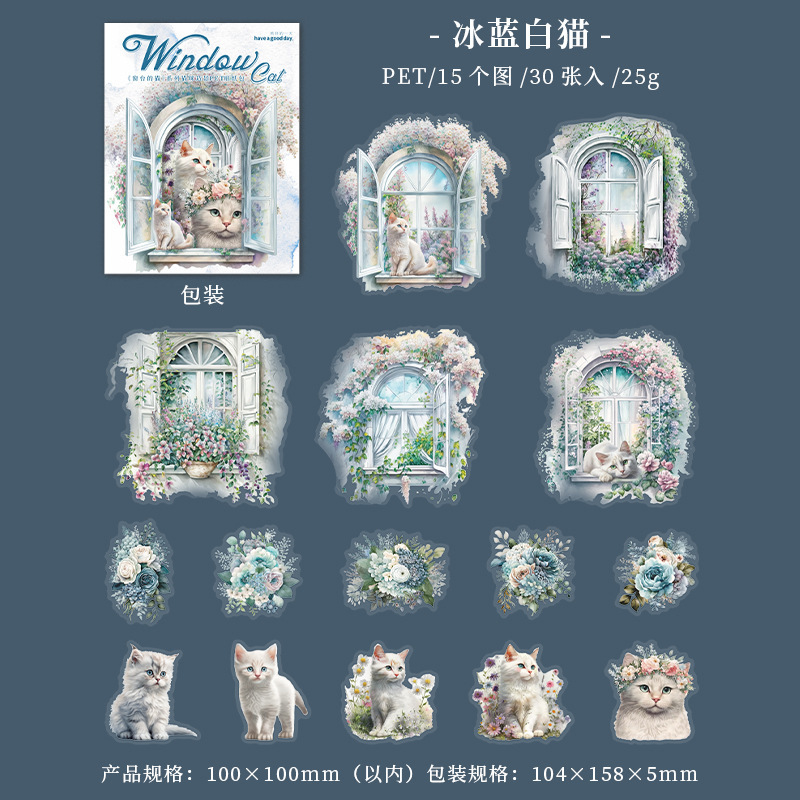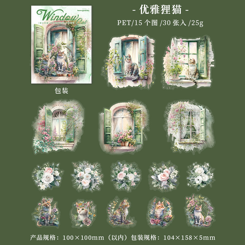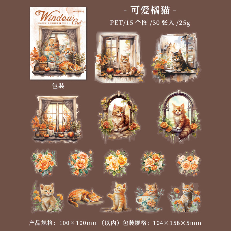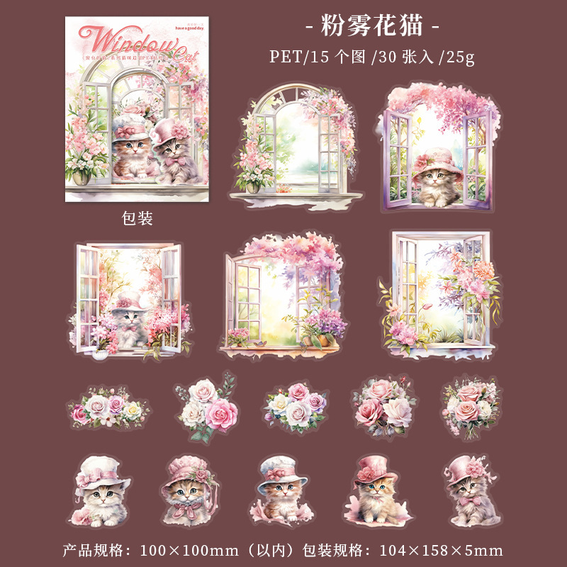 창턱 고양이 시리즈 아름다운 PET 스티커 팩 고양이 창턱 핸드북 소재 30장 6종