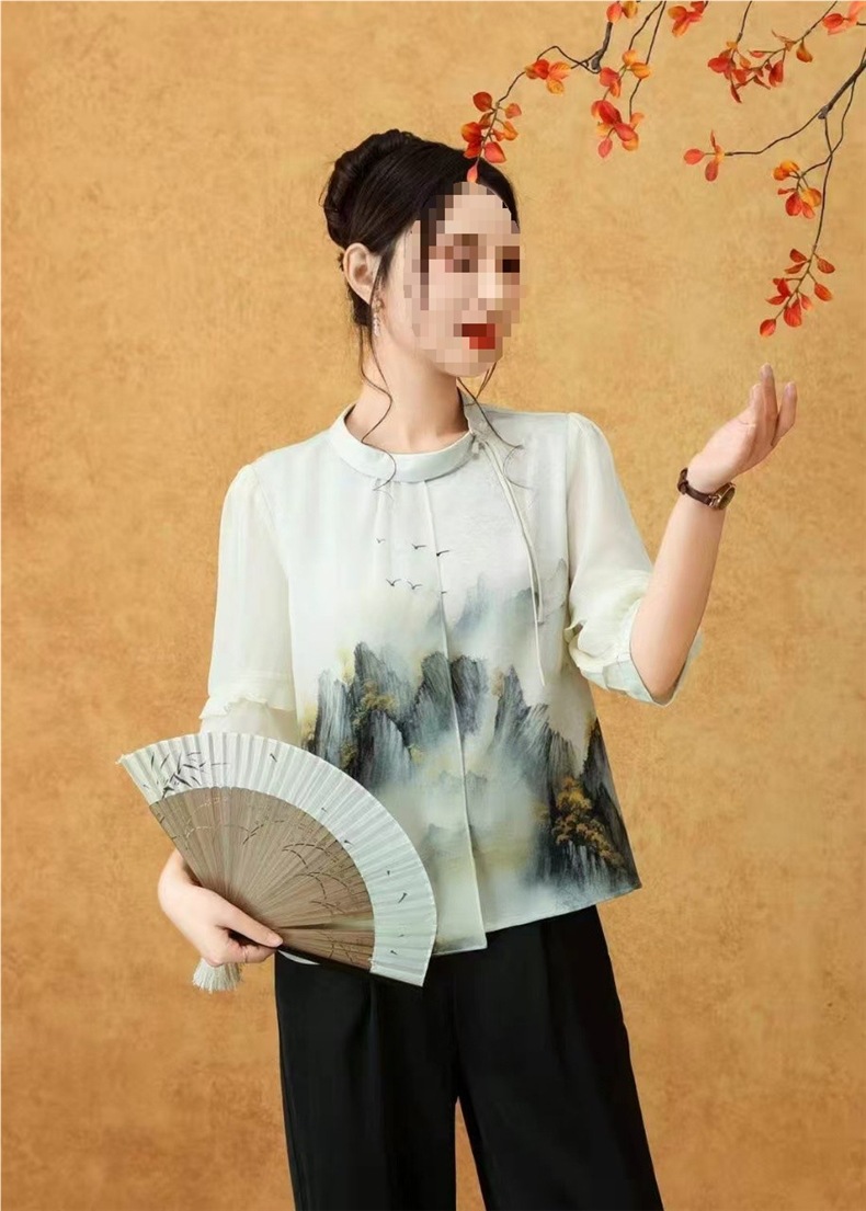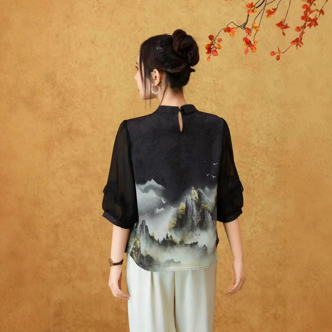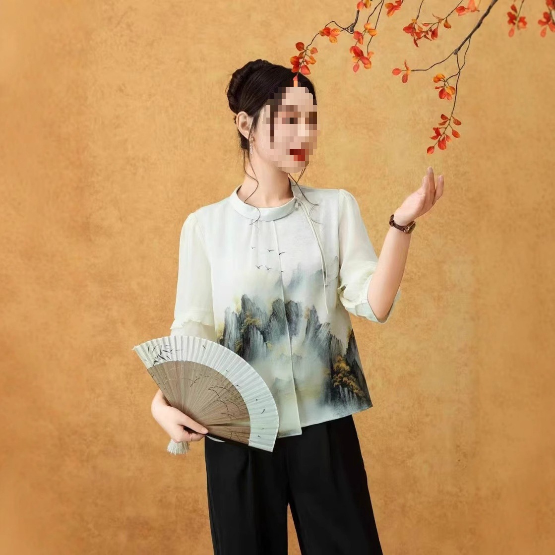 2025 중년 어머니를위한 중국 스타일 셔츠 느슨한 여름 7부 소매 쉬폰 셔츠 중년 및 노인 봄 여름상의