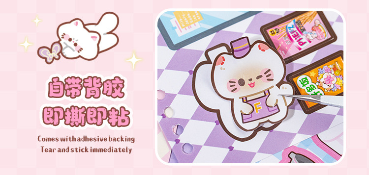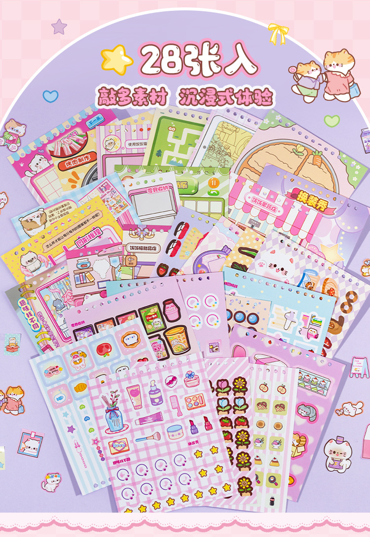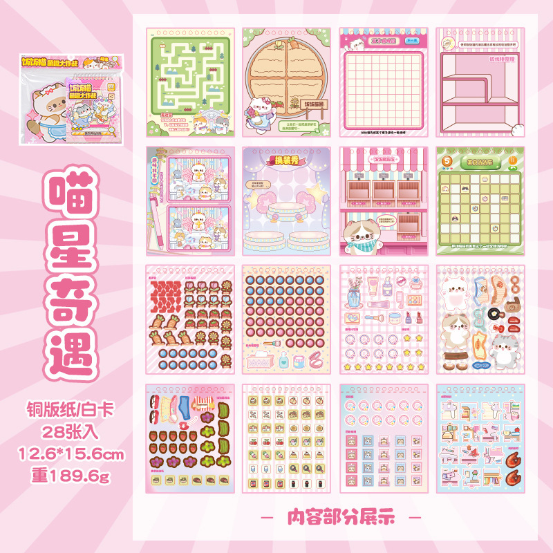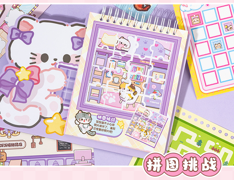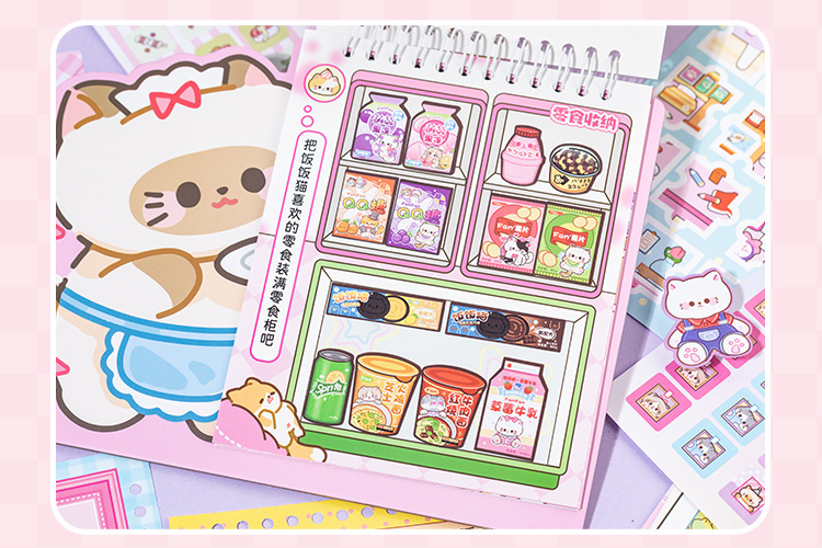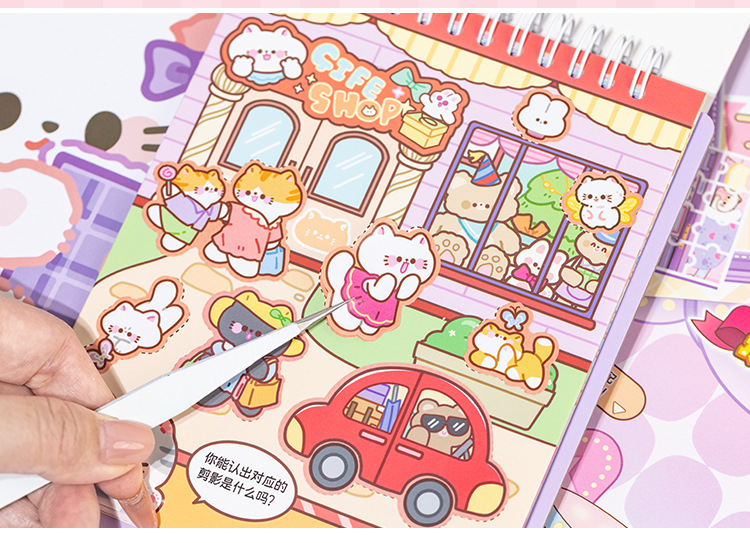 Yuxian 어린이 스티커 책, 고양이 귀여운 전투, 귀여운 핸드북, 창의적인 놀이, DIY 장면, 조용한 책스토어 가기