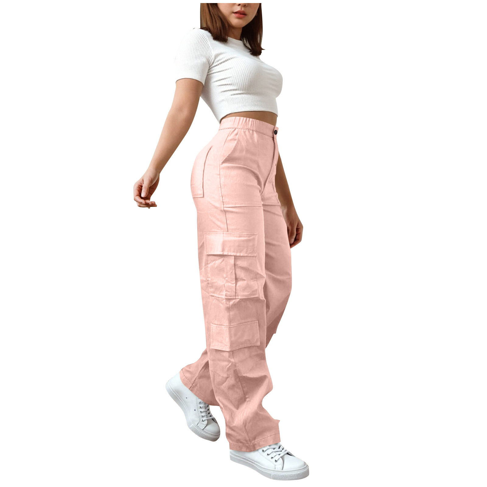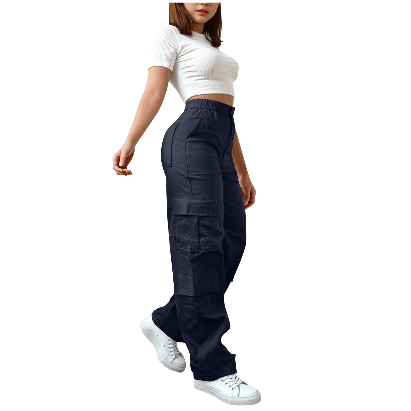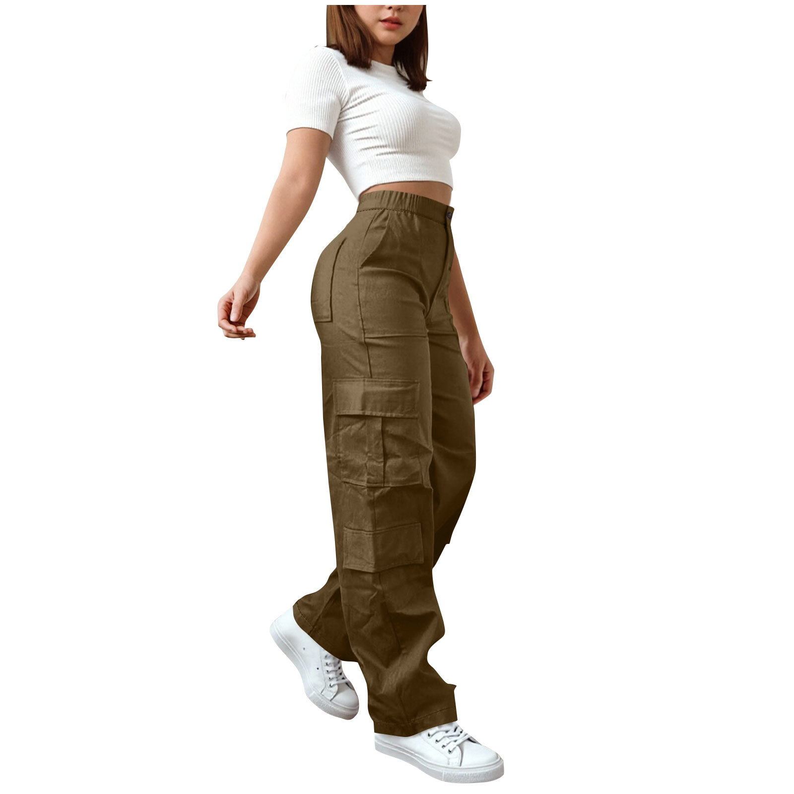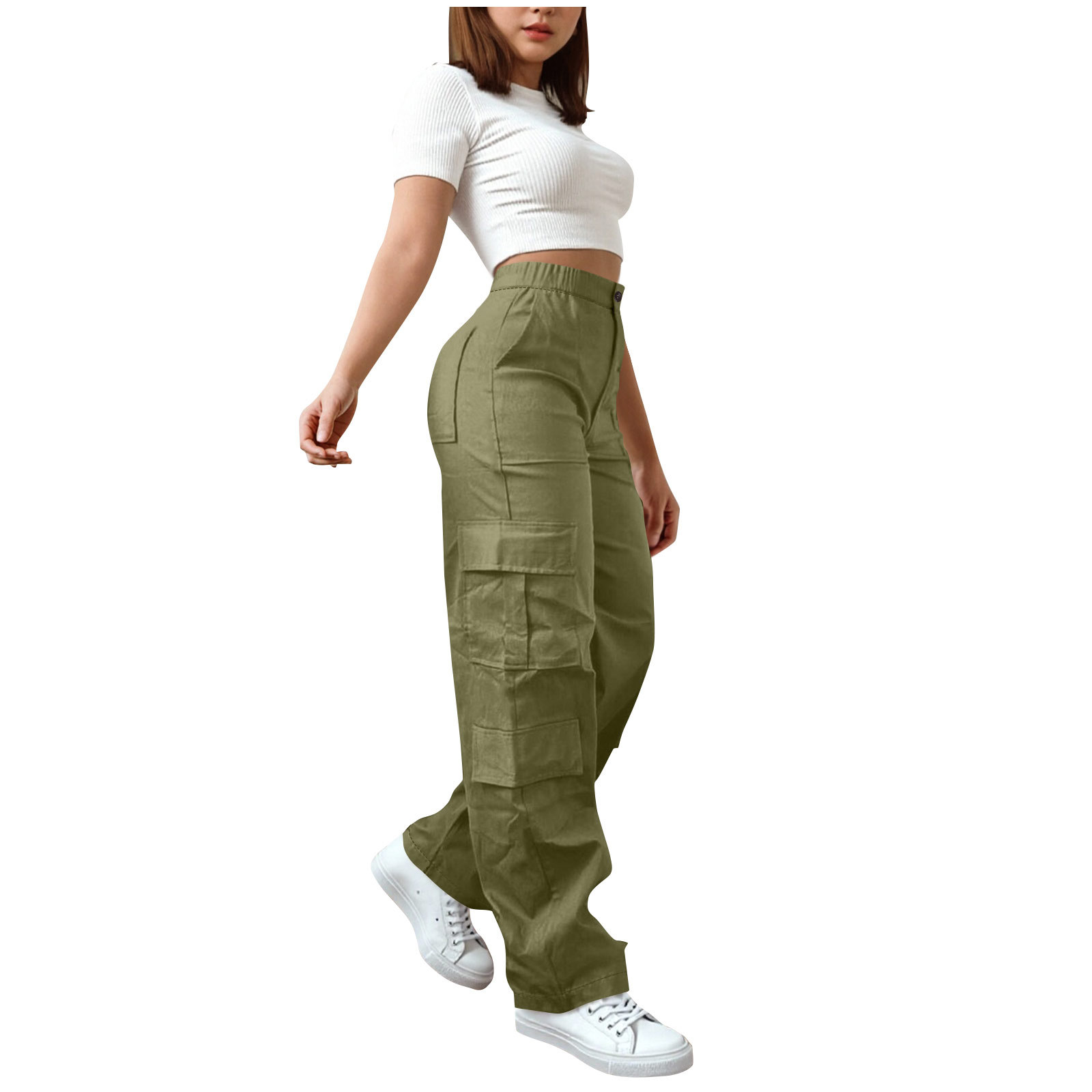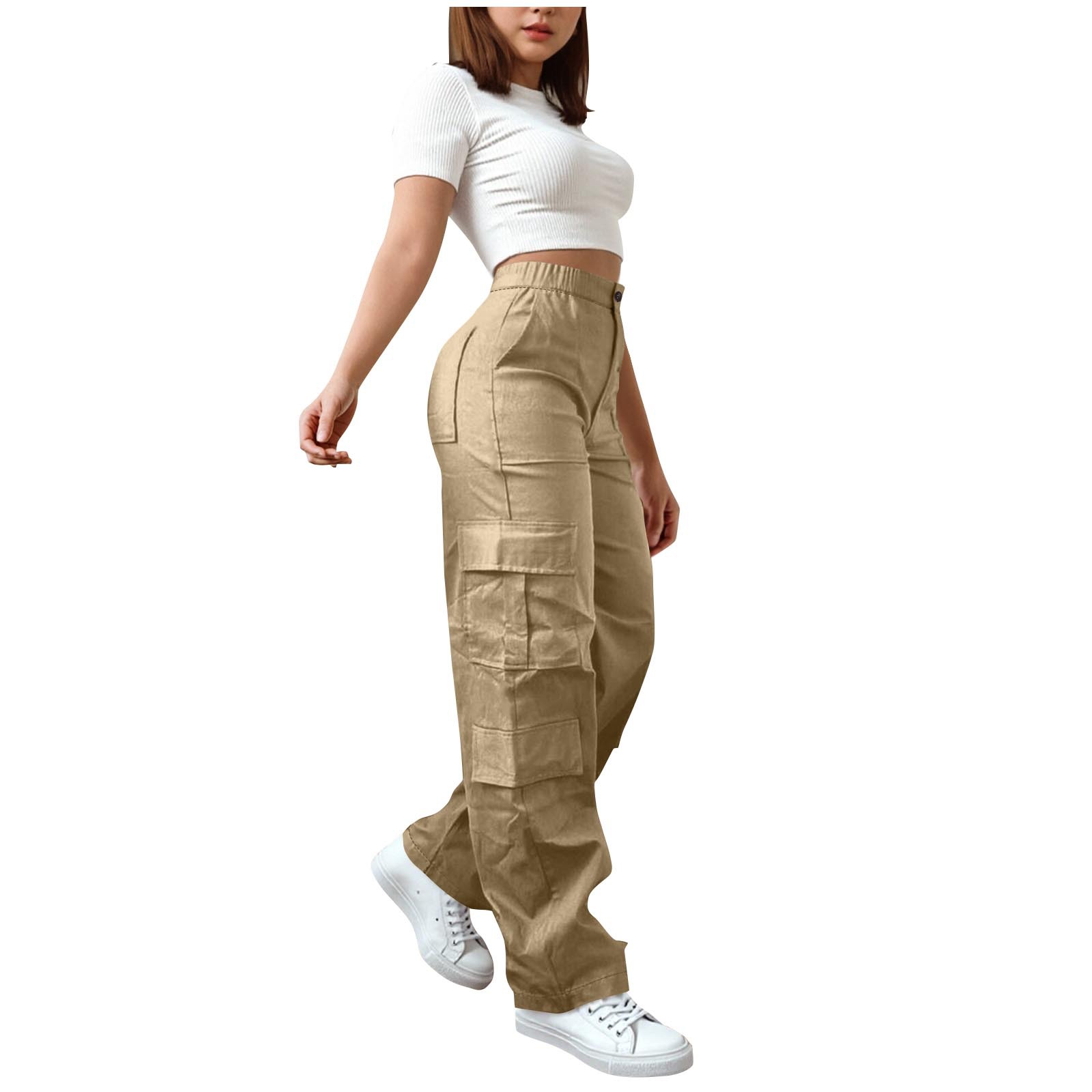 여성 패션 캐주얼 솔리드 컬러 탄성 허리 버튼 스트랩 지퍼 포켓 야외 등산 캐주얼 카고 바지 바지스토어 가기