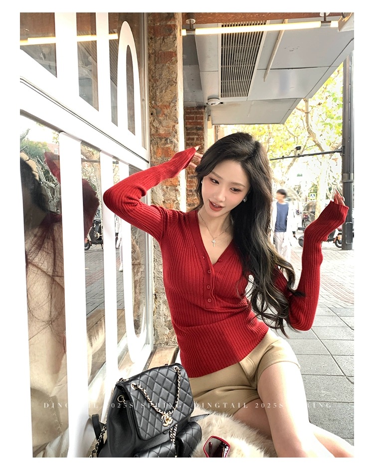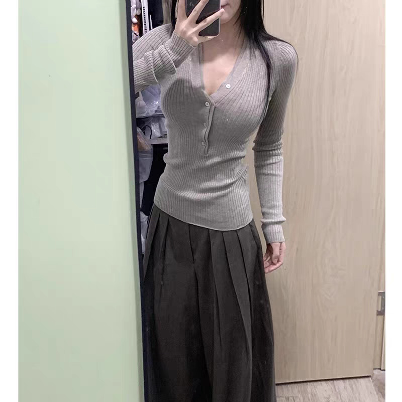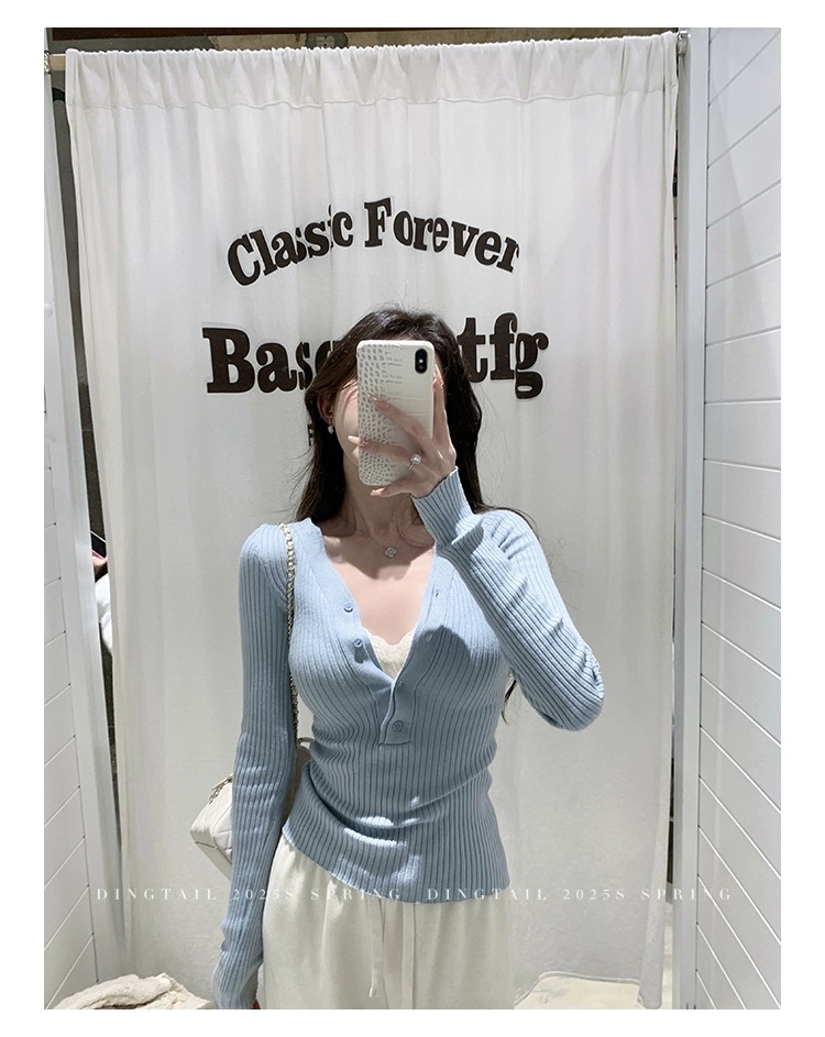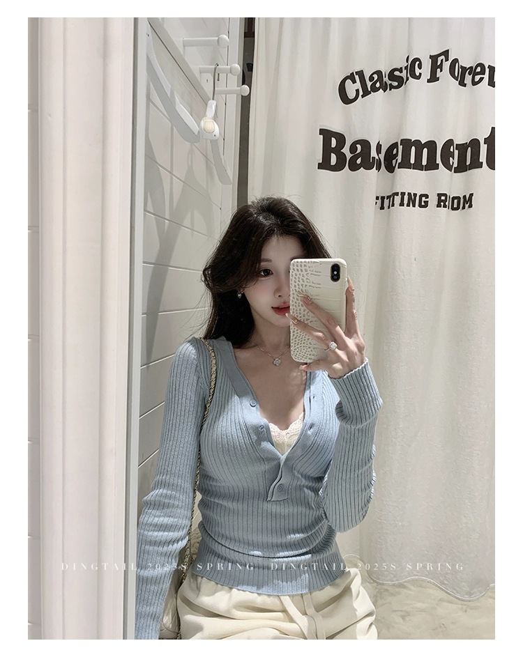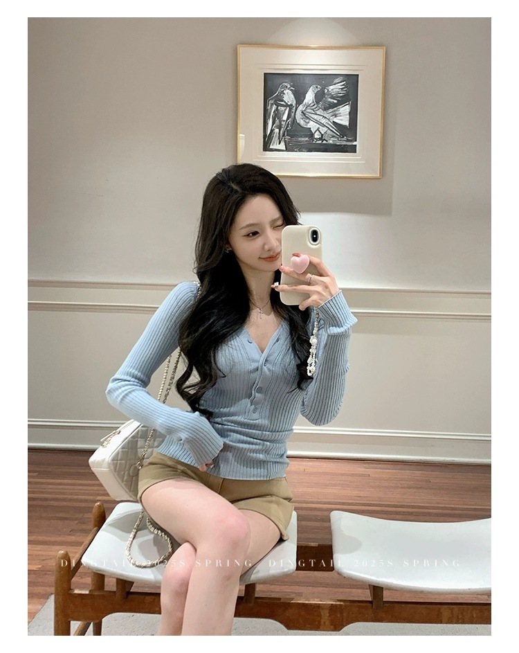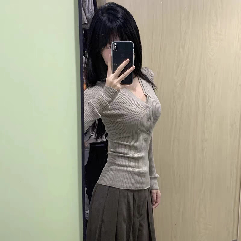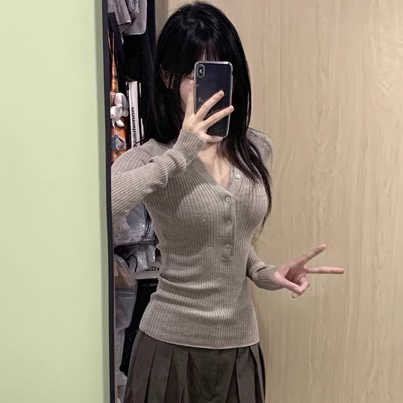 봄, 가을, 겨울 여성용 코어 스펀 원사 브이넥 긴팔 스웨터, 순수한 뜨거운 소녀 슬림 스웨터 슬리밍 보텀 탑스토어 가기