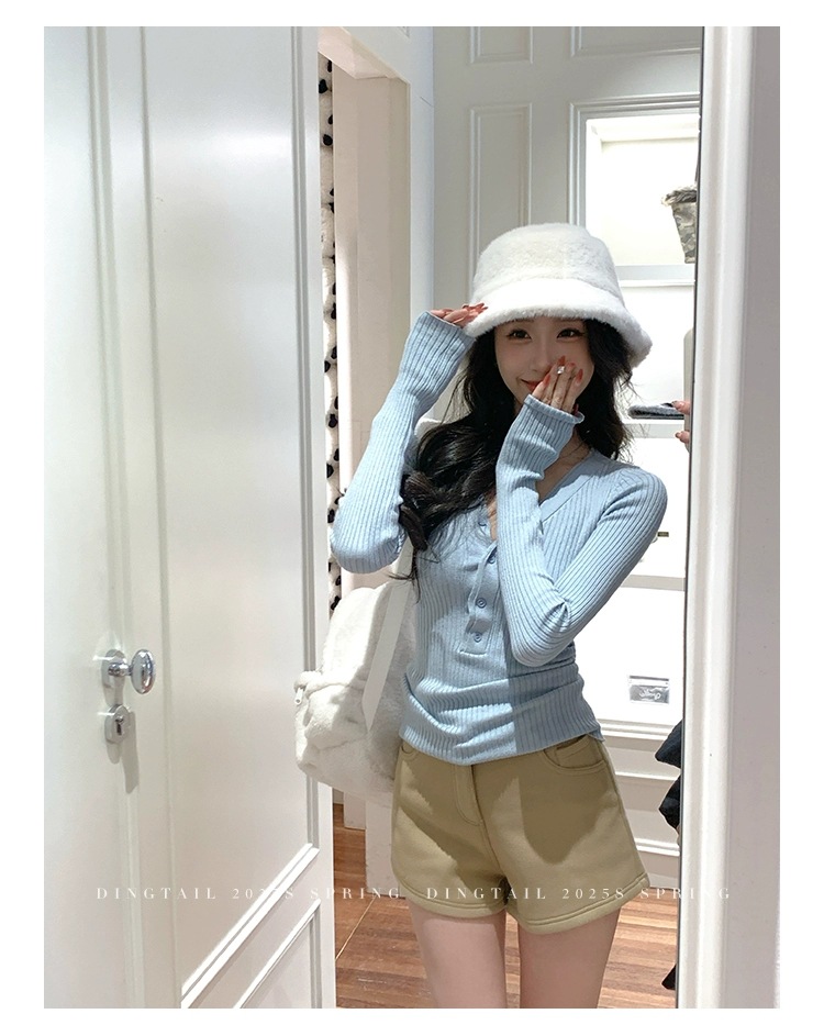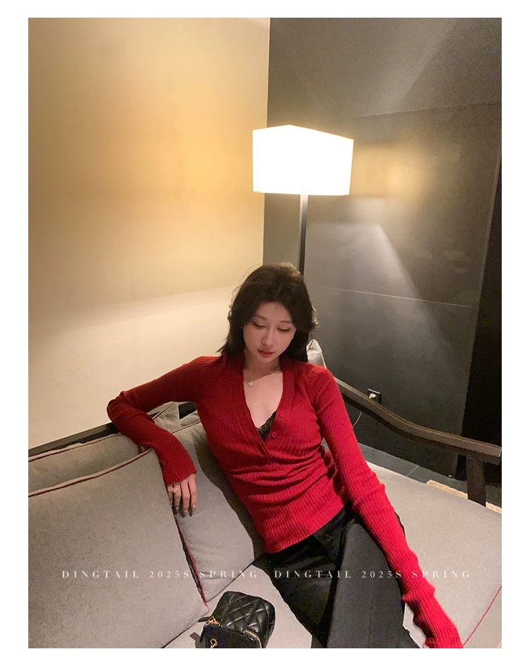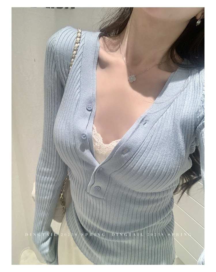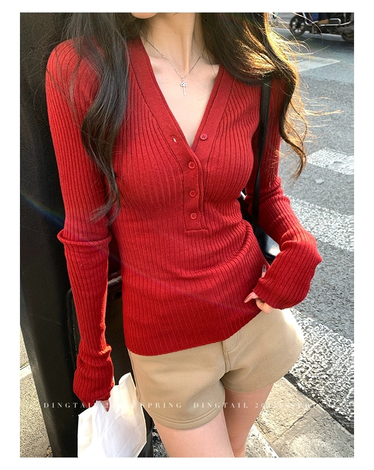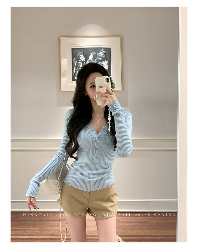 봄, 가을, 겨울 여성용 코어 스펀 원사 브이넥 긴팔 스웨터, 순수한 뜨거운 소녀 슬림 스웨터 슬리밍 보텀 탑