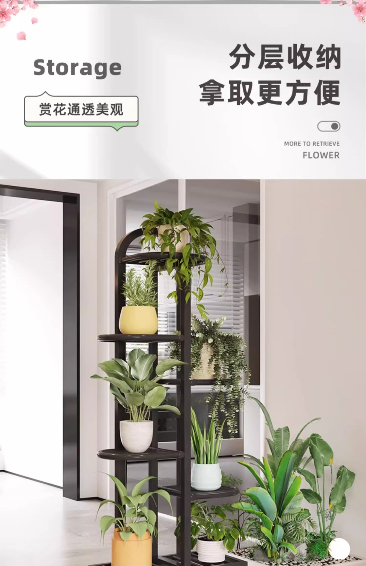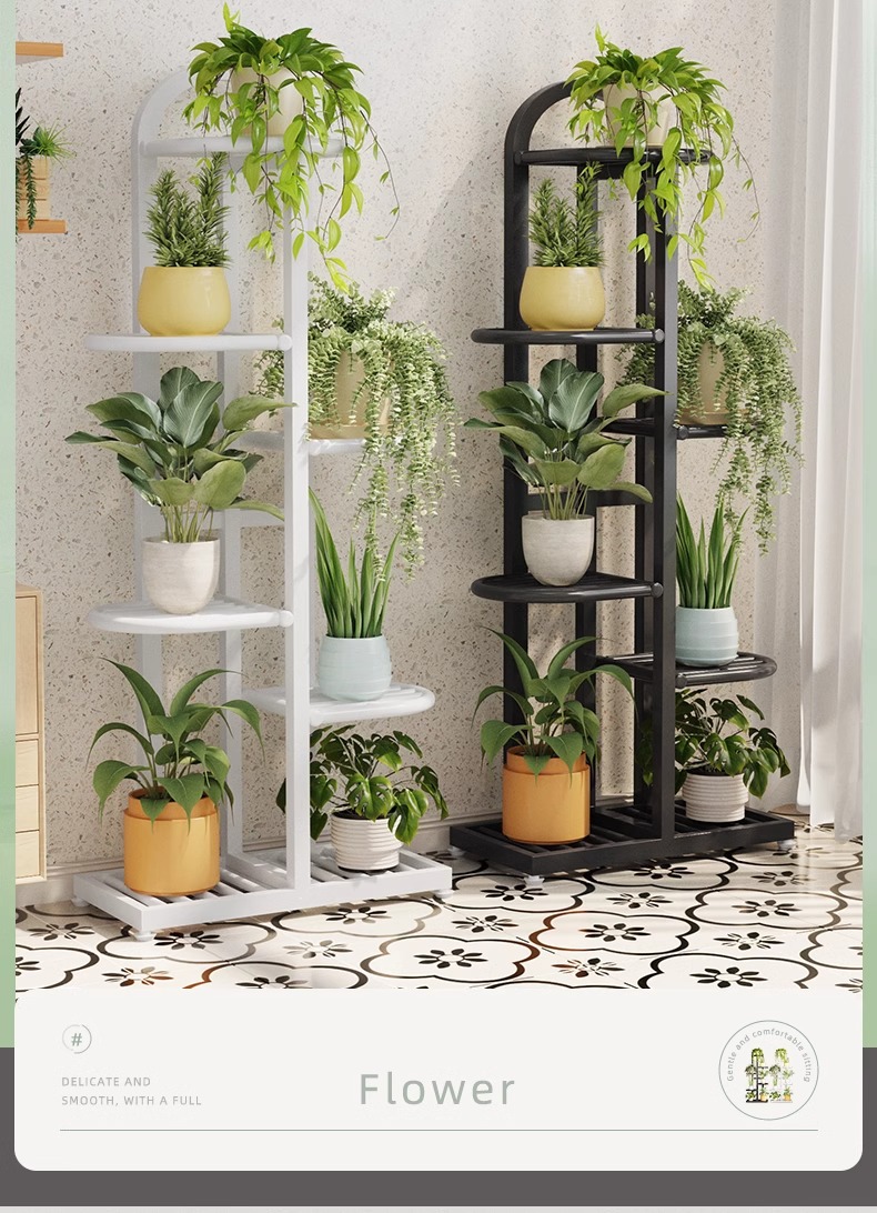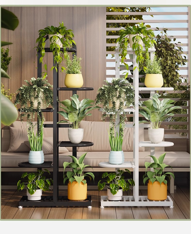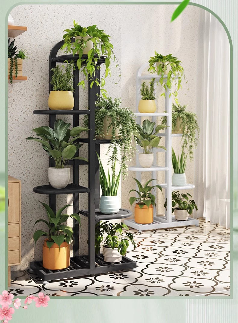 거실용 수납 선반, 바닥부터 천장까지 이어지는 다층 철제 꽃 스탠드, 실내 청록색 화분, 발코니 화분, 식물 진열대