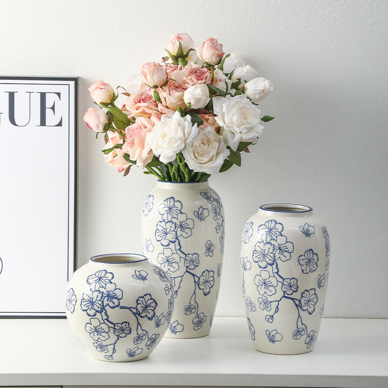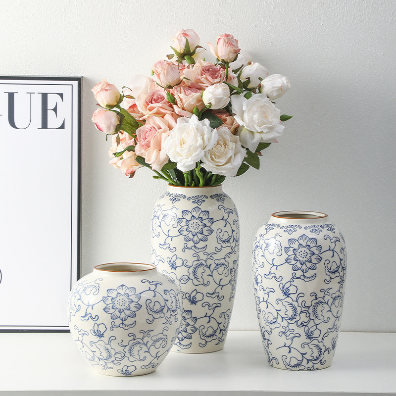 중국 스타일 새로운 중국 스타일 복고풍 파란색과 흰색 도자기 꽃병 빛 럭셔리 세라믹 장식품 거실 입구 꽃꽂이 홈 인테리어
