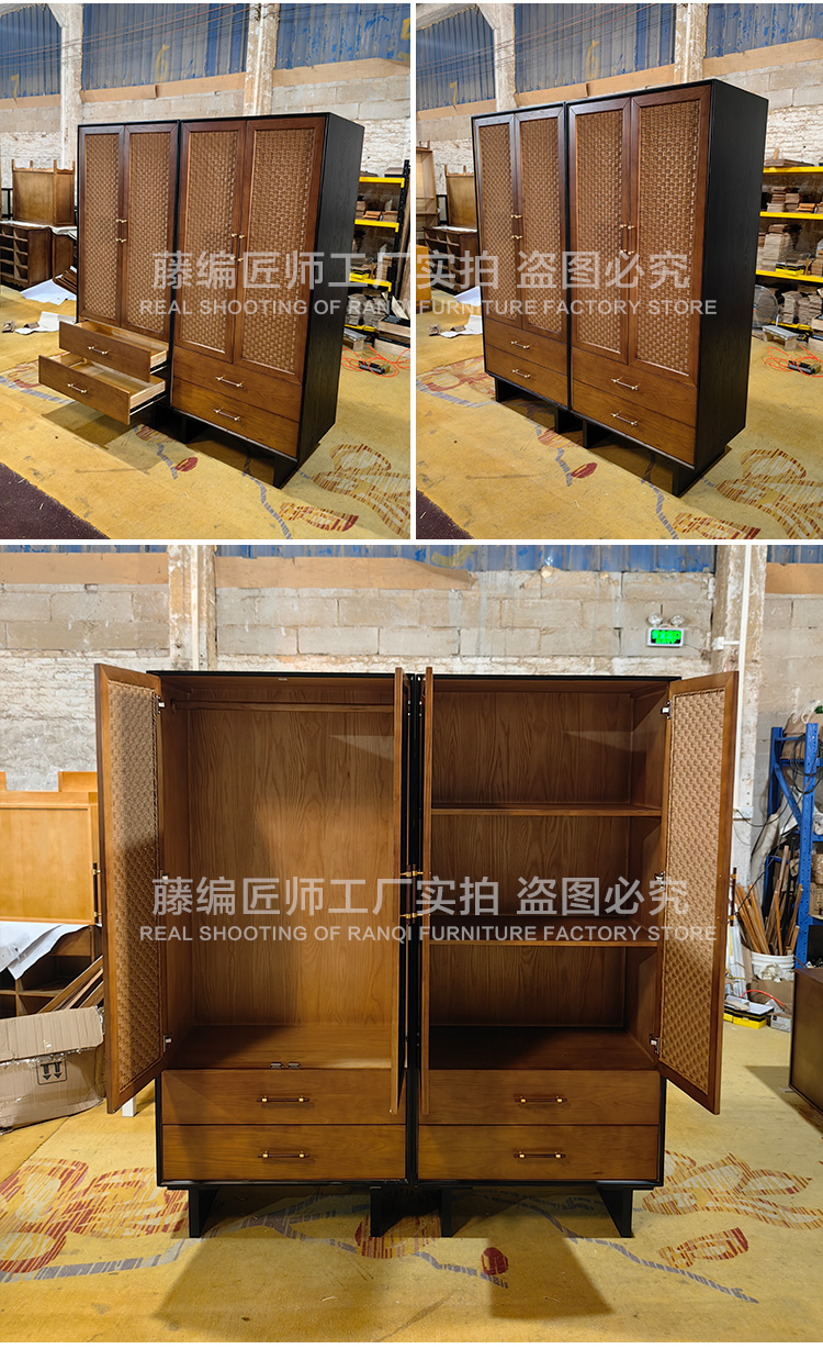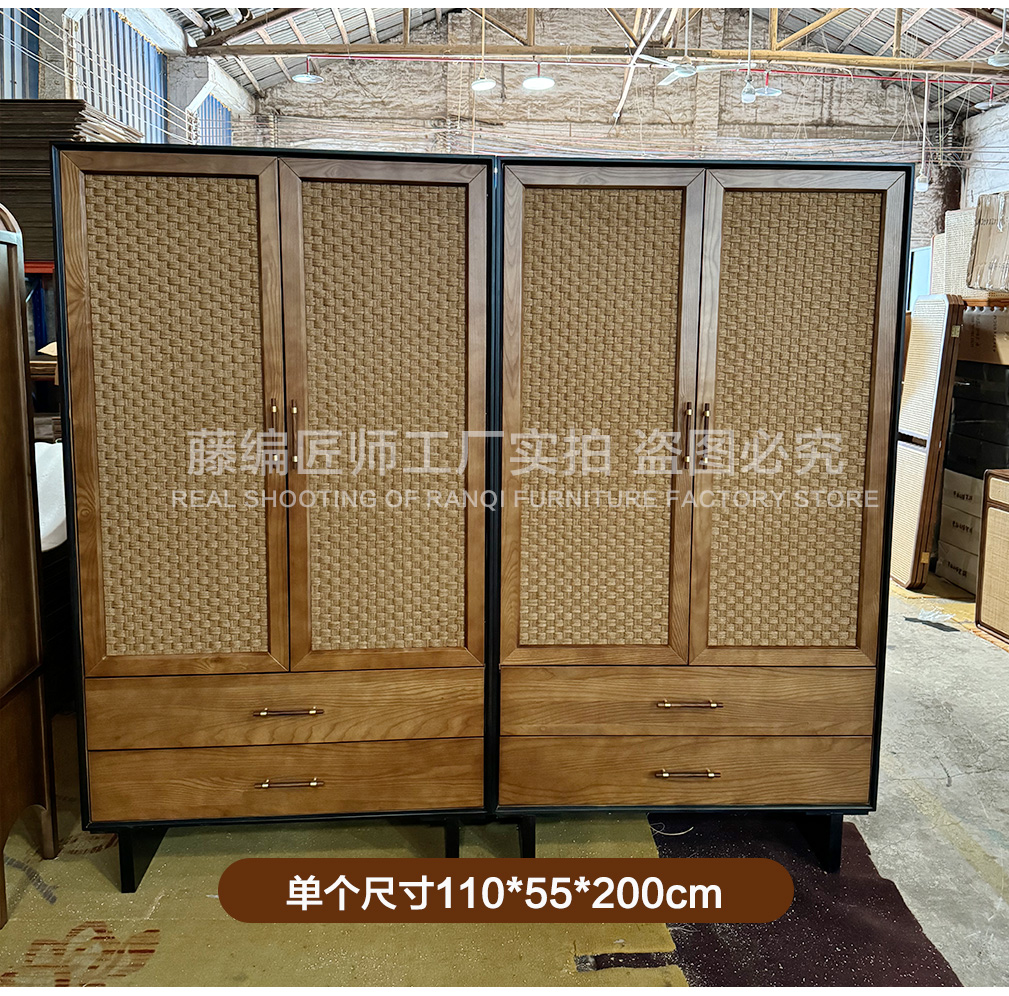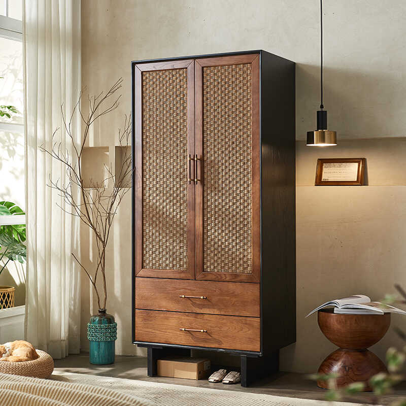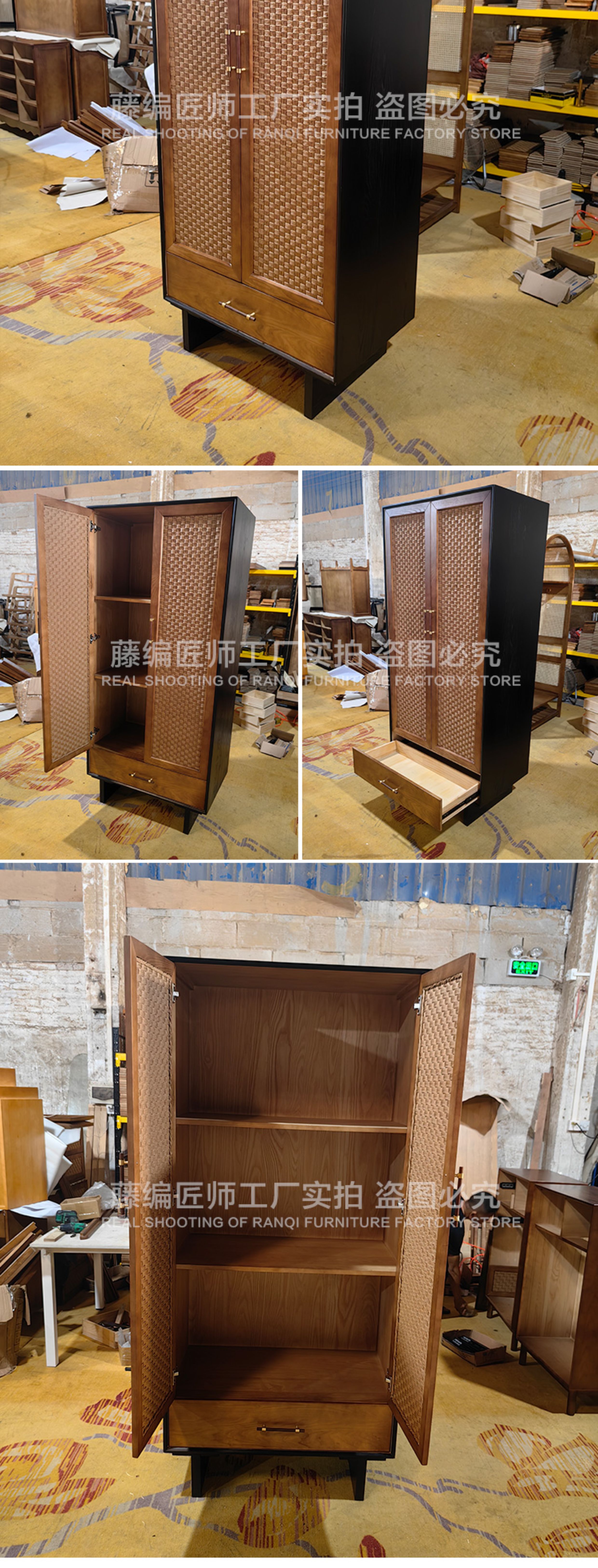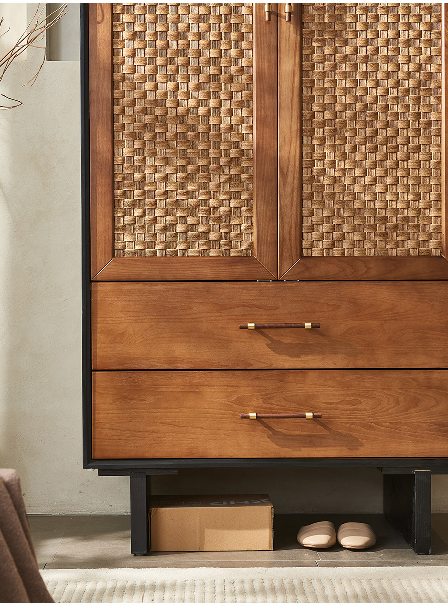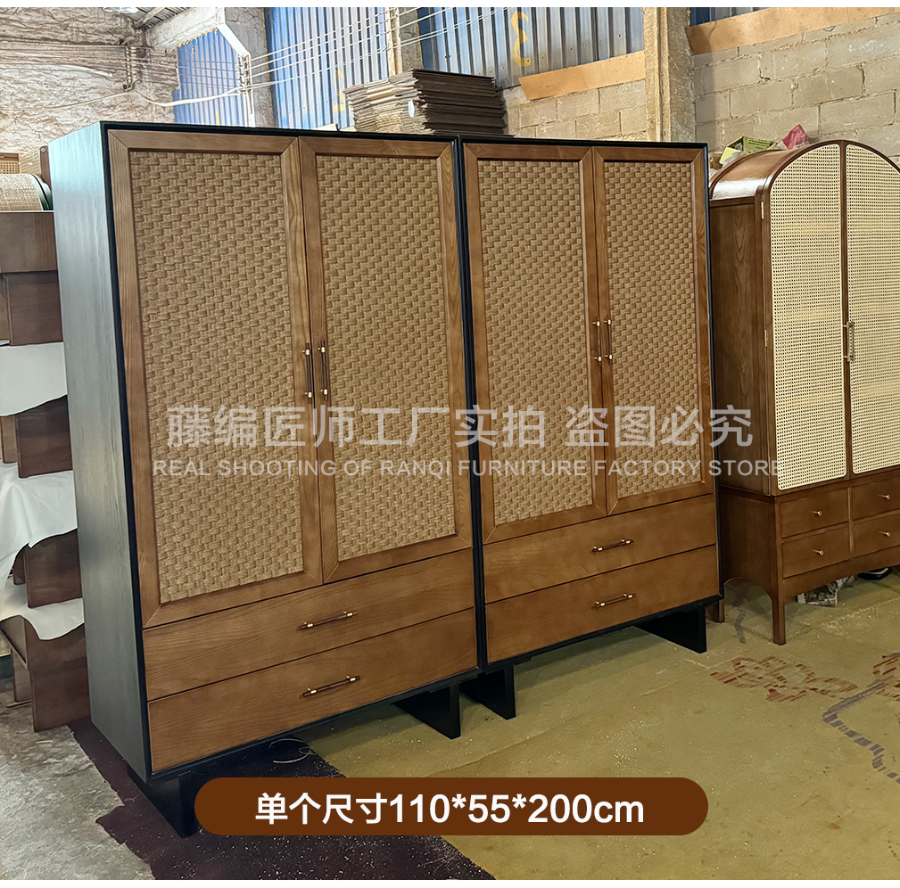 중세 스타일 단단한 나무 등나무 옷장 수납 캐비닛 와비사비 스타일 복고풍 캐비닛 B&B 침실 양문 옷장