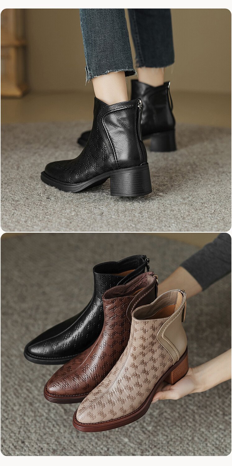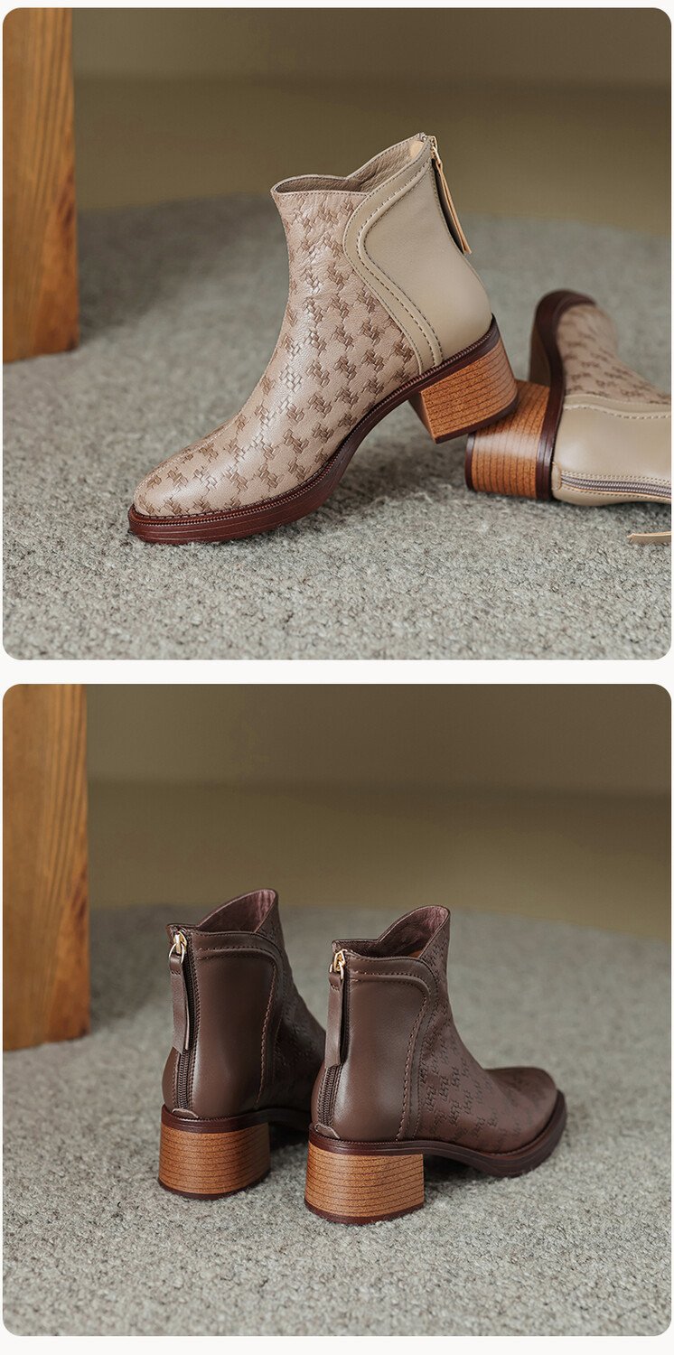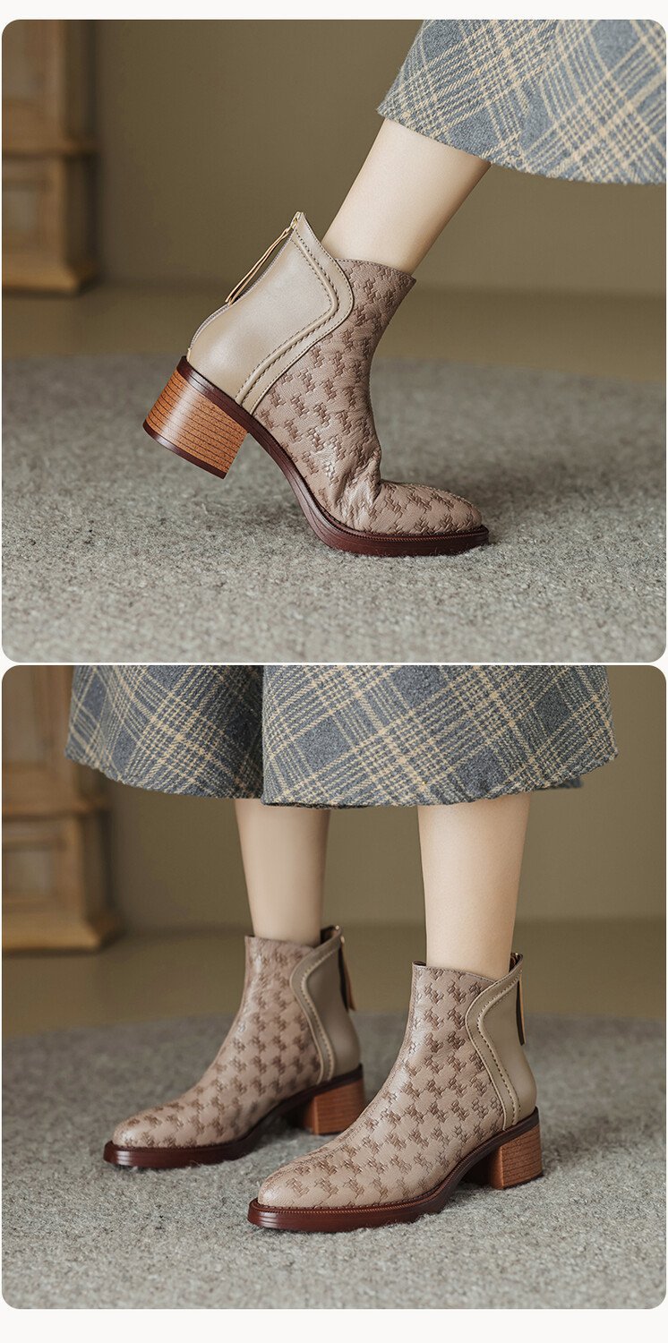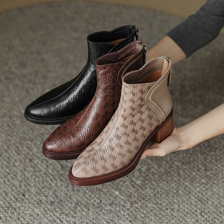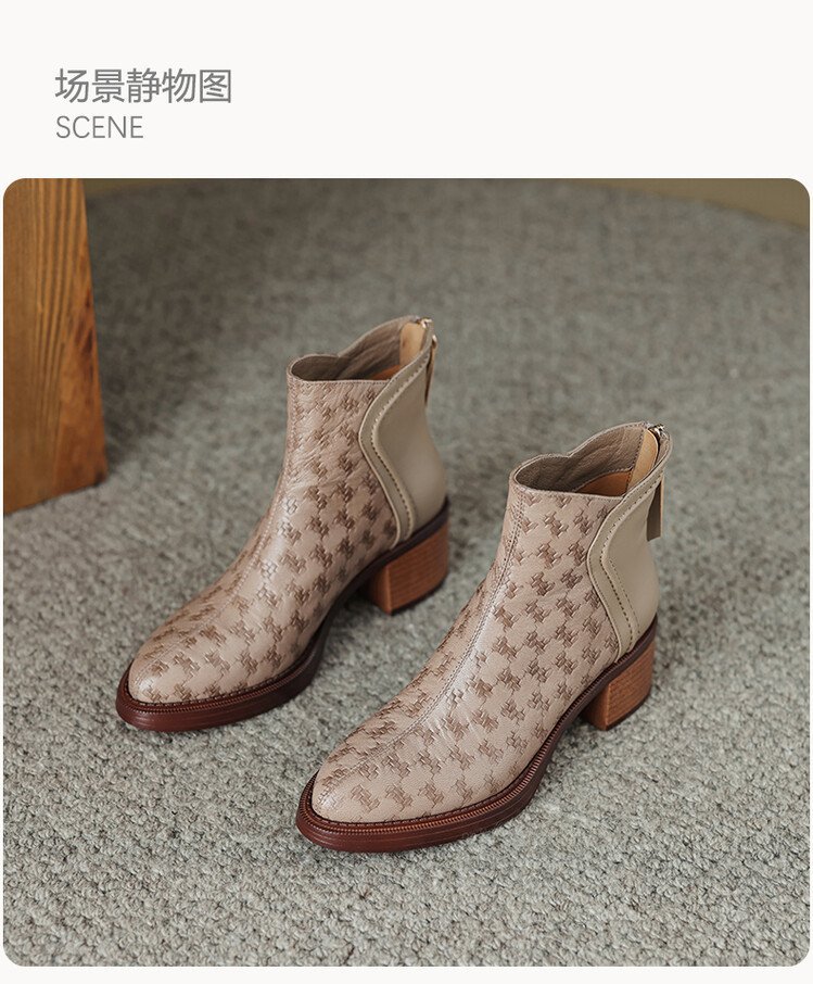 여성용 서양식 짧은 부츠, 봄, 가을 싱글 부츠, 둥근 발가락, 중간 굽, 하이힐 부츠, 두꺼운 굽, 천연 가죽, 뒷지퍼, 양가죽 플러스 벨벳 살구색스토어 가기