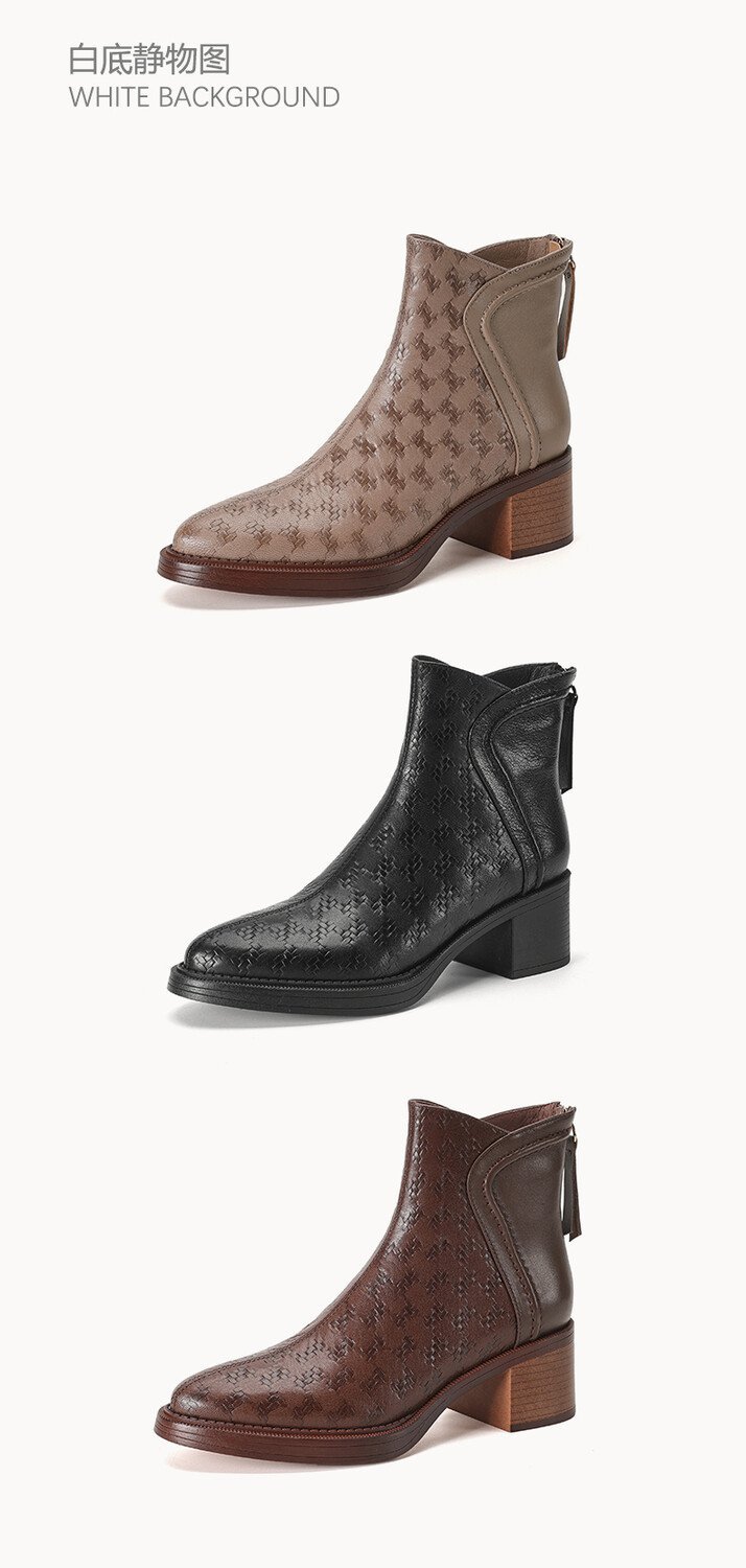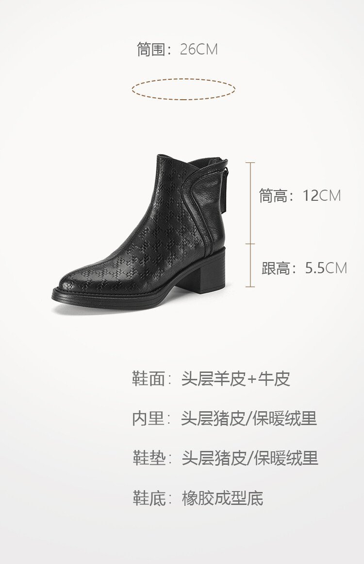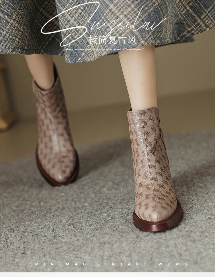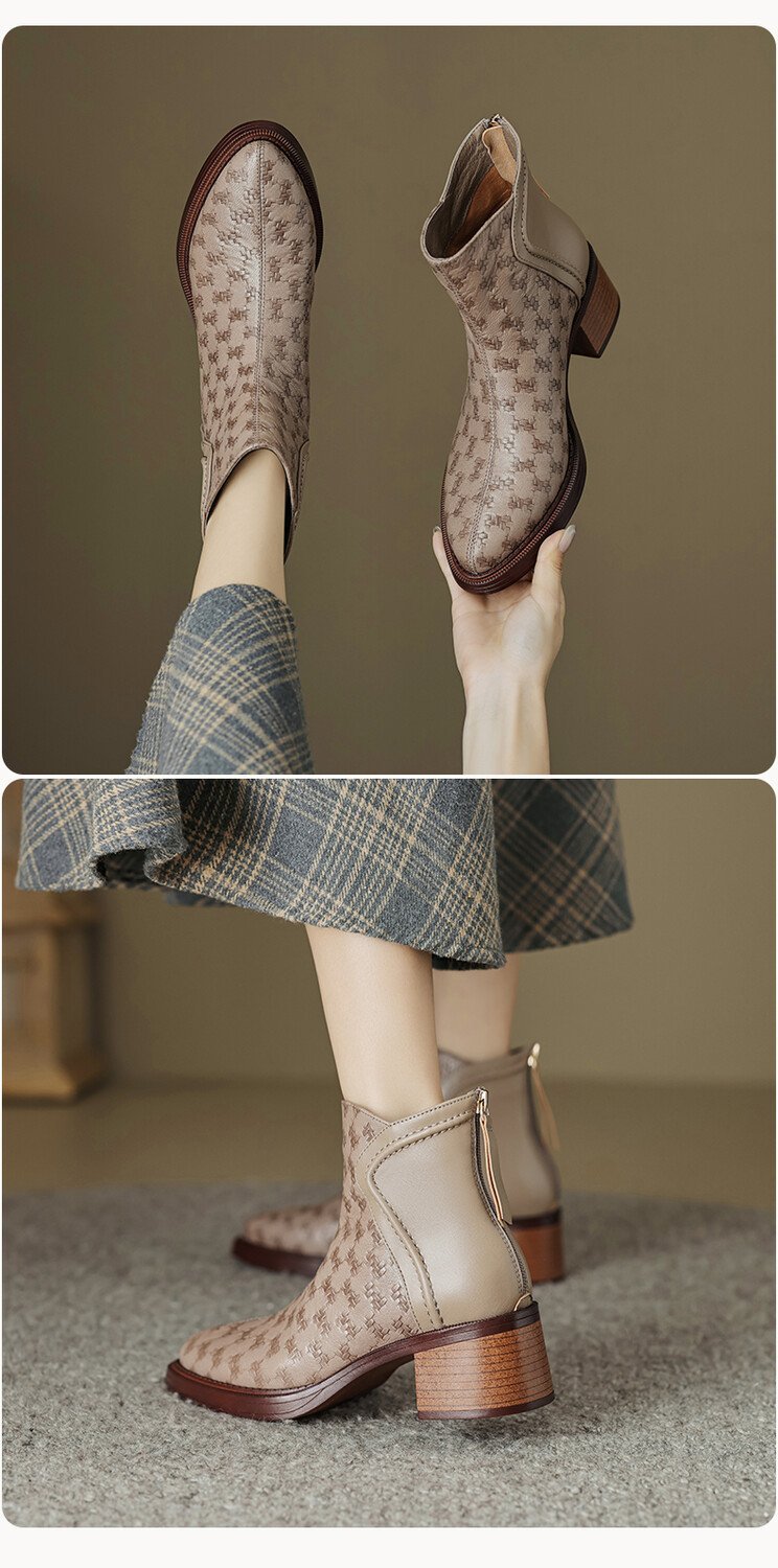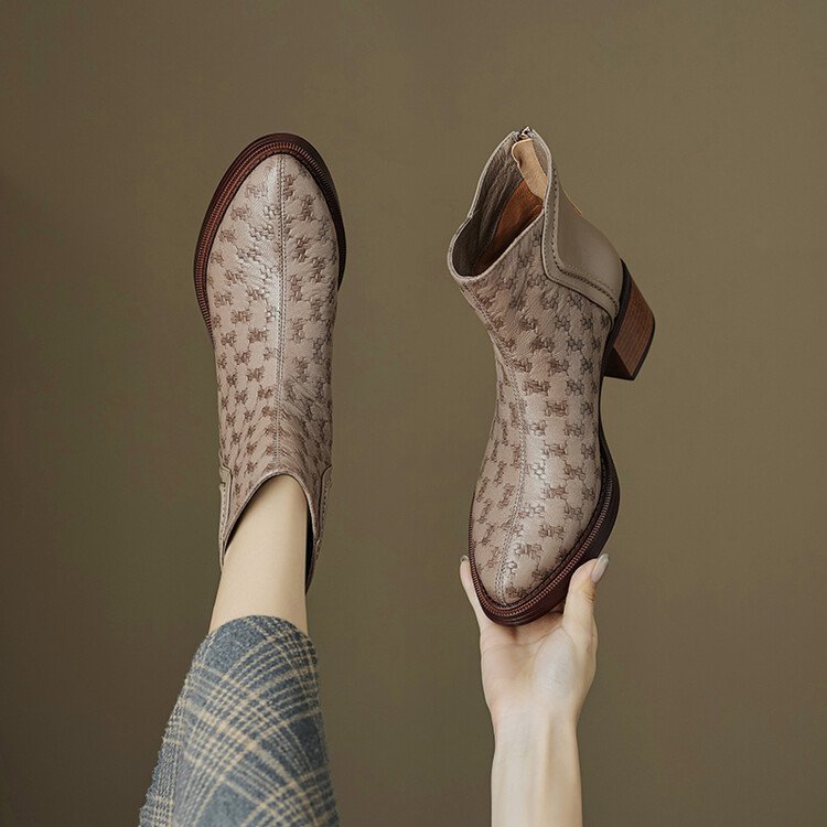 여성용 서양식 짧은 부츠, 봄, 가을 싱글 부츠, 둥근 발가락, 중간 굽, 하이힐 부츠, 두꺼운 굽, 천연 가죽, 뒷지퍼, 양가죽 플러스 벨벳 살구색스토어 가기