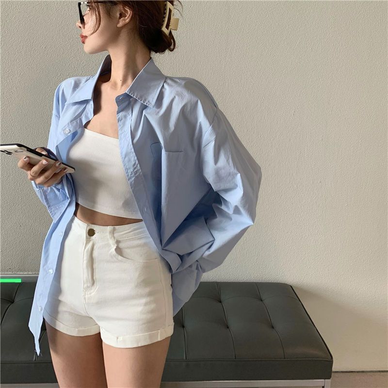 디자인 롱탑 루즈자켓 블루셔츠 여성 긴팔셔츠 캐주얼 한국판 미디엄 아우터 봄, 가을