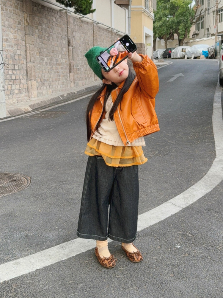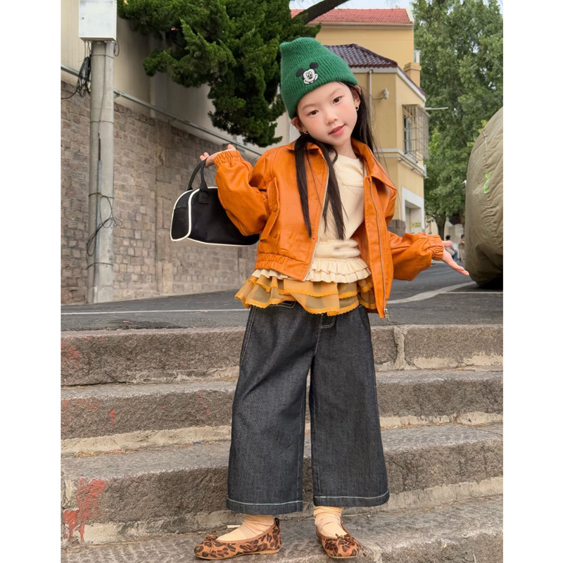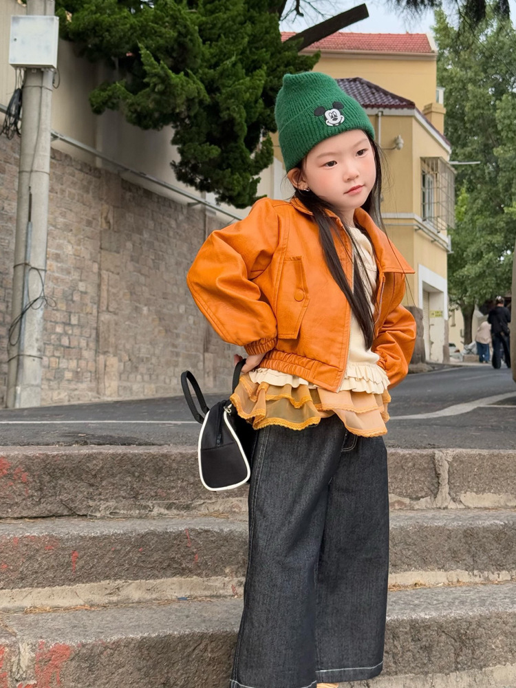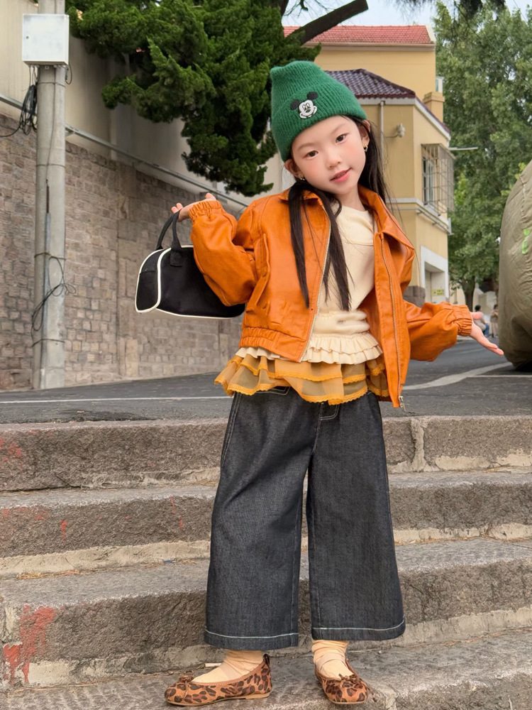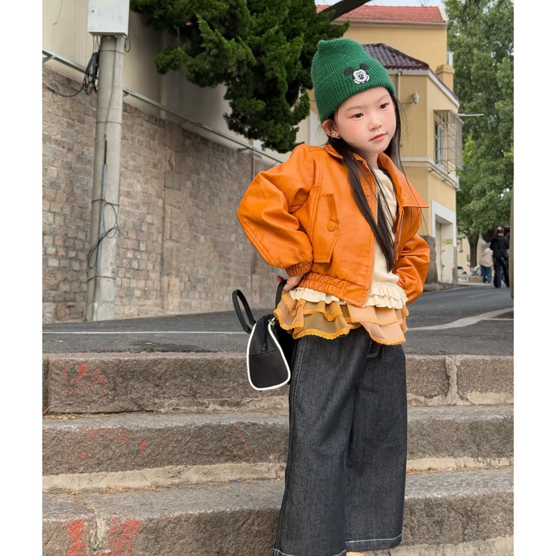 아동 코트 가을 의류 2025 새로운 스타일 소녀의 세련된 오토바이 가죽 코트 아기 짧은 노란색 재킷 탑