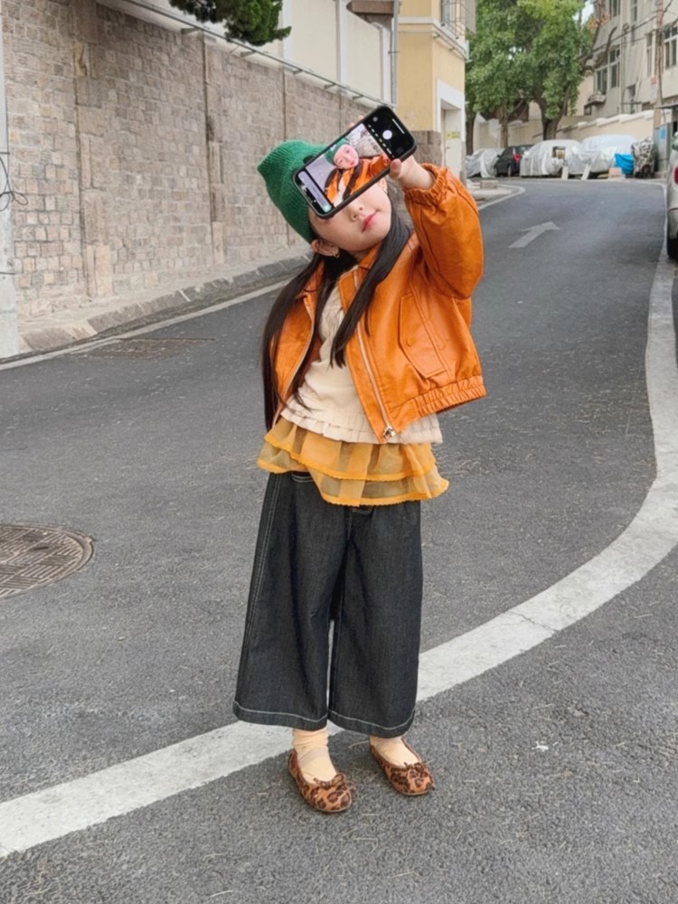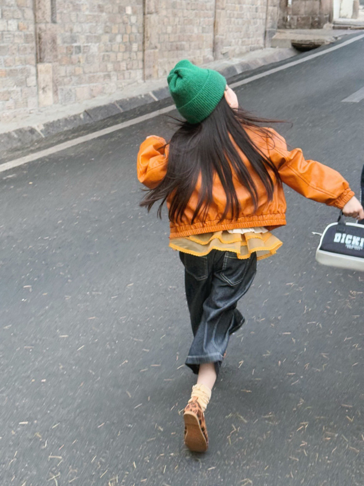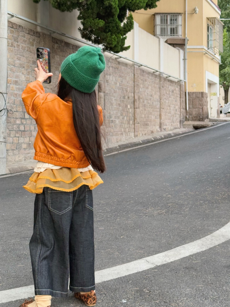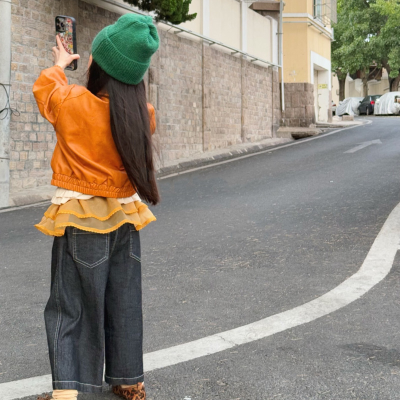아동 코트 가을 의류 2025 새로운 스타일 소녀의 세련된 오토바이 가죽 코트 아기 짧은 노란색 재킷 탑