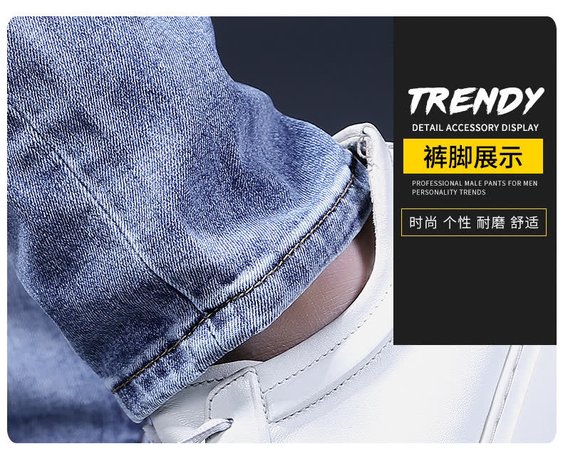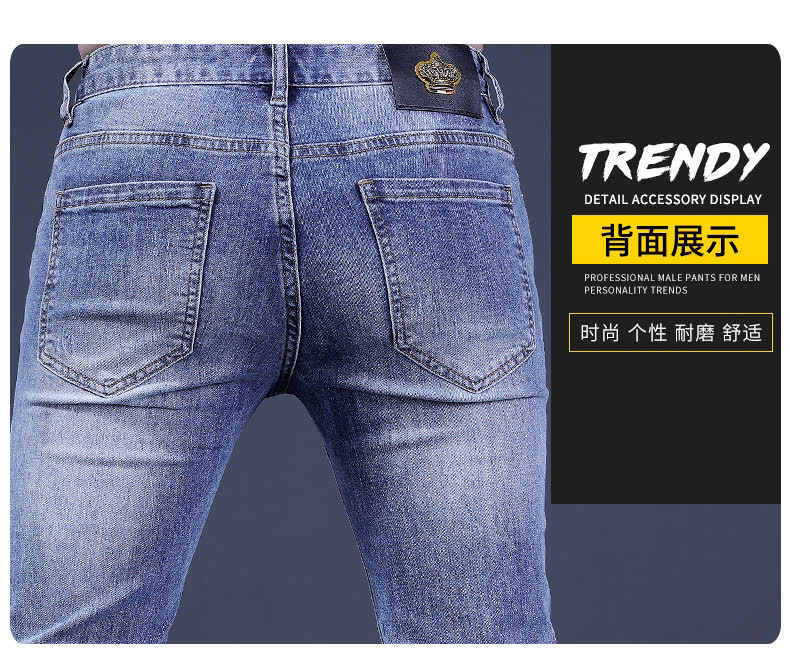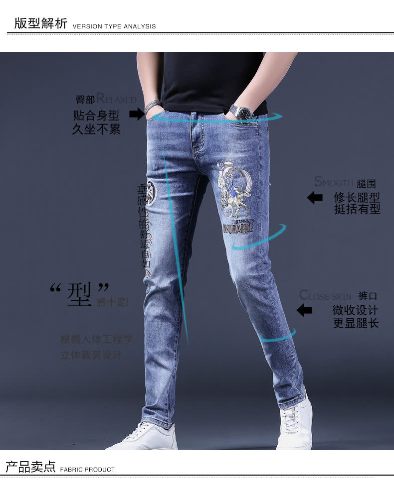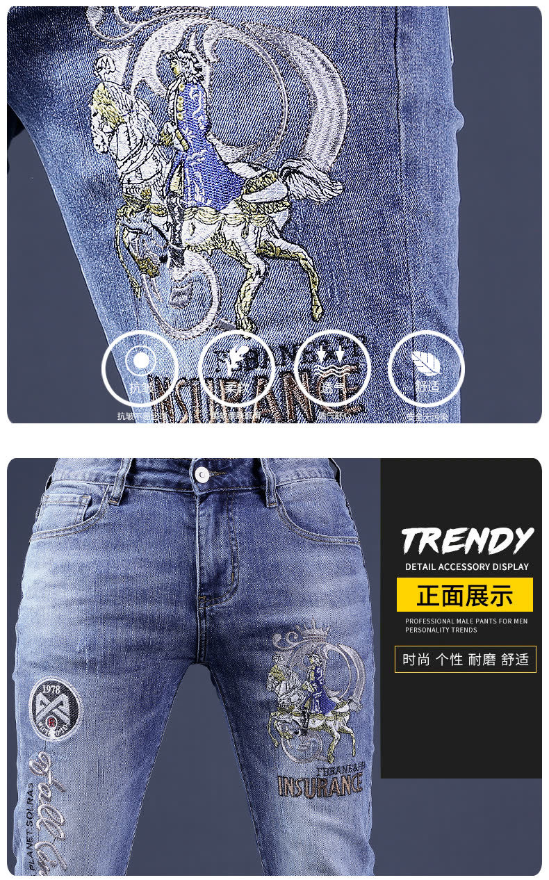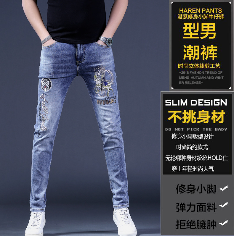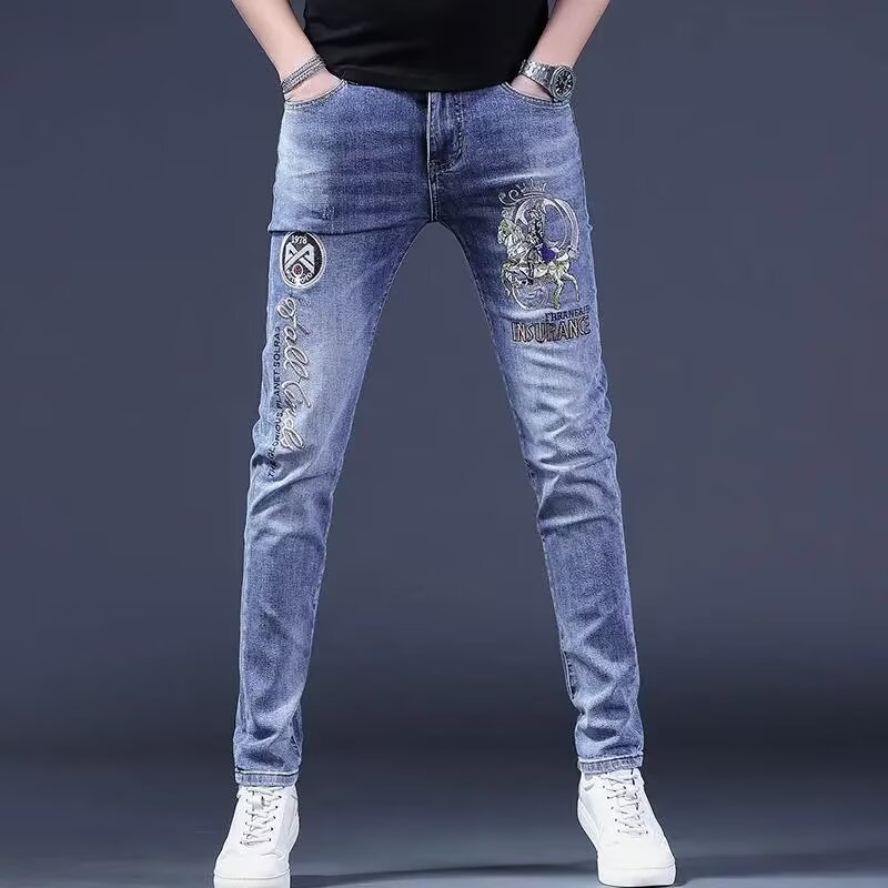 봄 여름 신상 블루 남성용 호랑이 자수 청바지 남성용 밝은 색상 슬림 스트레치 남성용 작은 다리 바지 트렌디스토어 가기