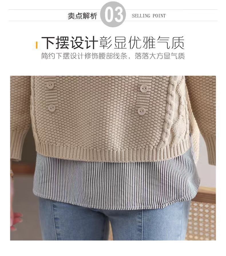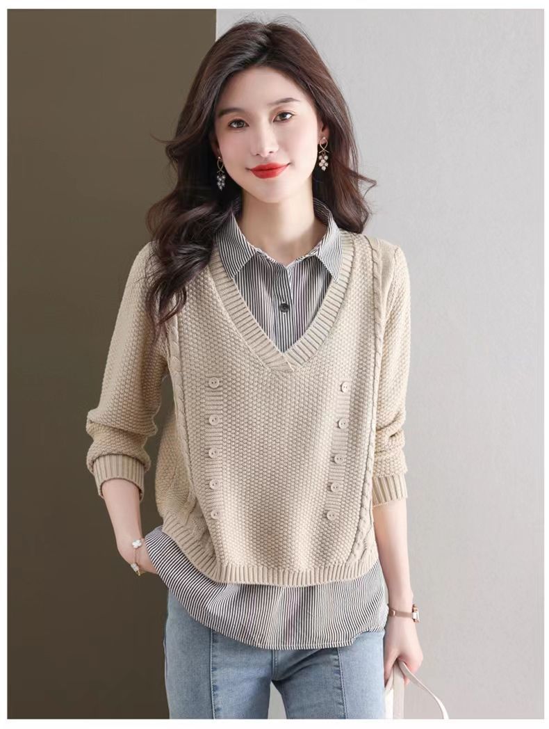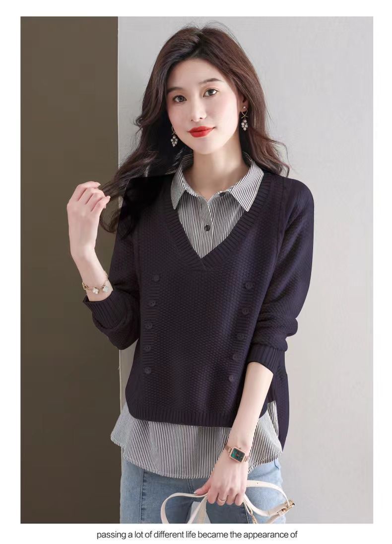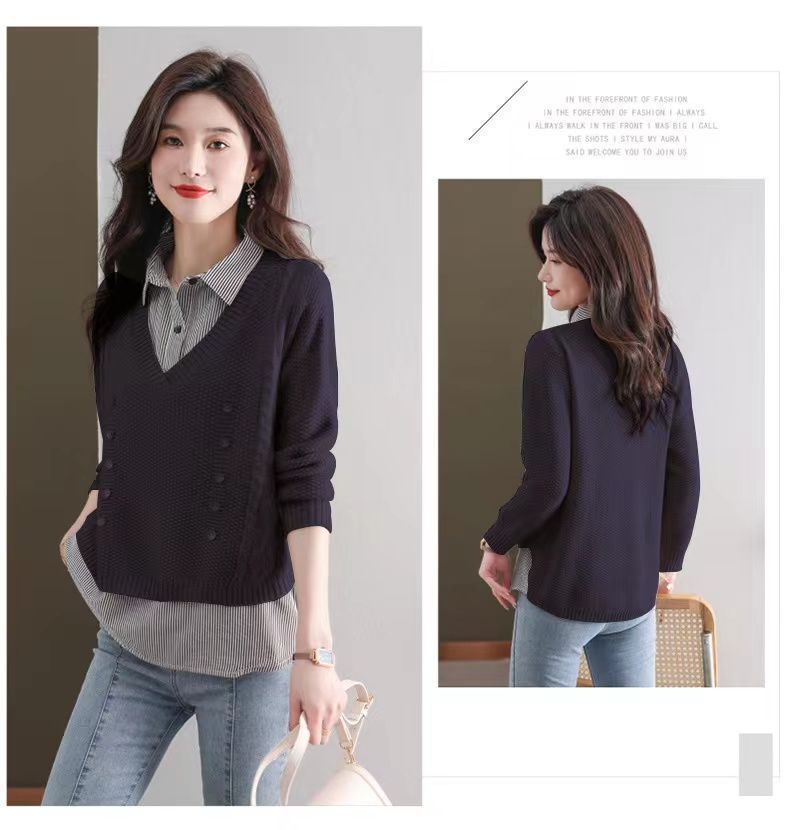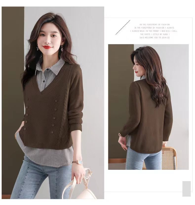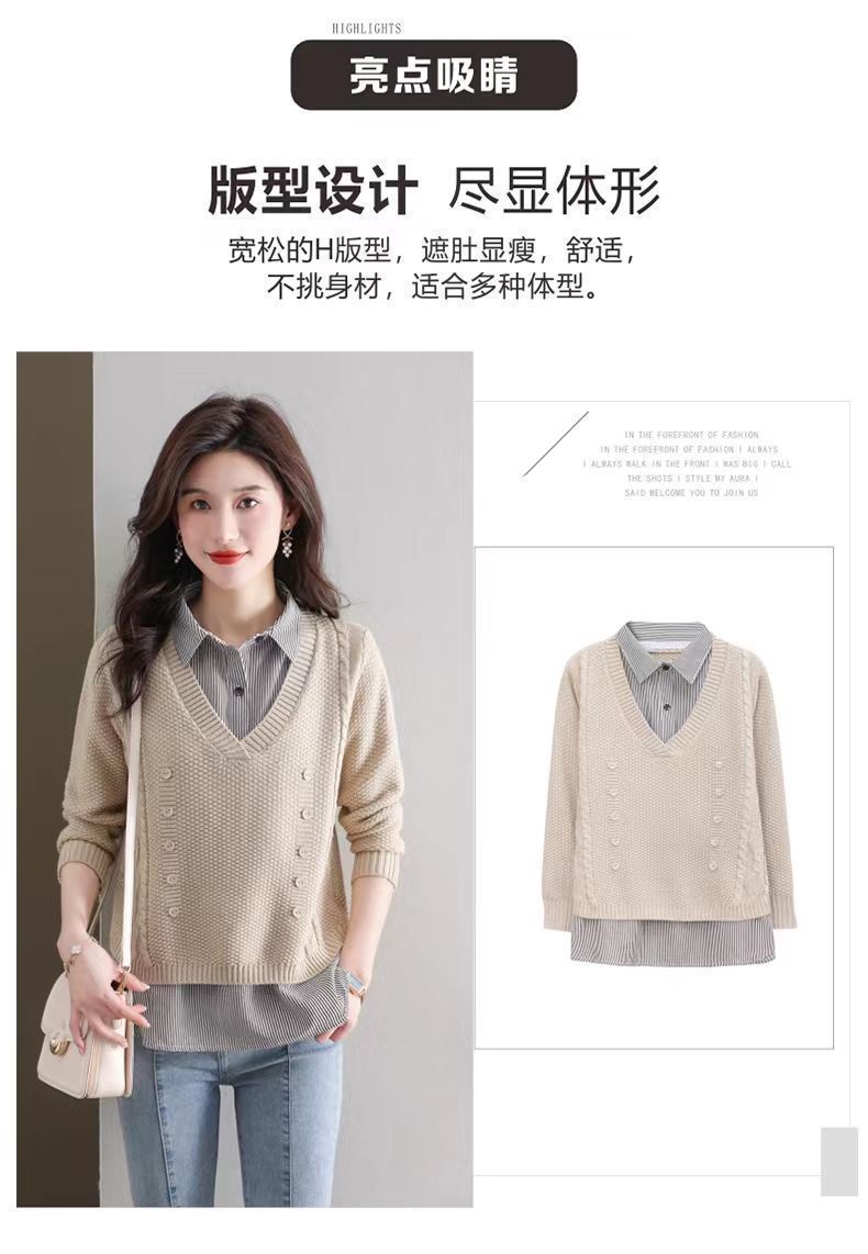 가을 겨울 여성용 가짜 투피스 스웨터, 새로운 스타일의 루즈한 이너 스플리싱 셔츠 칼라 탑, 아우터 니트 바텀 셔츠, 트렌디스토어 가기