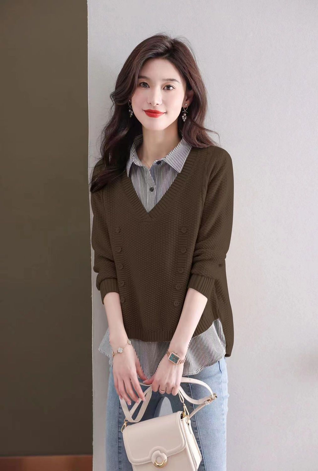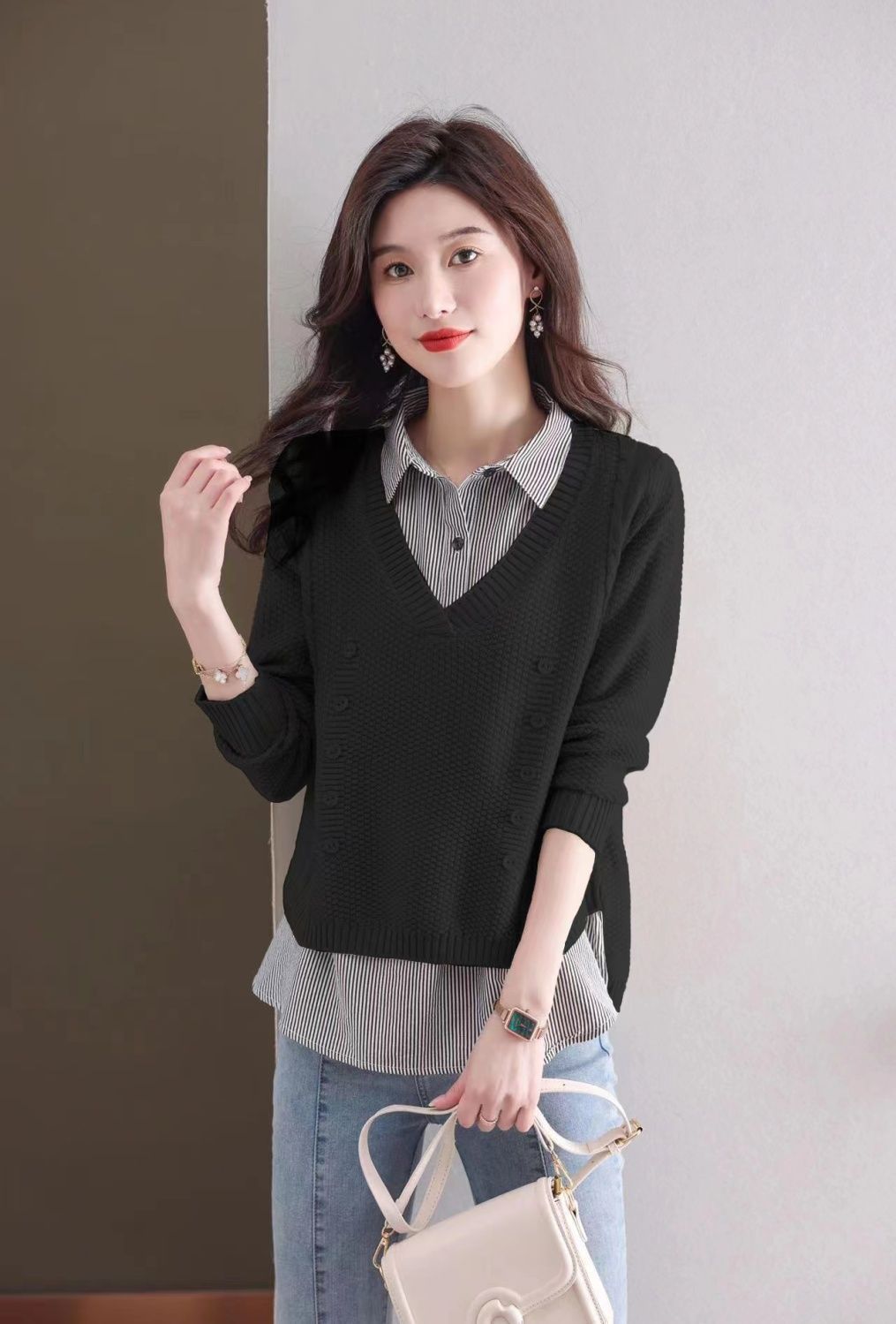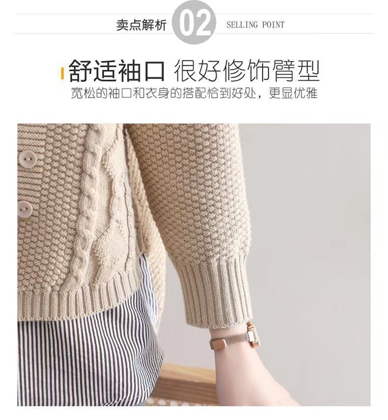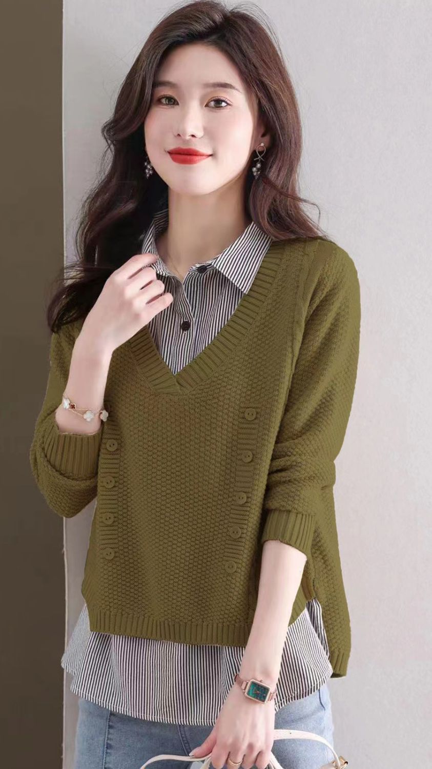 가을 겨울 여성용 가짜 투피스 스웨터, 새로운 스타일의 루즈한 이너 스플리싱 셔츠 칼라 탑, 아우터 니트 바텀 셔츠, 트렌디스토어 가기
