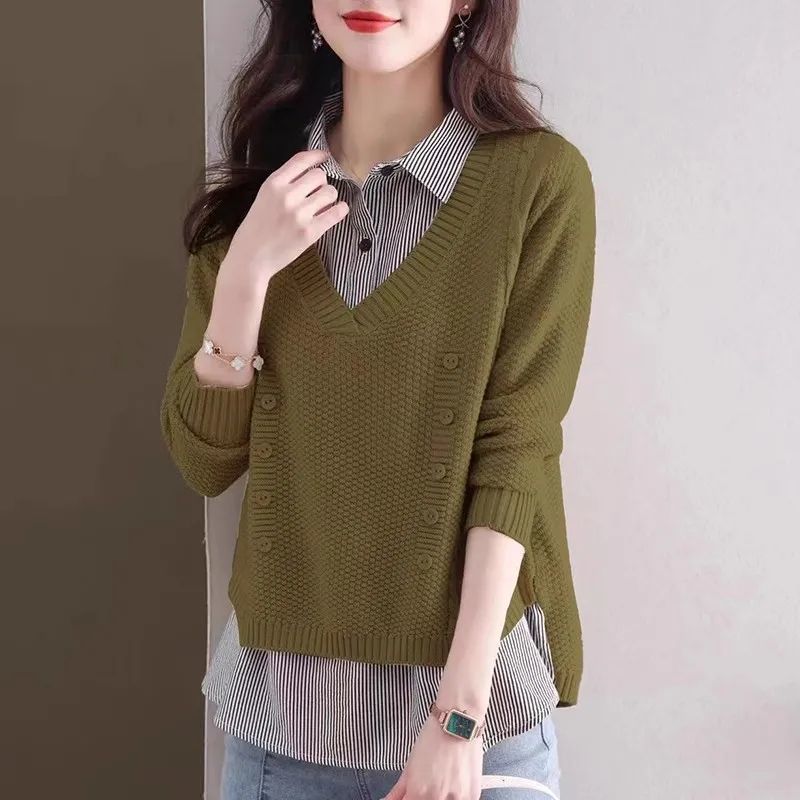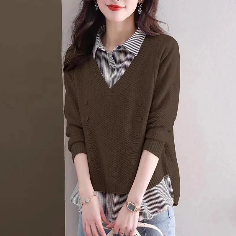 가을 겨울 여성용 가짜 투피스 스웨터, 새로운 스타일의 루즈한 이너 스플리싱 셔츠 칼라 탑, 아우터 니트 바텀 셔츠, 트렌디