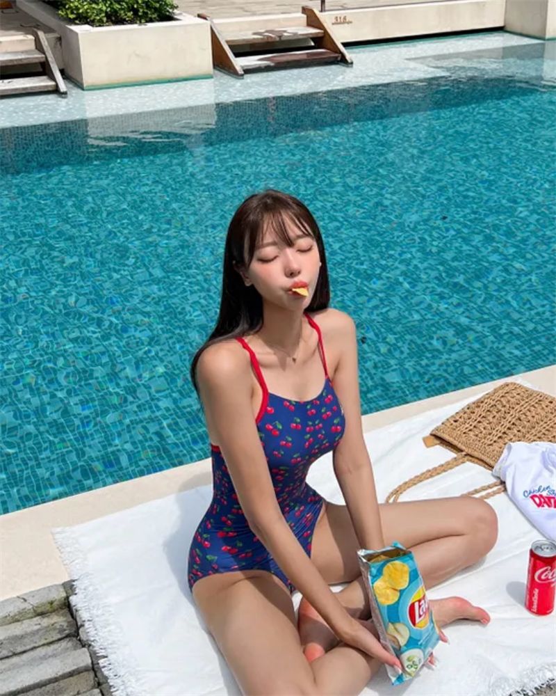 2024 새로운 스타일의 작은 신선한 소녀 체리 원피스 수영복 등이없는 하이 슬릿 피트니스 휴가 온천 수영복