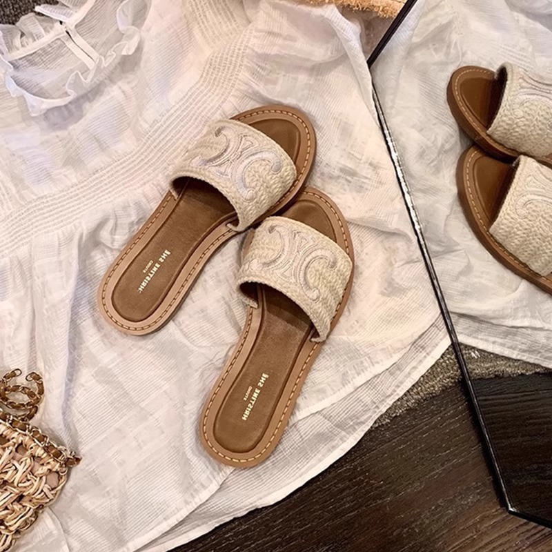 부드러운 가죽 버전 ~ 여름 아우터용 여성용 자수 트라이엄프 아치 스트랩 슬리퍼, 가죽 휴가 플랫 비치 샌들스토어 가기