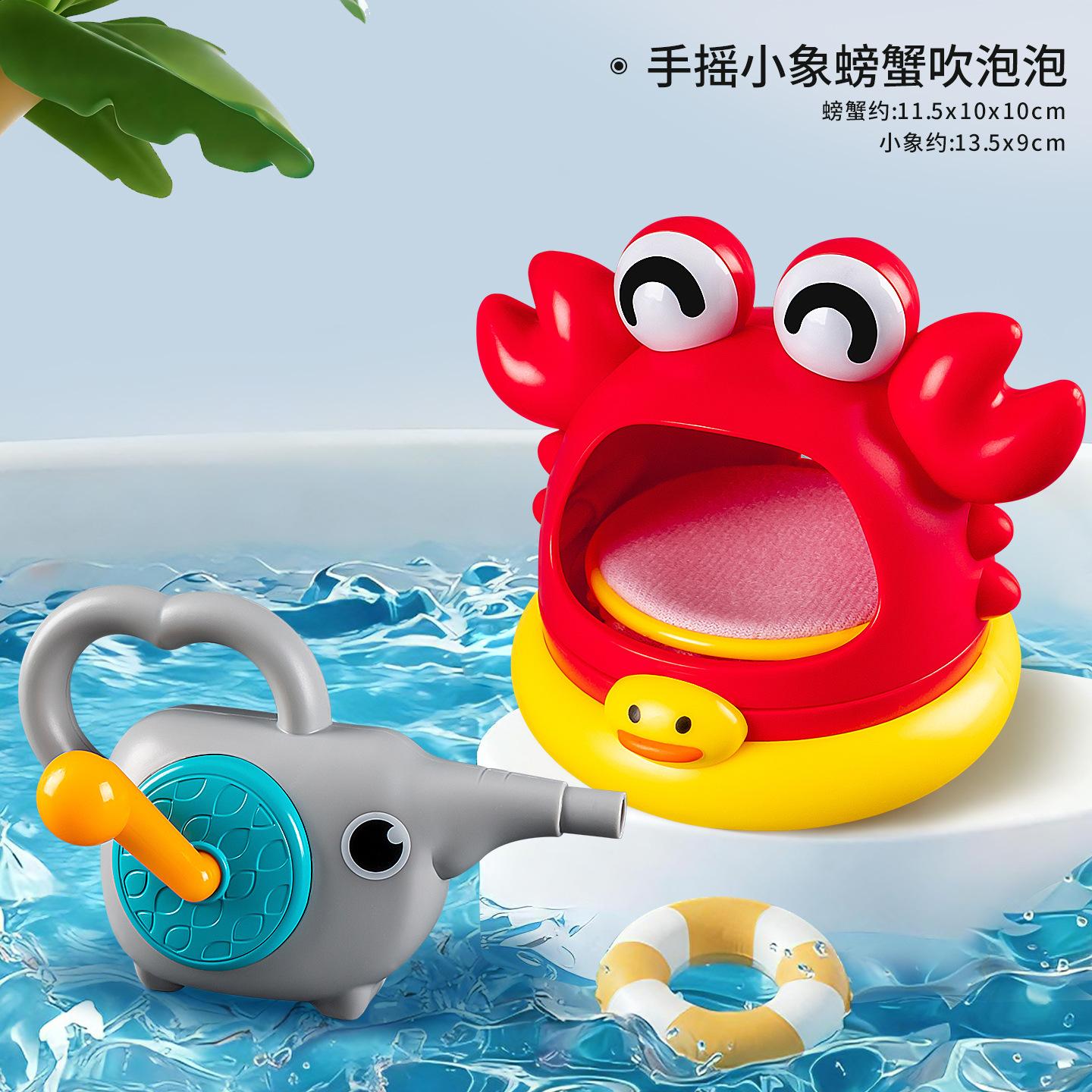 • YB1764 손으로 돌리는 아기 코끼리와 게가 거품을 불고 있습니다.