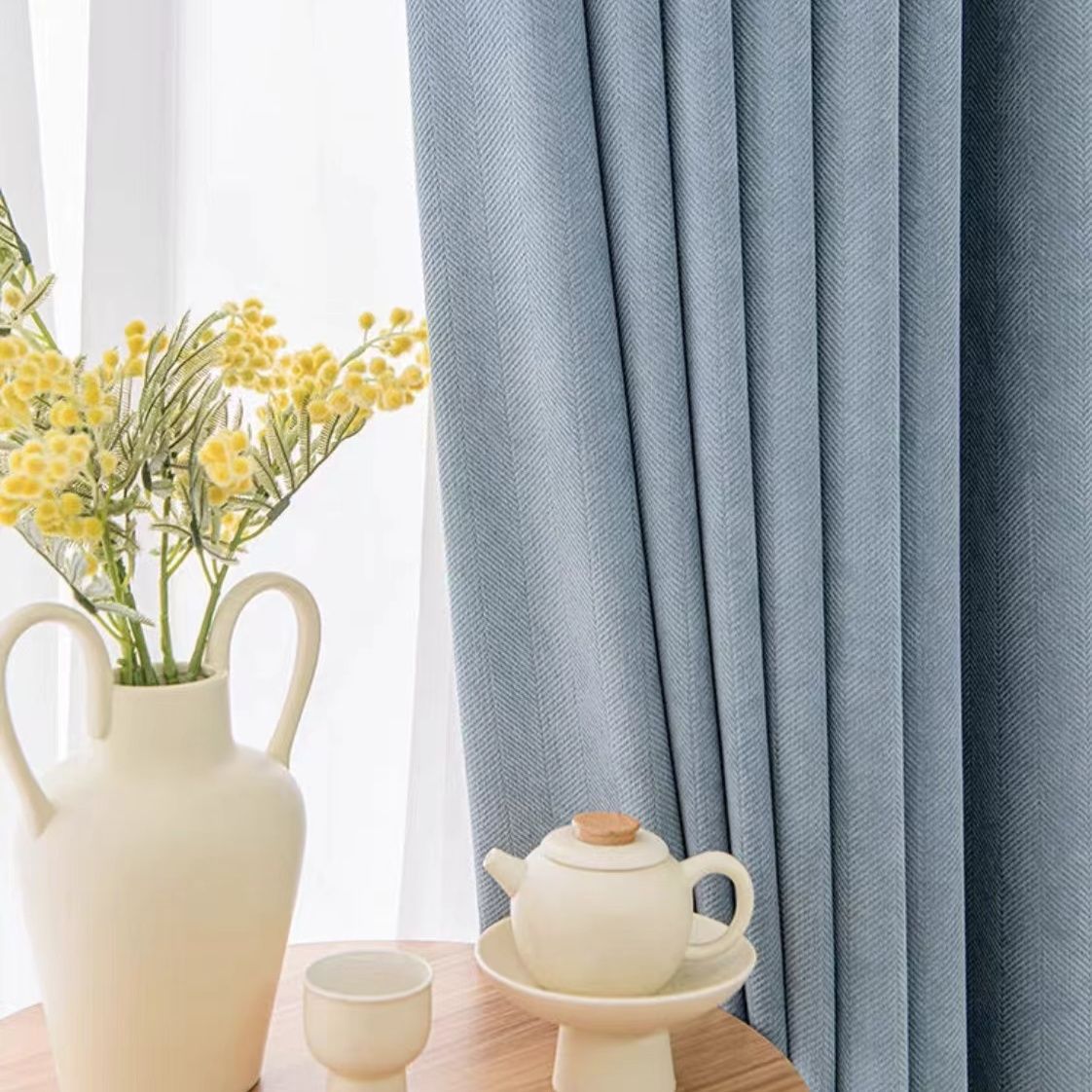 헤링본 셔닐 커튼 빛 차단 2025 새로운 스타일 ins 스타일 침실 거실 컬러 매칭 일본식 헤이즈 블루 코튼과 린넨스토어 가기