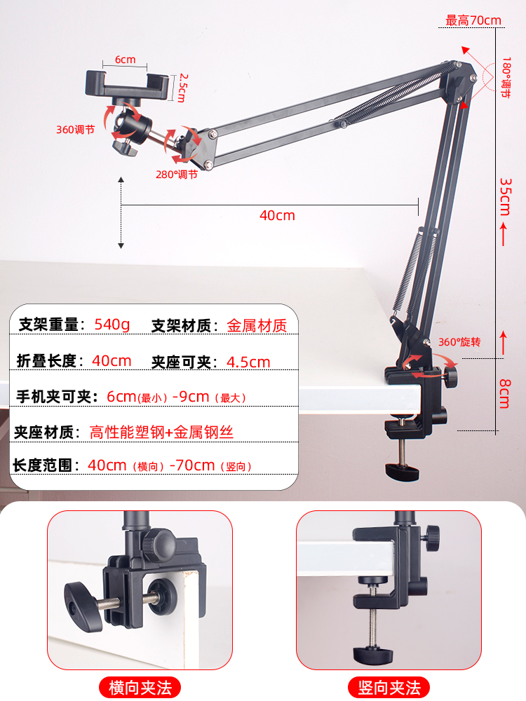 • 클램프 베이스 캔틸레버 + 팬/틸트 + 휴대폰 클램프