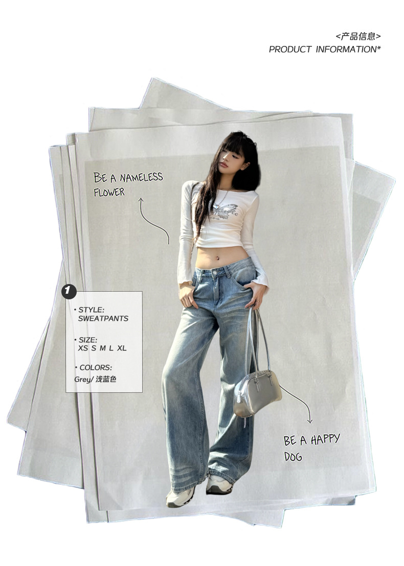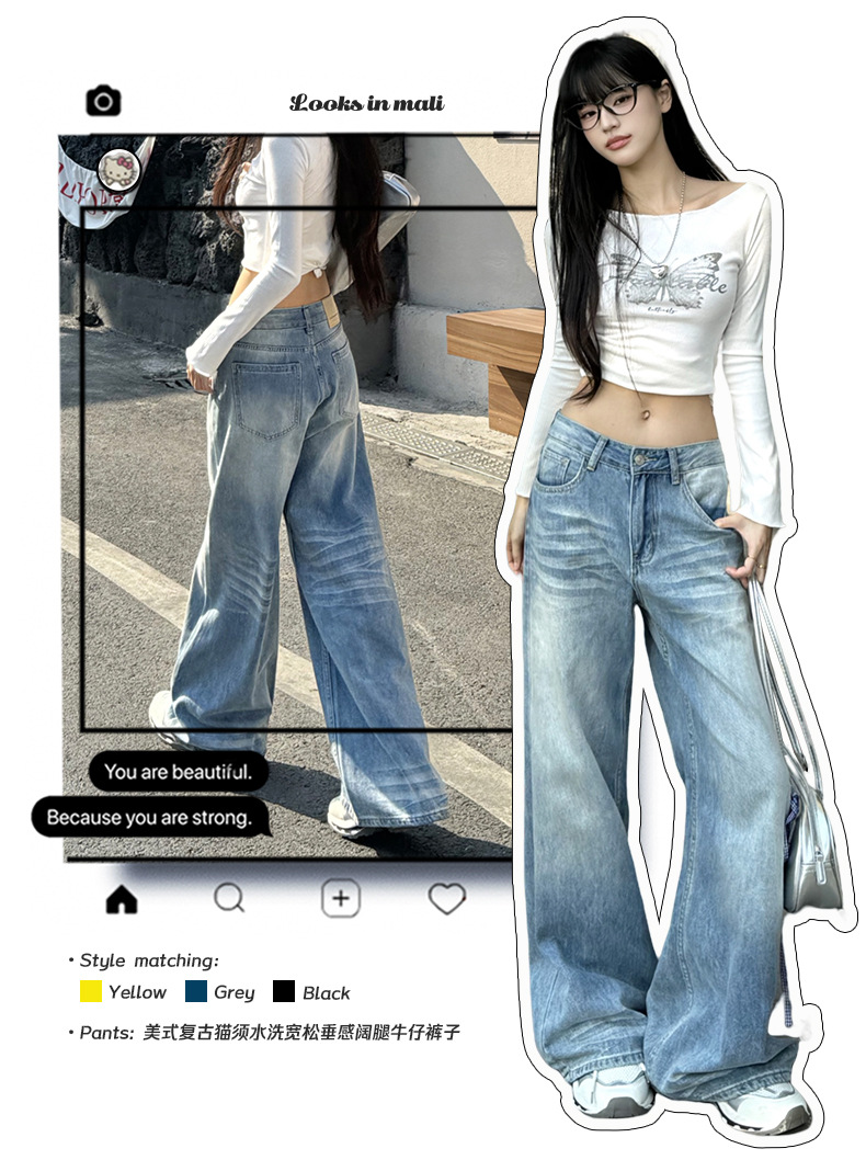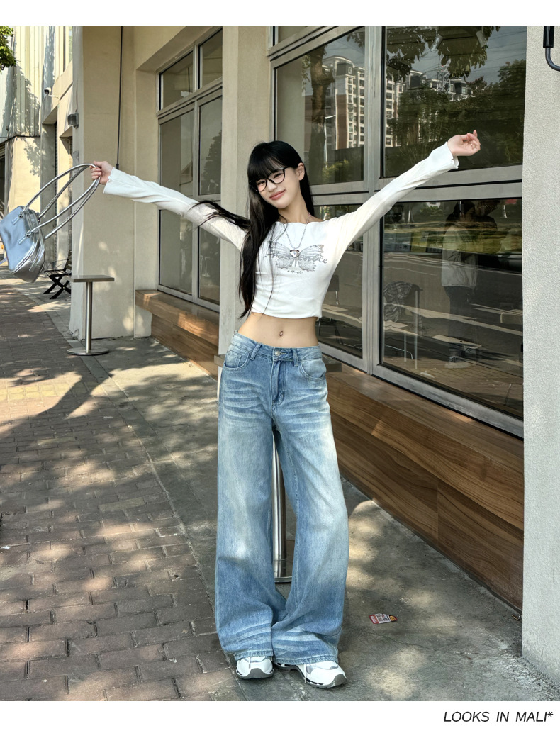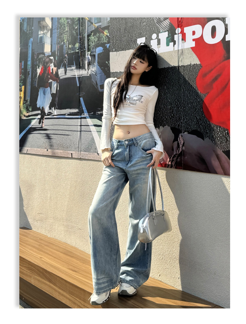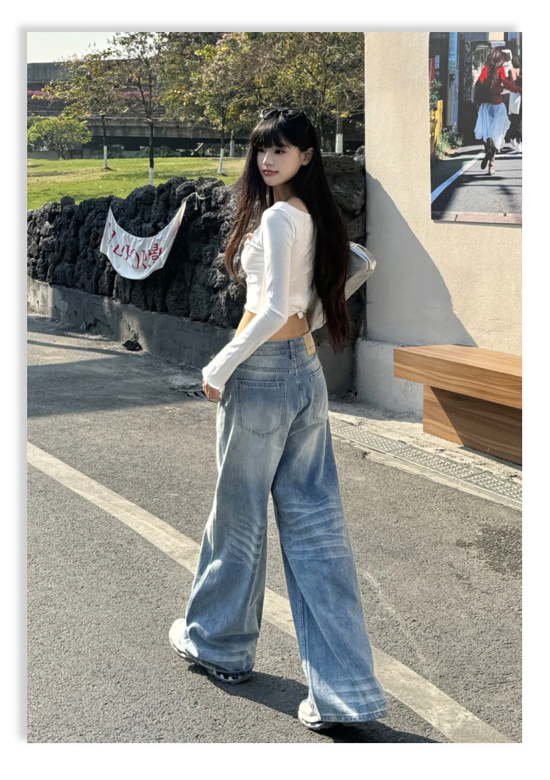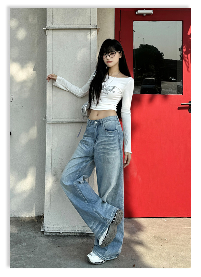 ZNZW 여성용 라이트 블루 청바지 2025 여성용 새로운 루즈 워시 올드 스크래치 하이 웨이스트 스트레이트 와이드 레그 팬츠