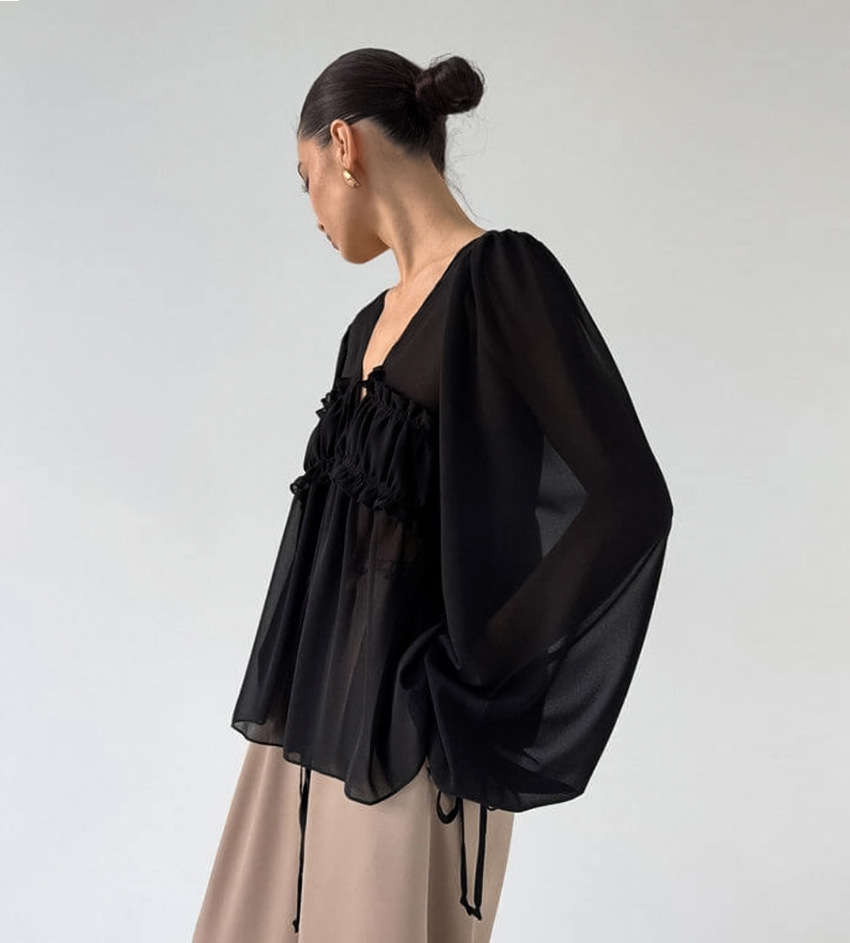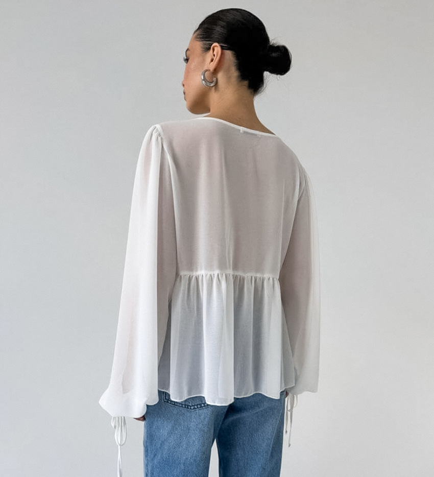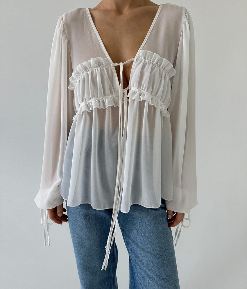 봄과 여름 유럽과 미국의 섹시한 다목적 흰색 쉬폰 프릴 루즈 캐주얼 핫 소녀 레이스 업 여성용 긴팔 통근 셔츠스토어 가기