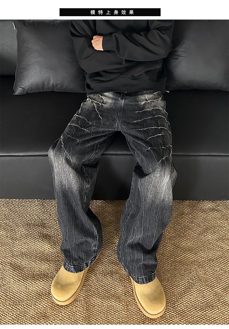 가을에 멋진 남성을 위한 아메리칸 하이 스트리트 블랙 번개 패턴 청바지, 고급 워싱 레트로 스트레이트 레그 마이크로 플레어 바지스토어 가기