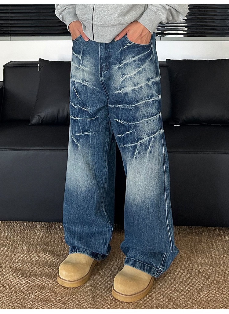 가을에 멋진 남성을 위한 아메리칸 하이 스트리트 블랙 번개 패턴 청바지, 고급 워싱 레트로 스트레이트 레그 마이크로 플레어 바지