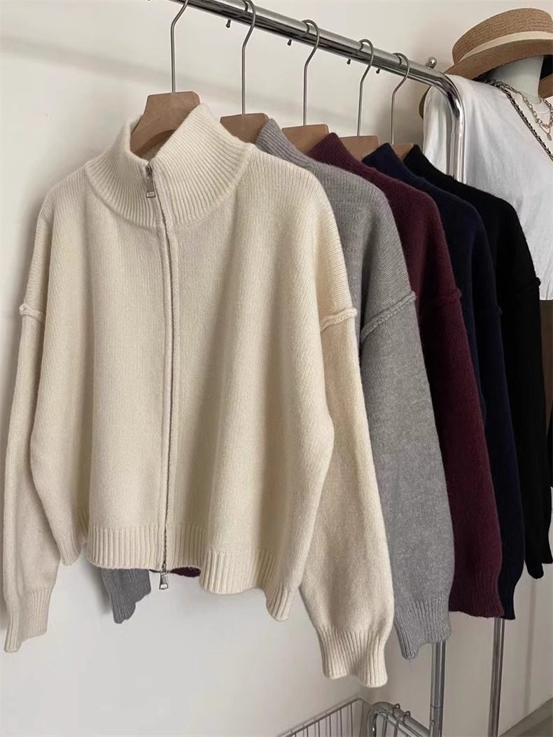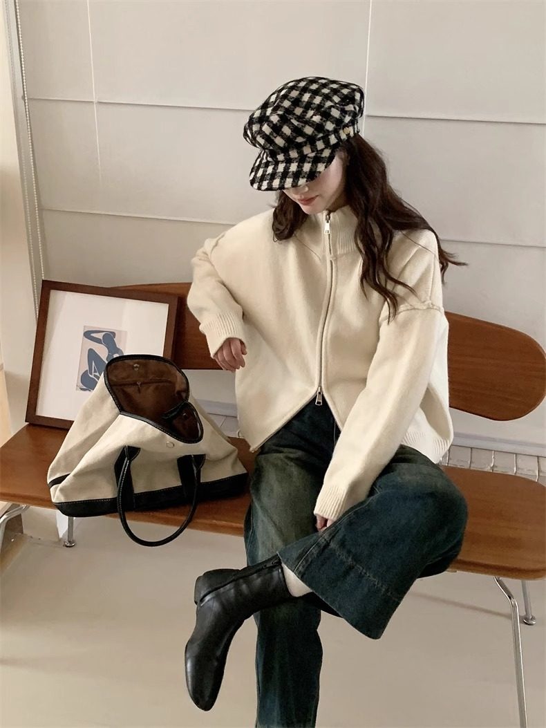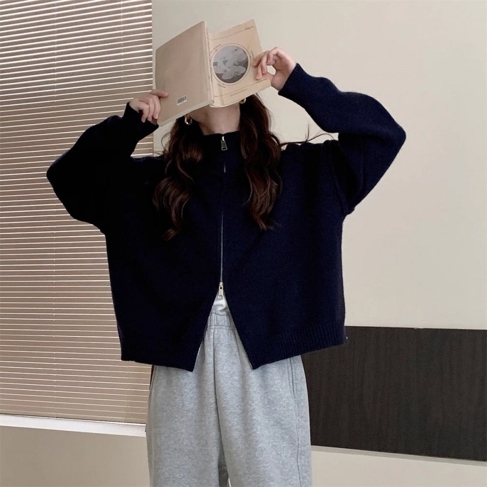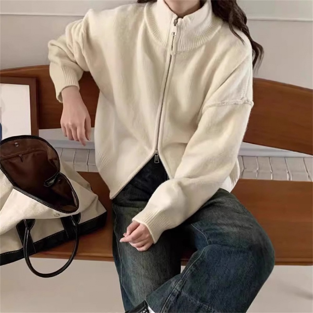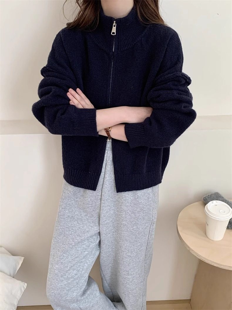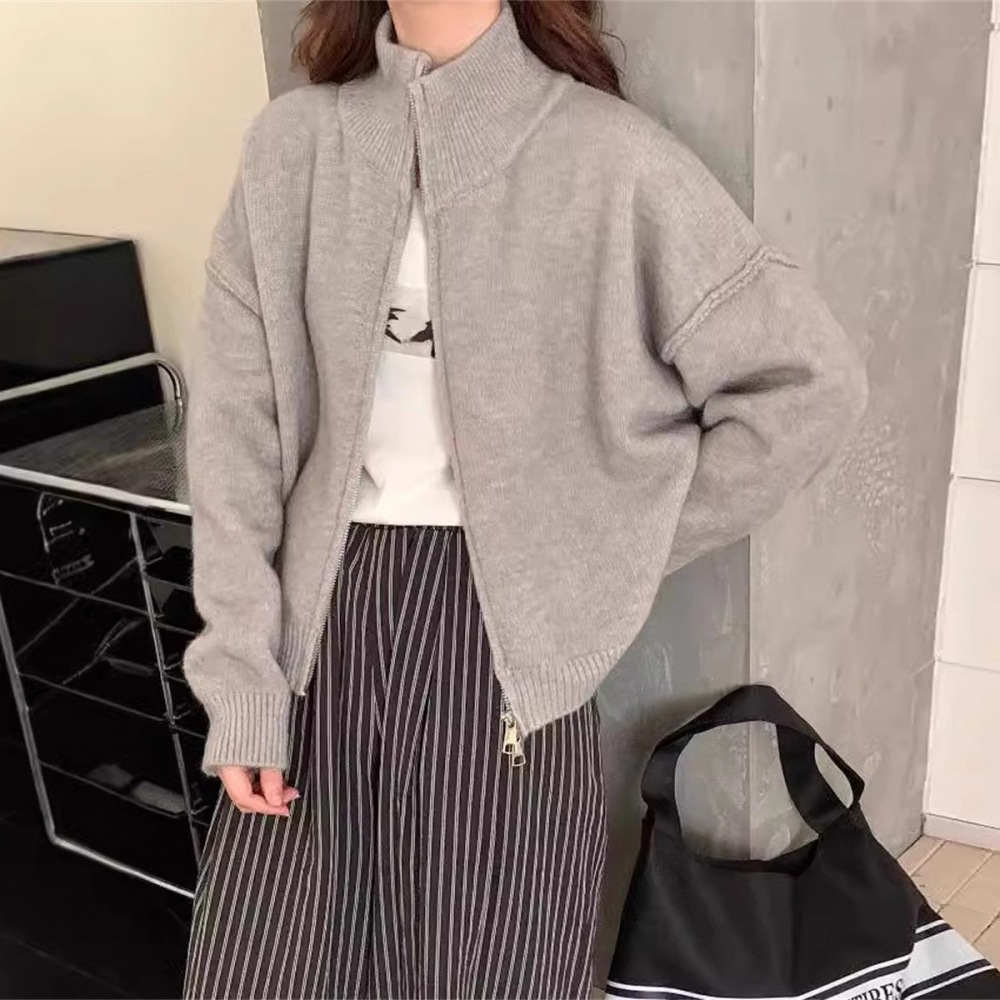 여성을위한 새로운 가을, 겨울 더블 지퍼 스웨터 재킷 여성을위한 두꺼운 한국 스타일 스탠드 칼라 캐주얼 디자인 짧은 니트 카디건