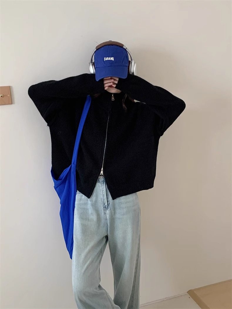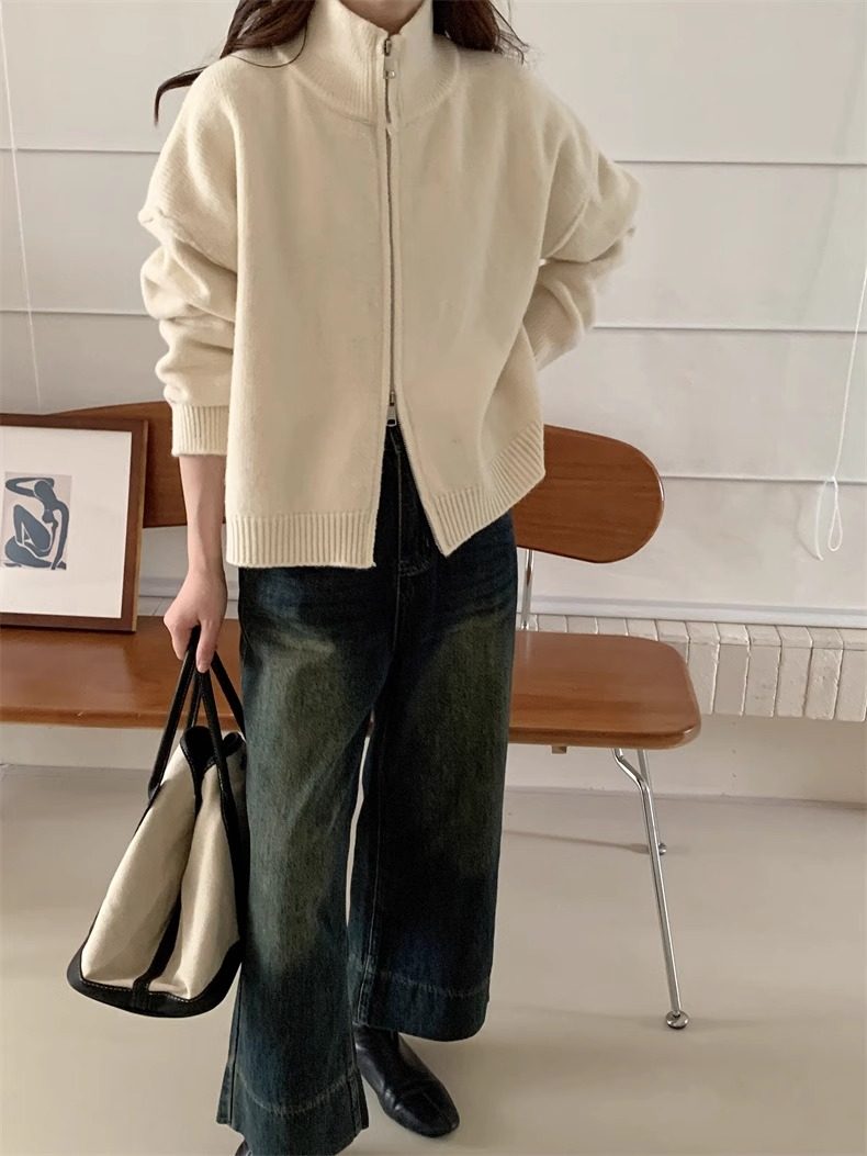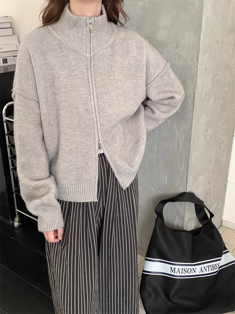 여성을위한 새로운 가을, 겨울 더블 지퍼 스웨터 재킷 여성을위한 두꺼운 한국 스타일 스탠드 칼라 캐주얼 디자인 짧은 니트 카디건스토어 가기