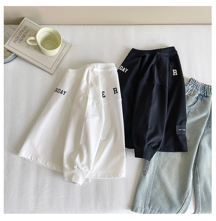 바람의 계곡 2025 가을 신작 아동복 아동 한국어 버전 소년 소녀용 다용도 문자 티셔츠, 멋진 루즈한 바닥