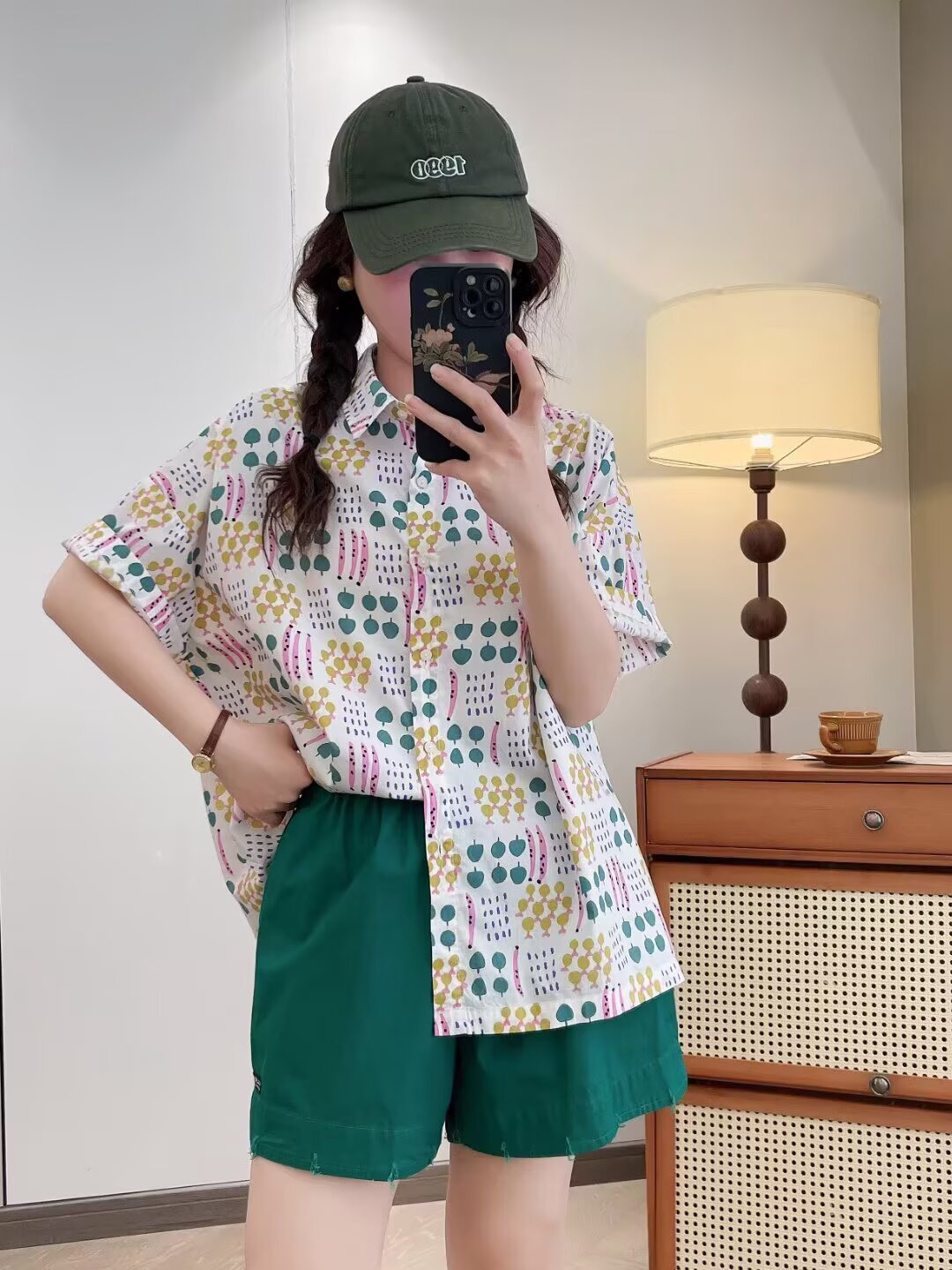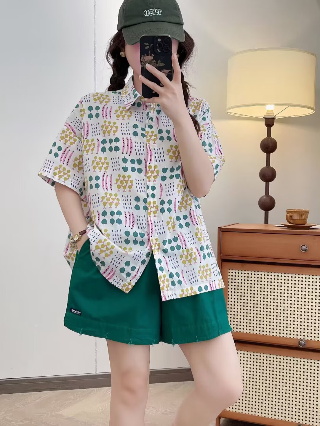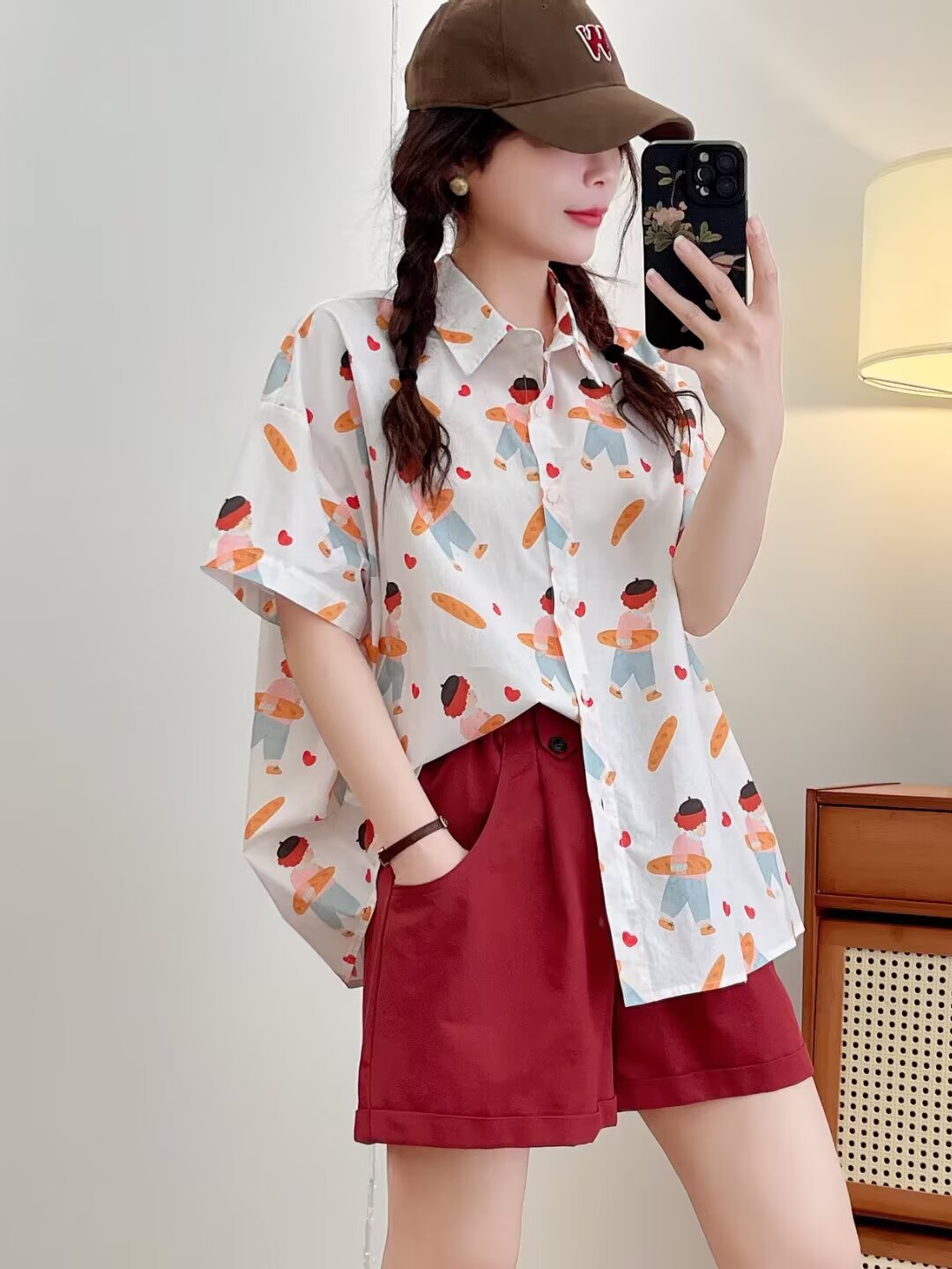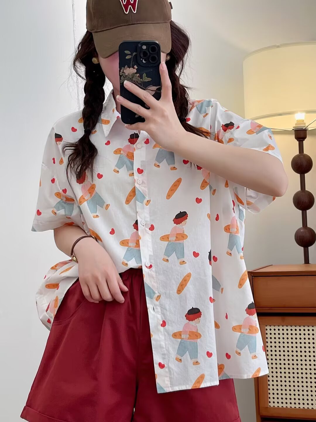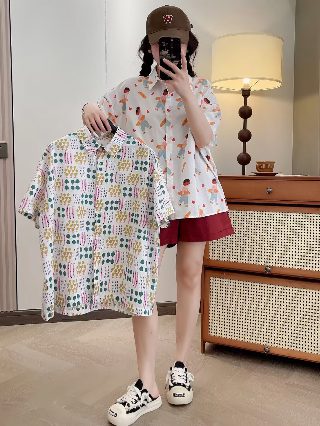 2025 여름 신작 예술적 어린이 프린트 루즈 라펠 다용도 반팔 셔츠 여성 캐주얼 셔츠스토어 가기