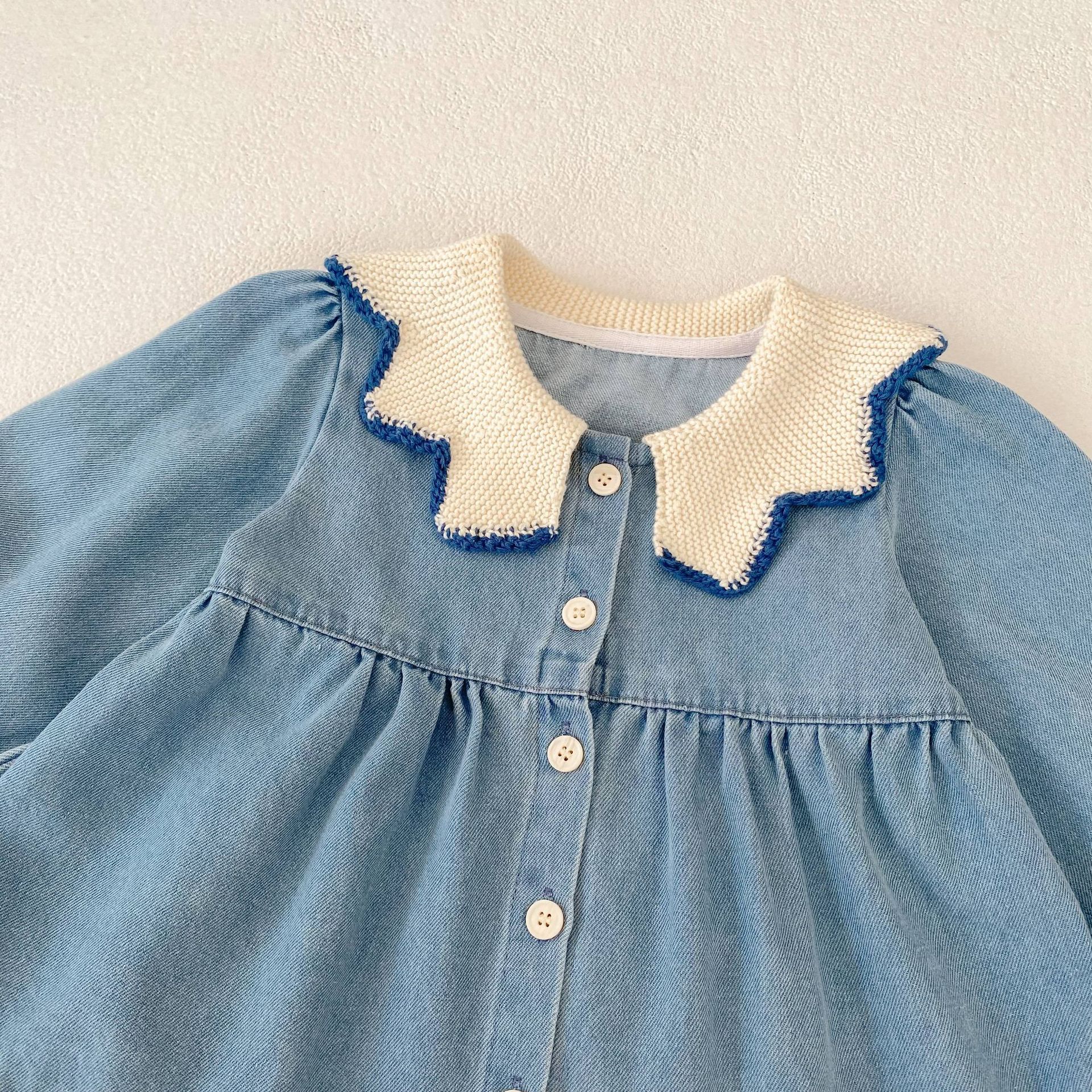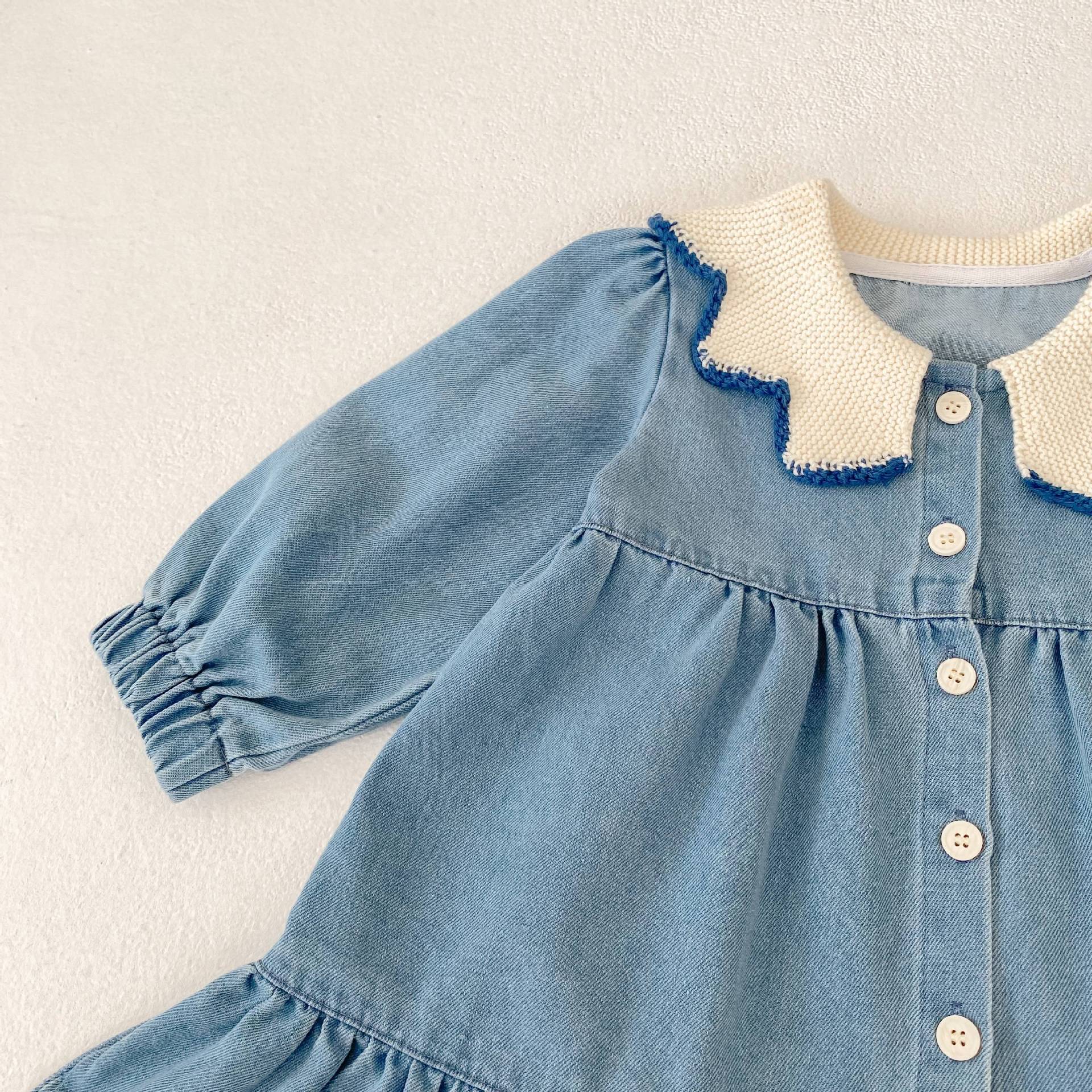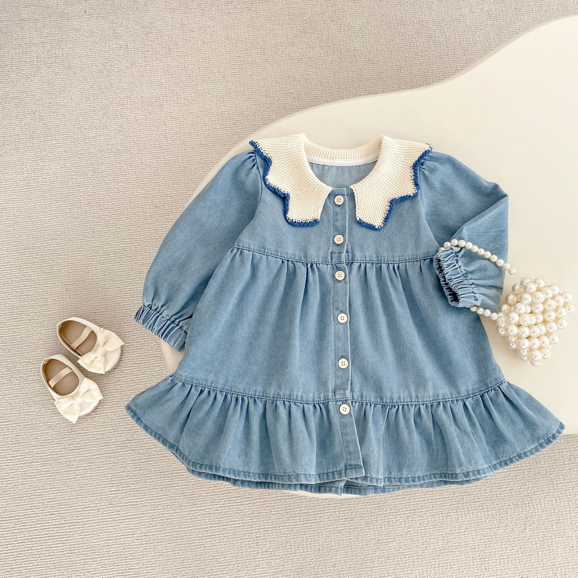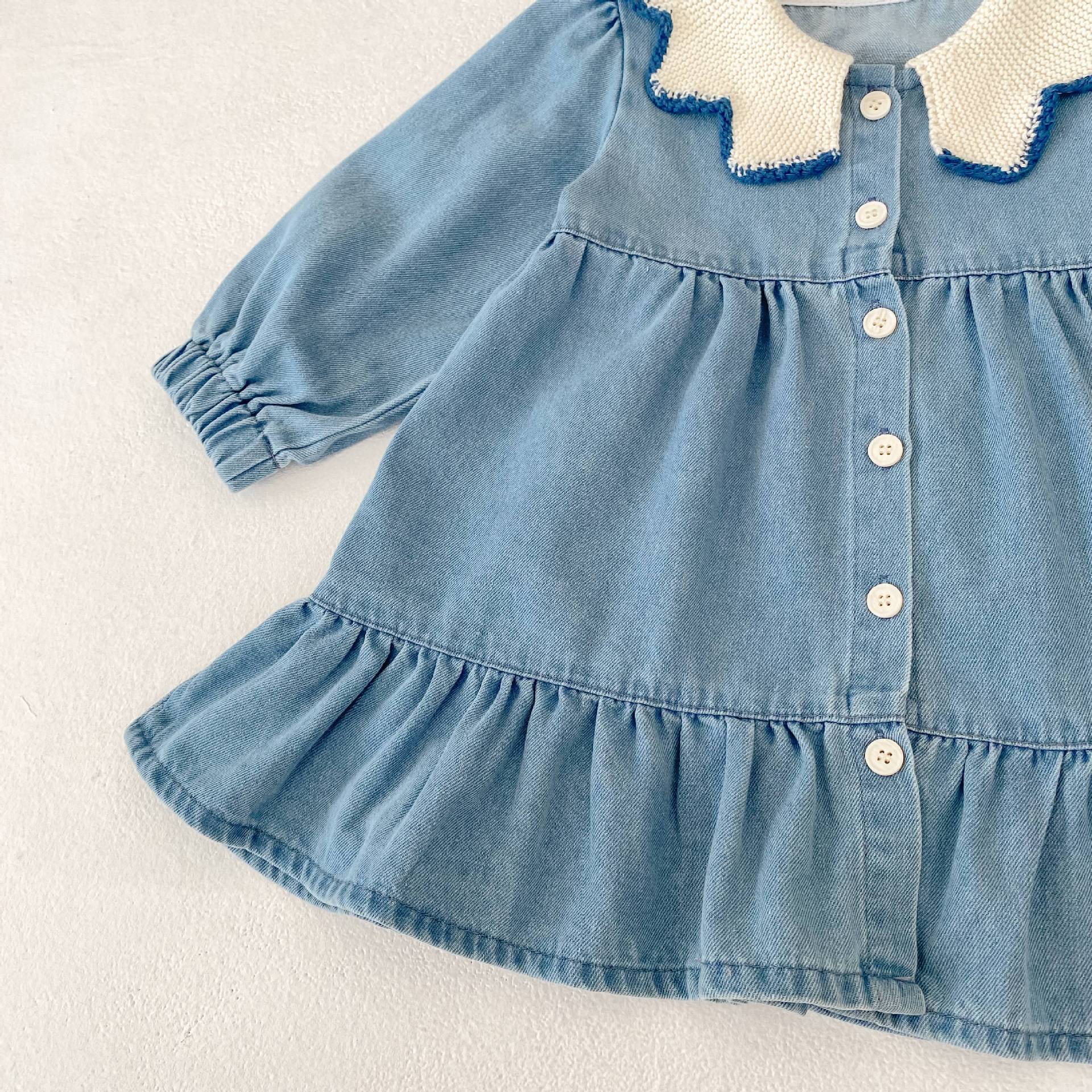 2025 가을 한국 스타일 유아 소녀 블루 모직 칼라 데님 스커트 카디건 긴팔 스타일 드레스