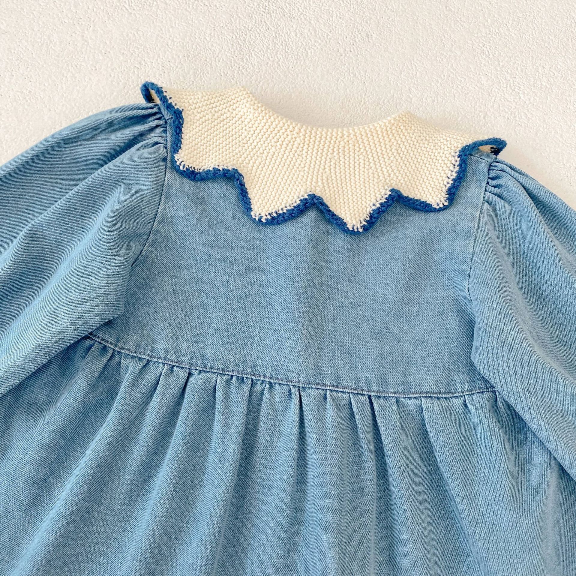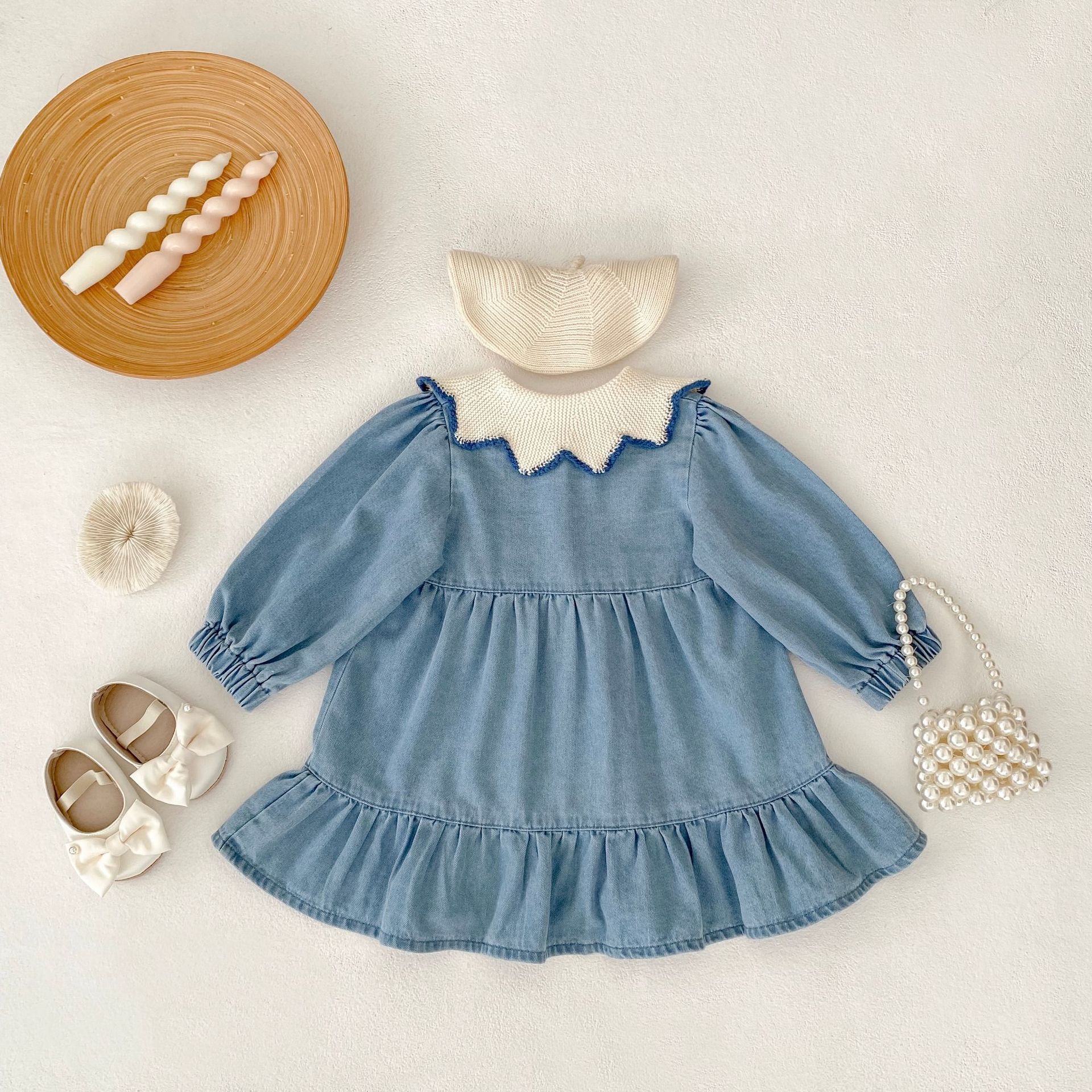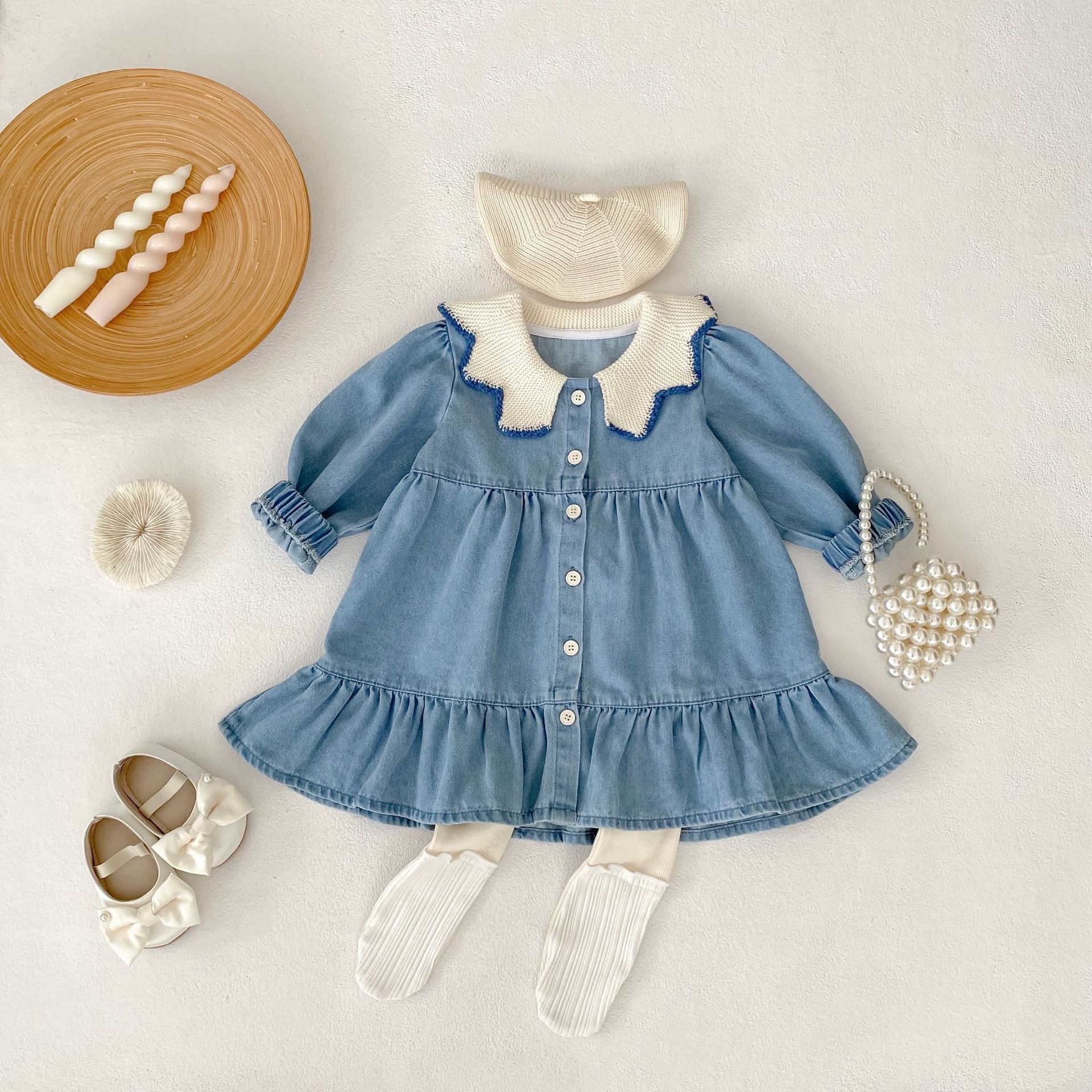 2025 가을 한국 스타일 유아 소녀 블루 모직 칼라 데님 스커트 카디건 긴팔 스타일 드레스