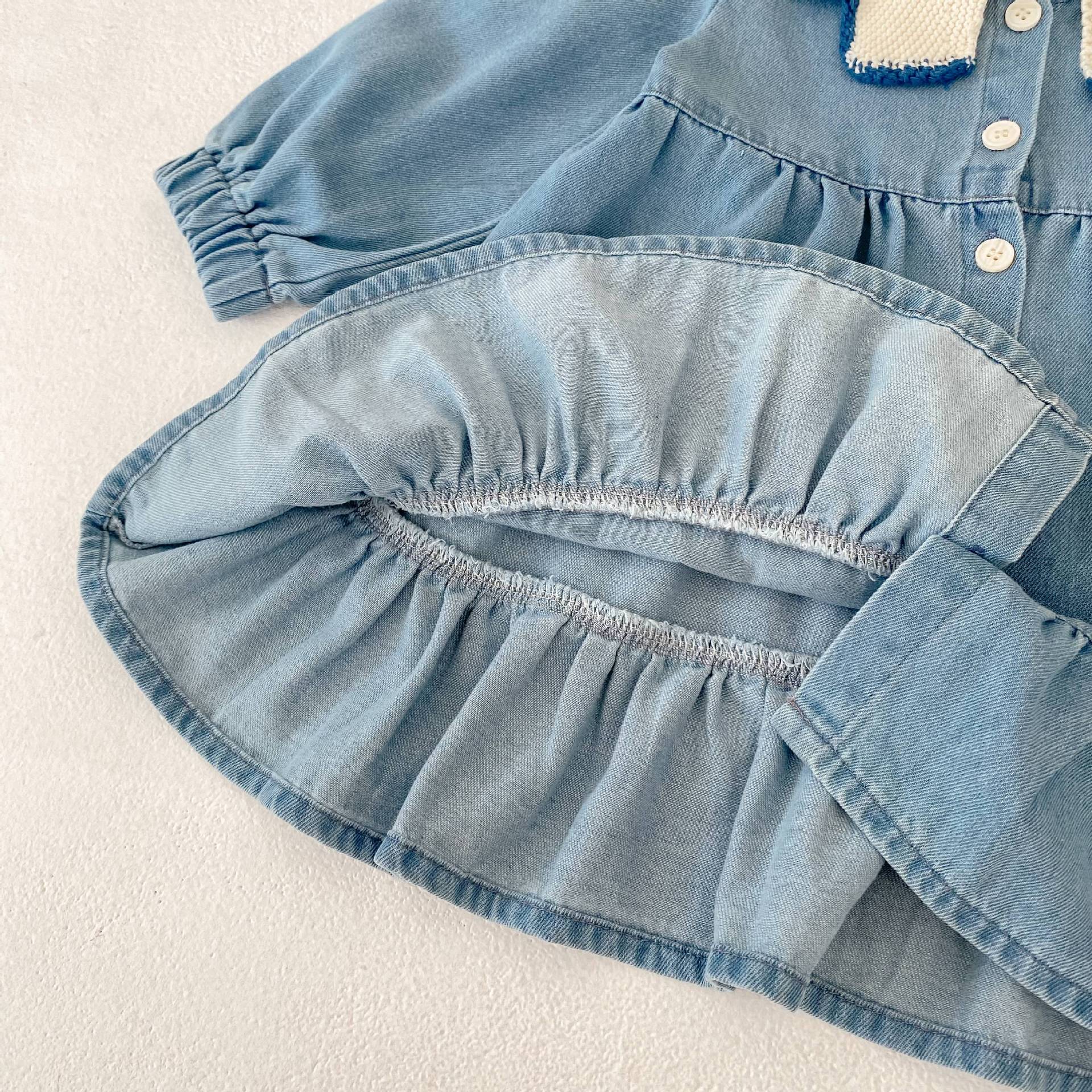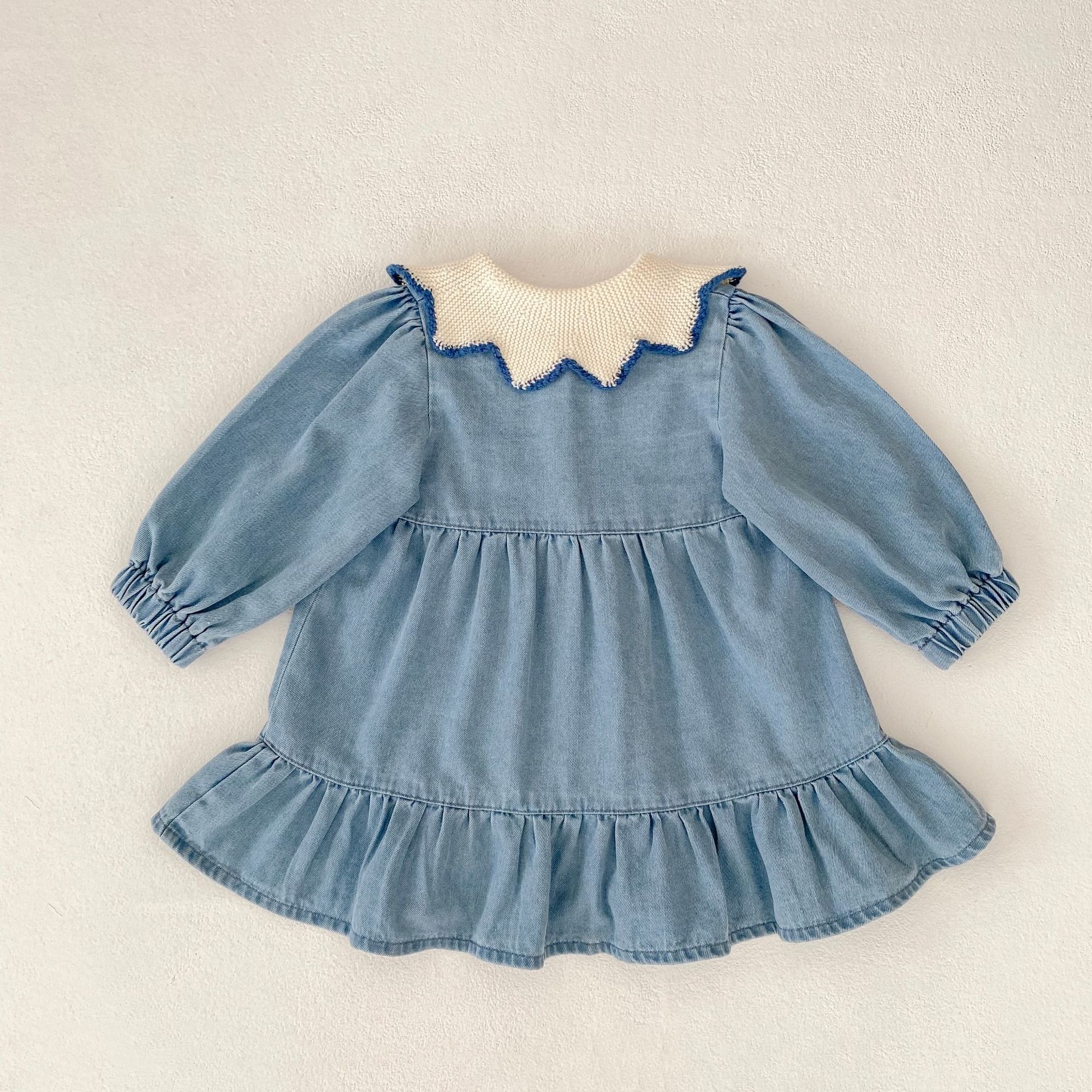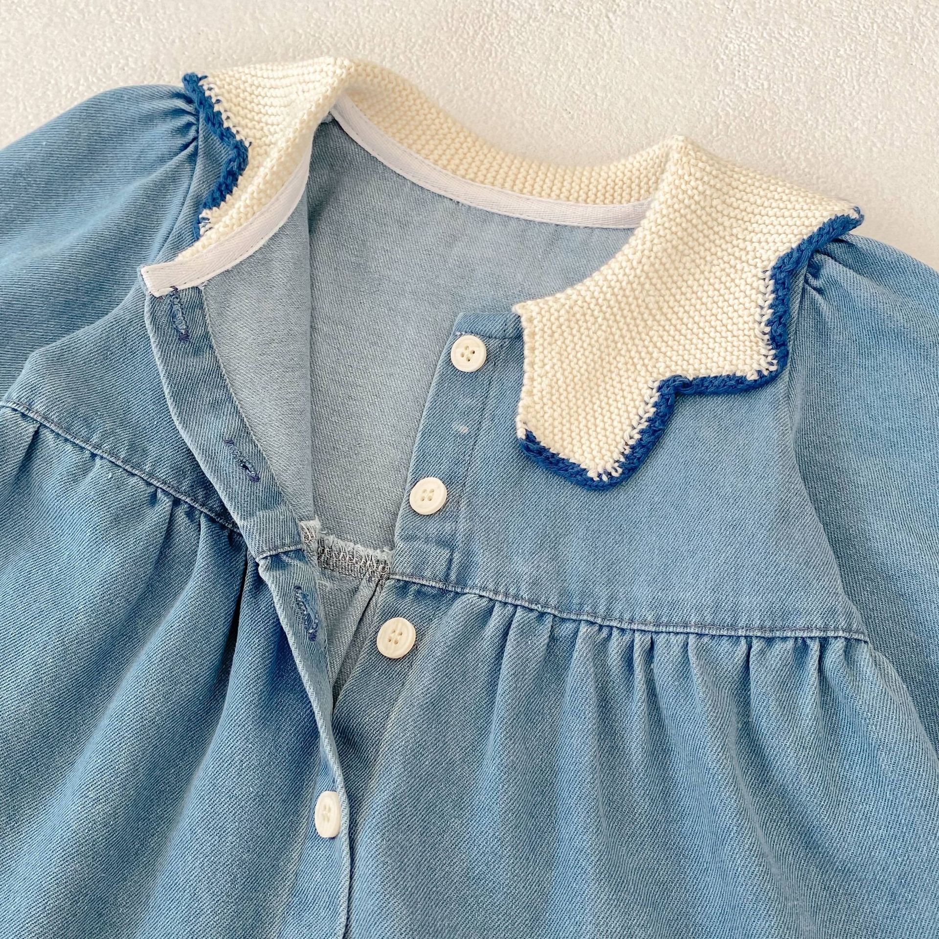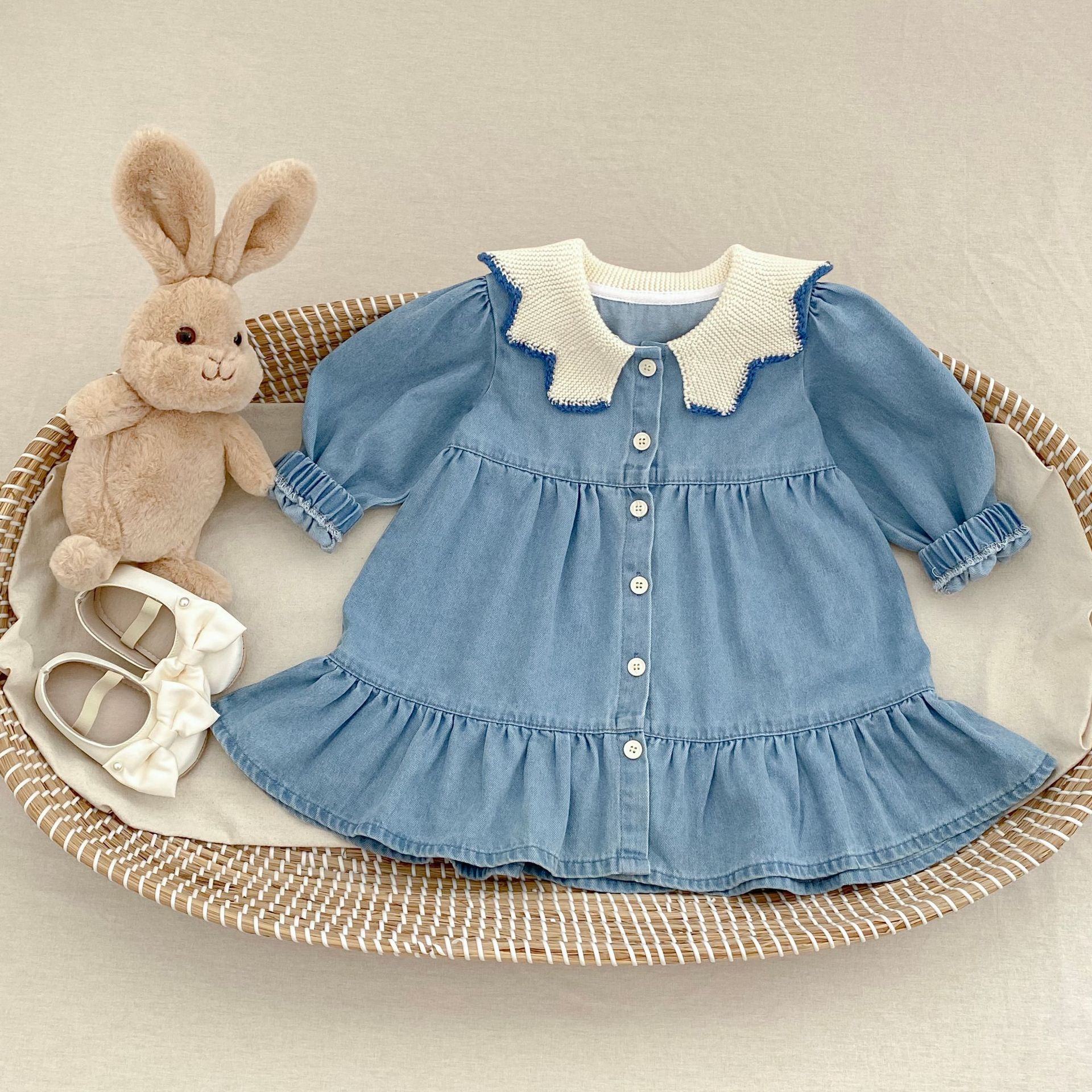 2025 가을 한국 스타일 유아 소녀 블루 모직 칼라 데님 스커트 카디건 긴팔 스타일 드레스