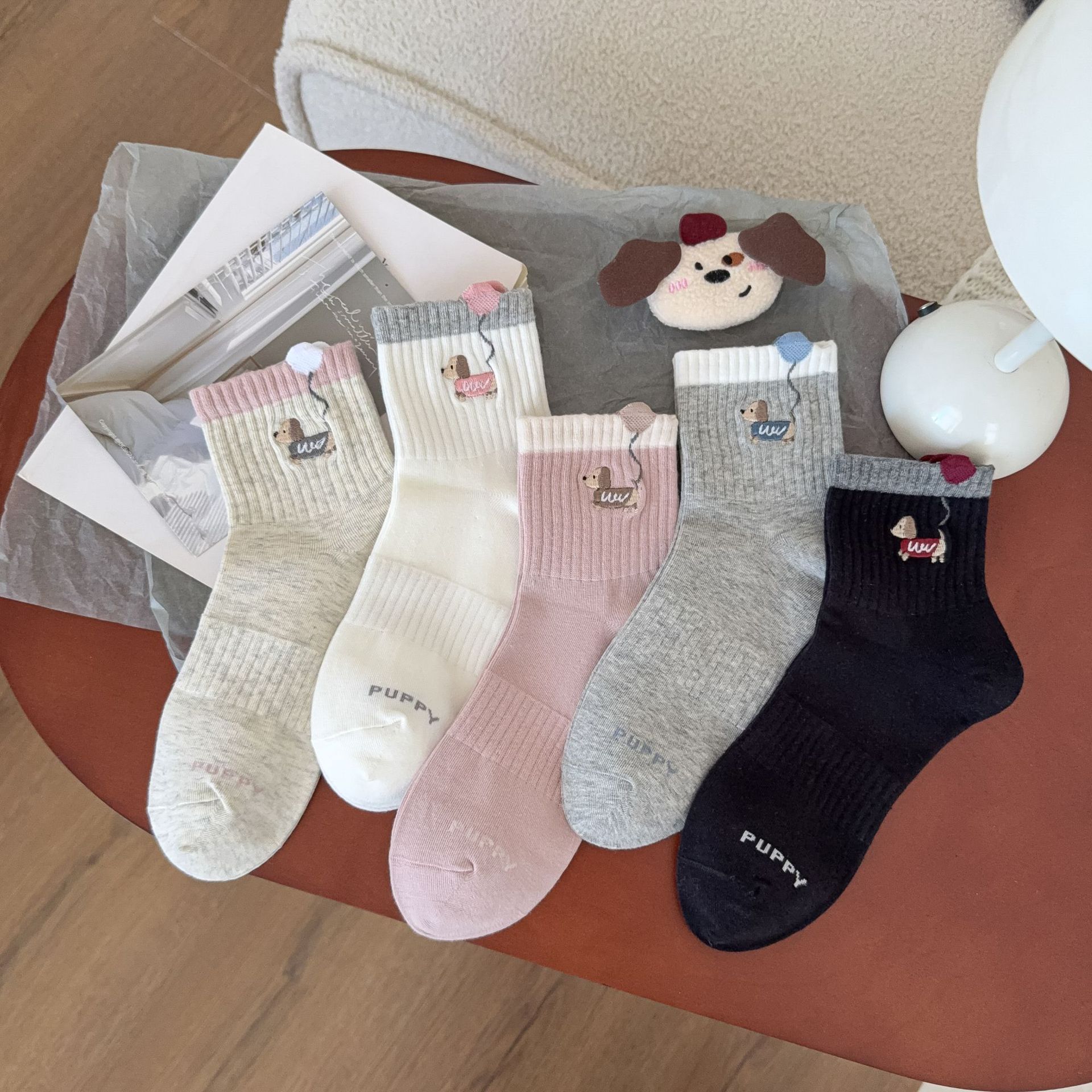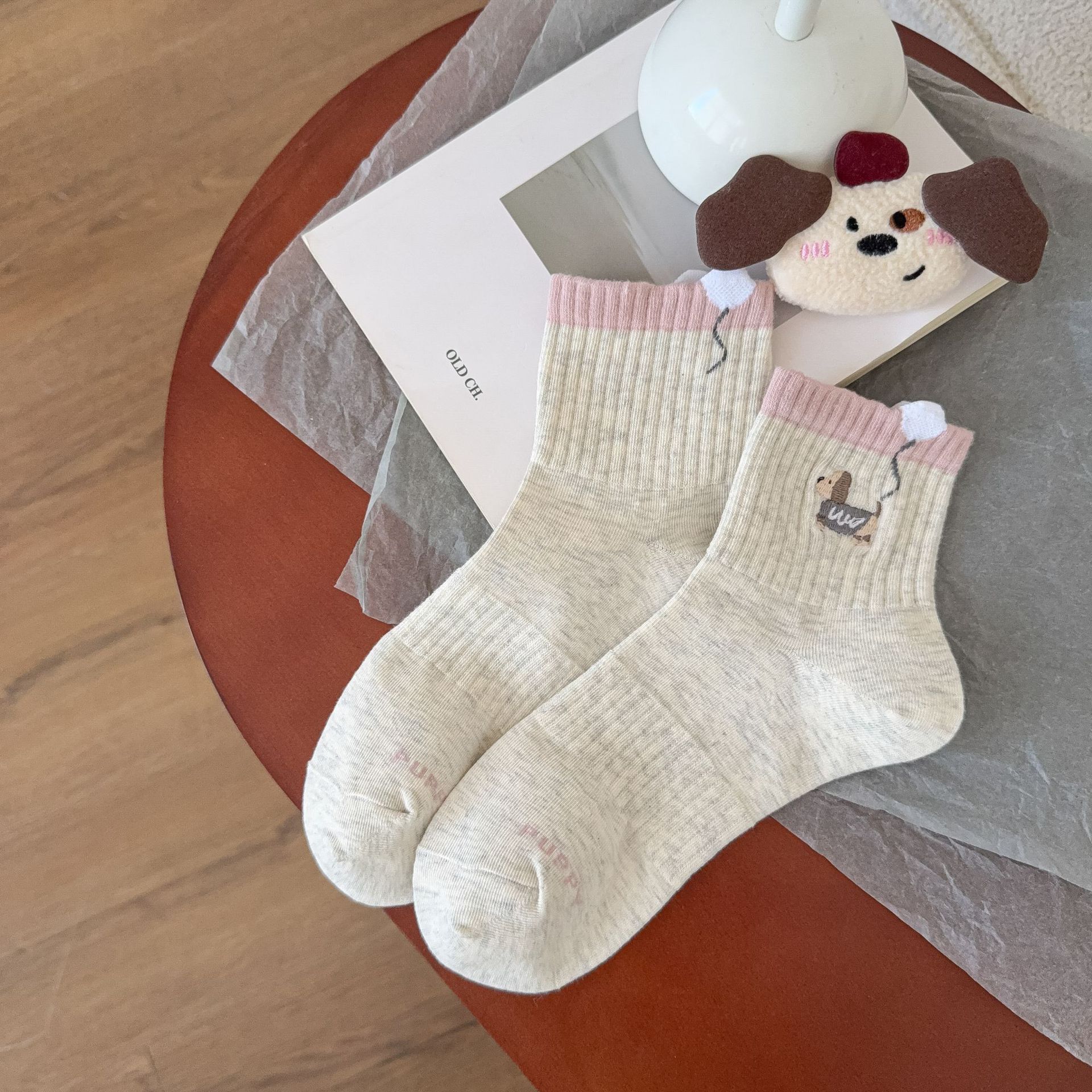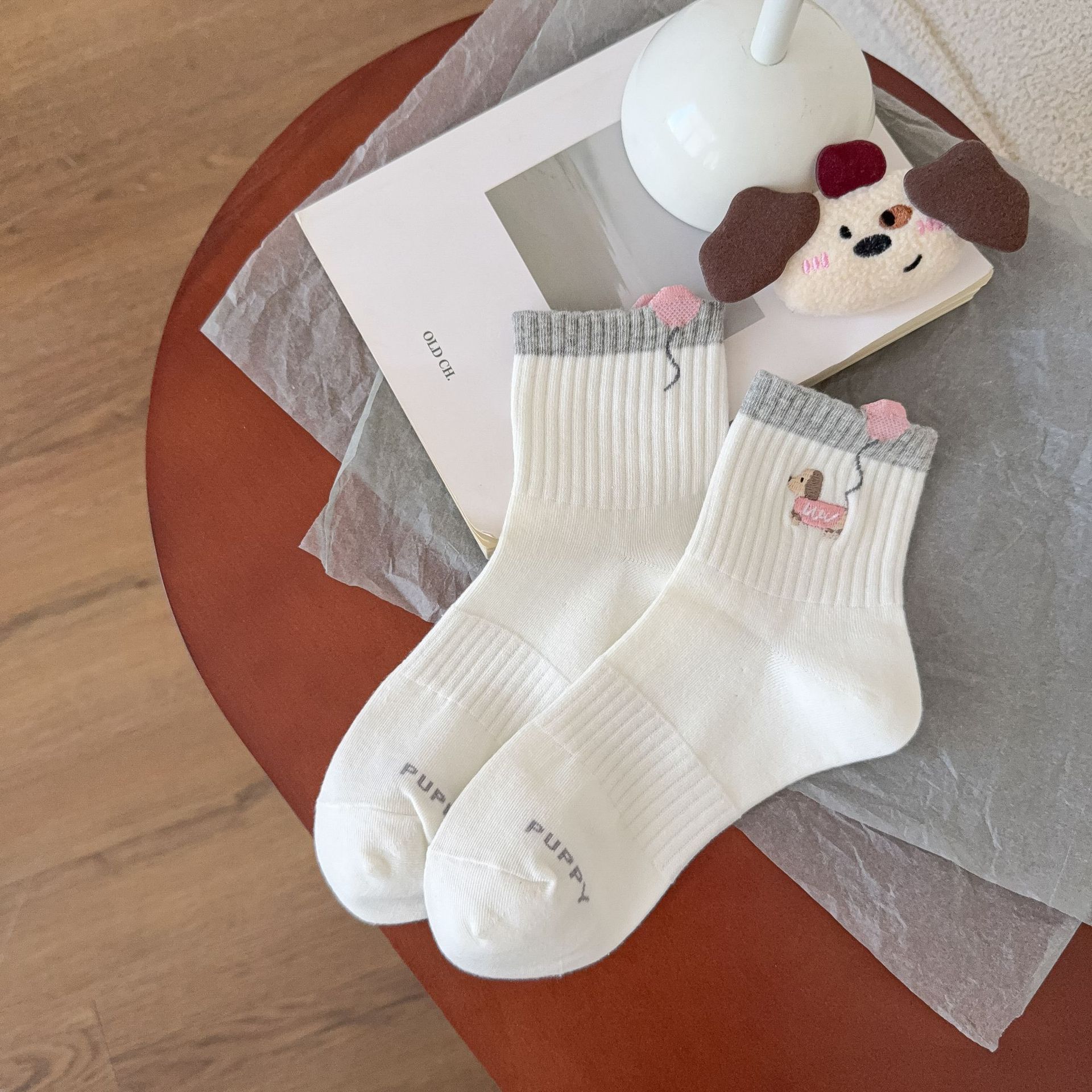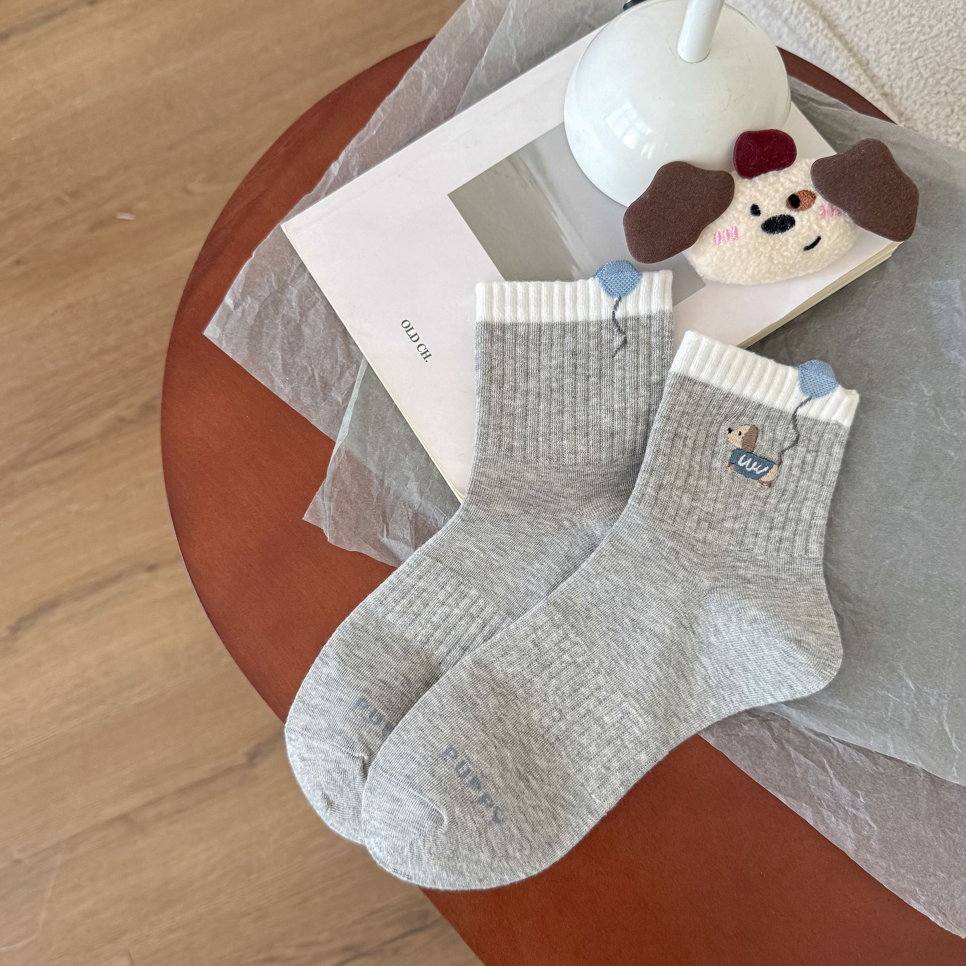 Little Tea Life 25 가을 겨울 양말 여성용 종아리 중간 양말 귀여운 강아지 자수 만화 풍선 다용도 대비 색상 미끄럼 방지스토어 가기