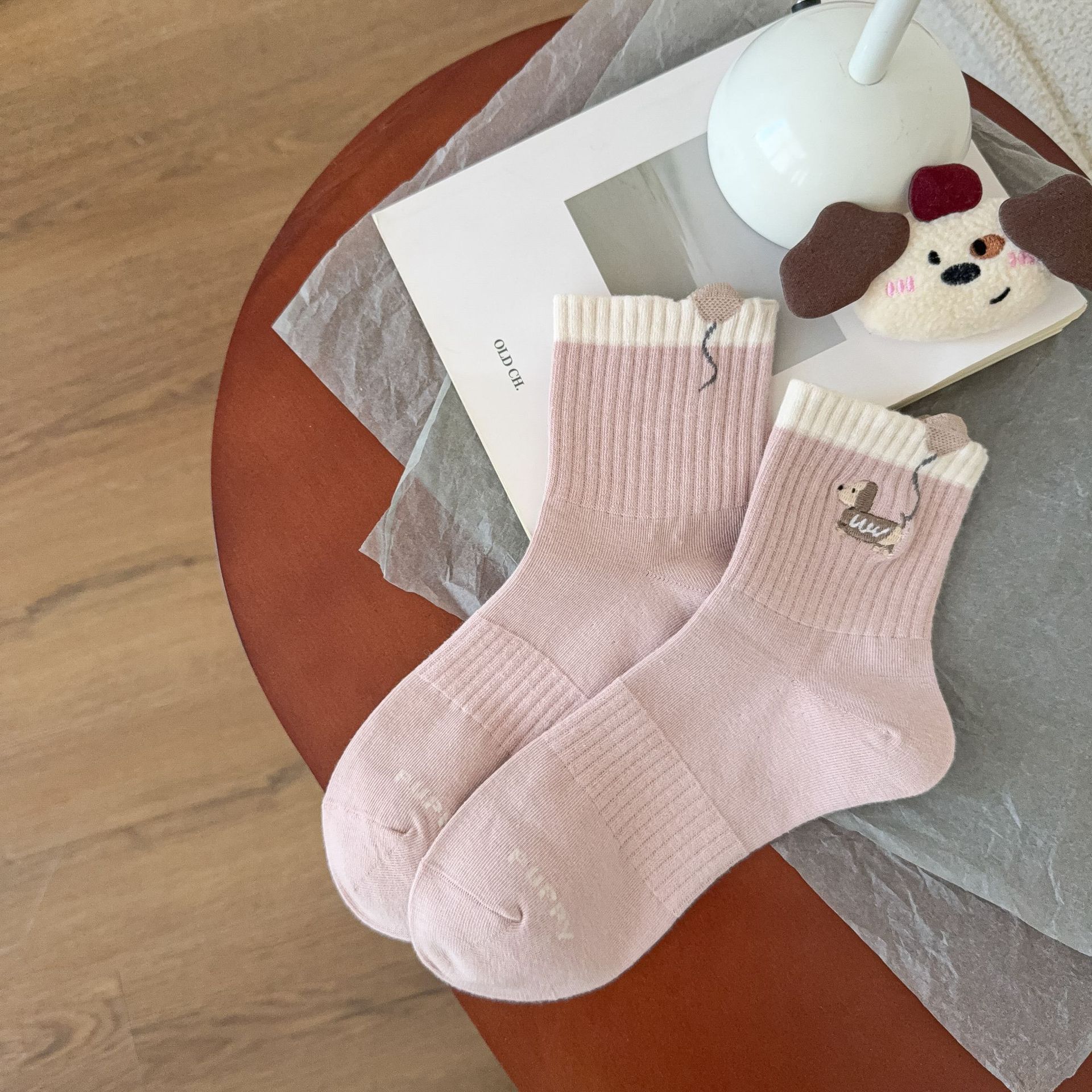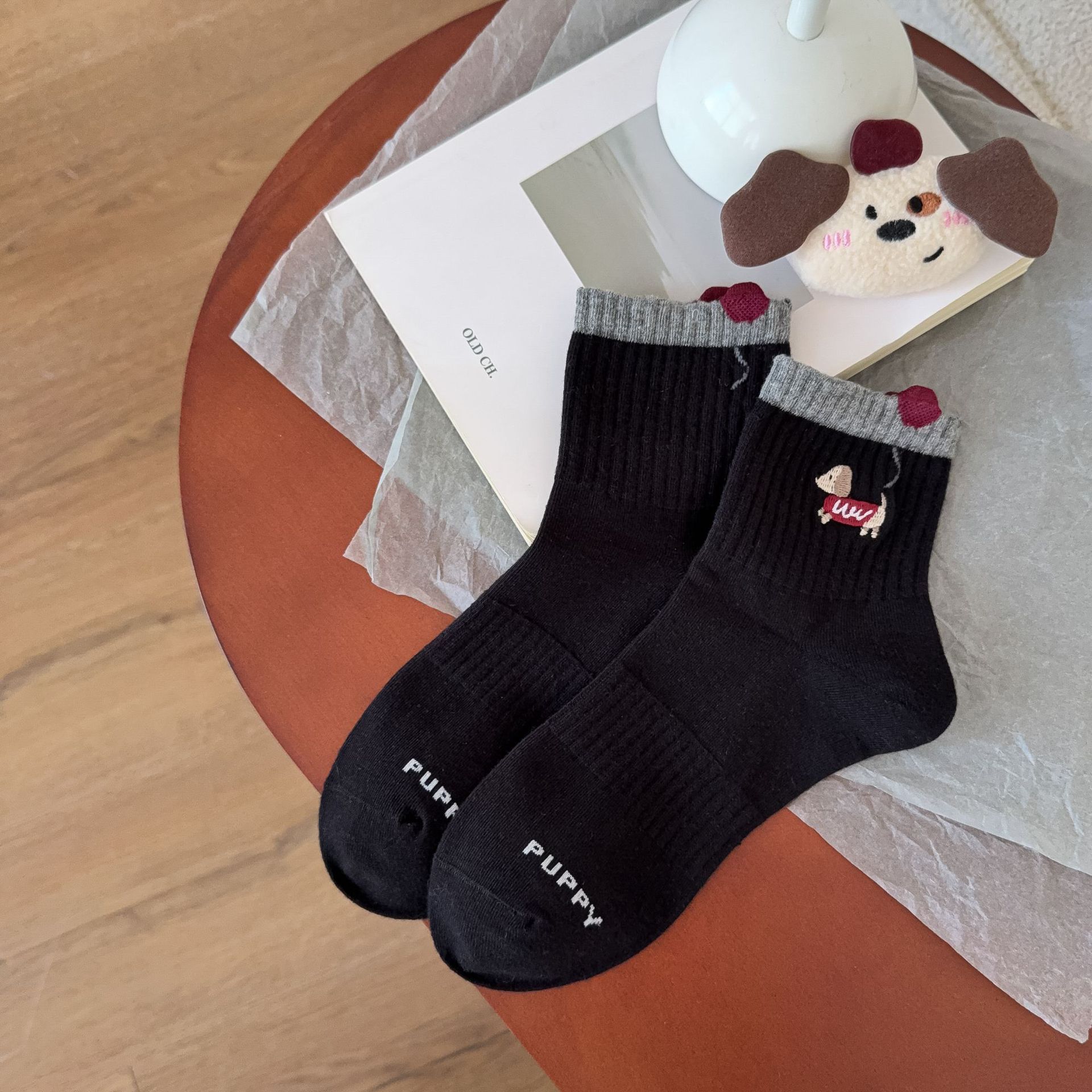 Little Tea Life 25 가을 겨울 양말 여성용 종아리 중간 양말 귀여운 강아지 자수 만화 풍선 다용도 대비 색상 미끄럼 방지